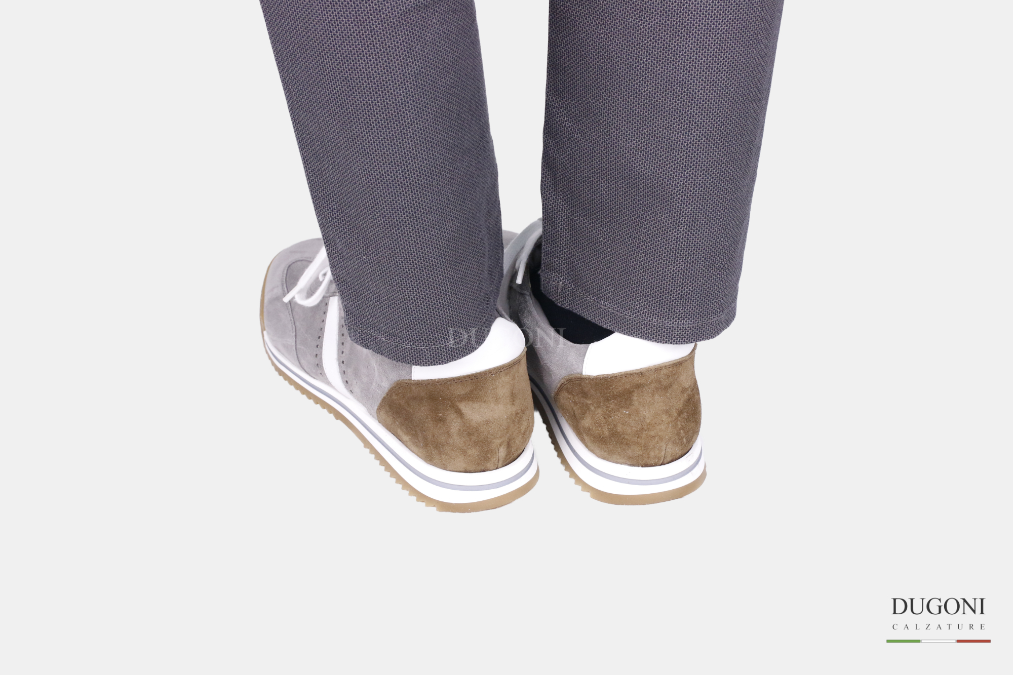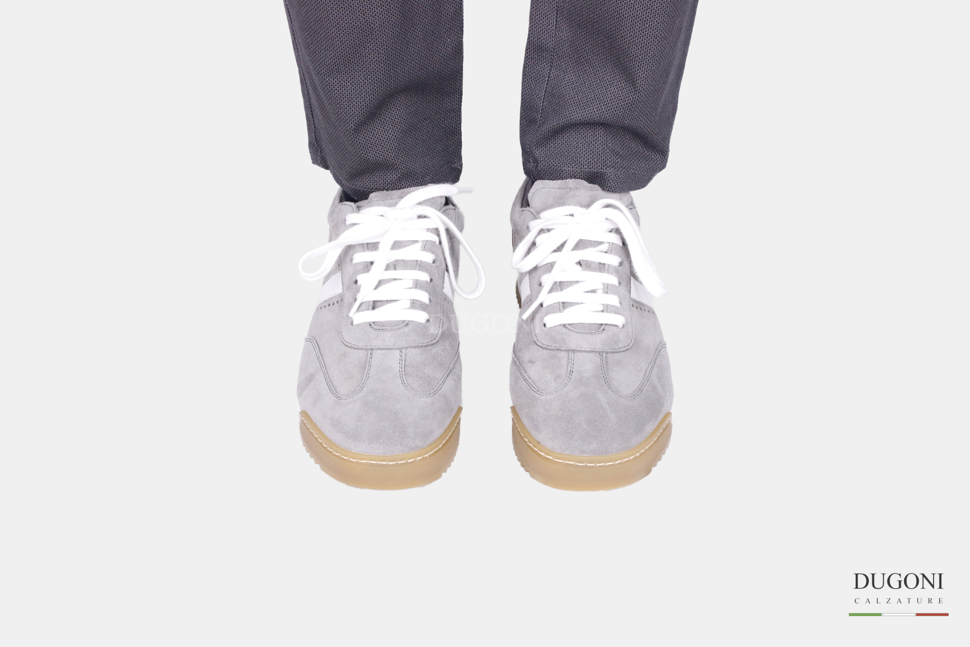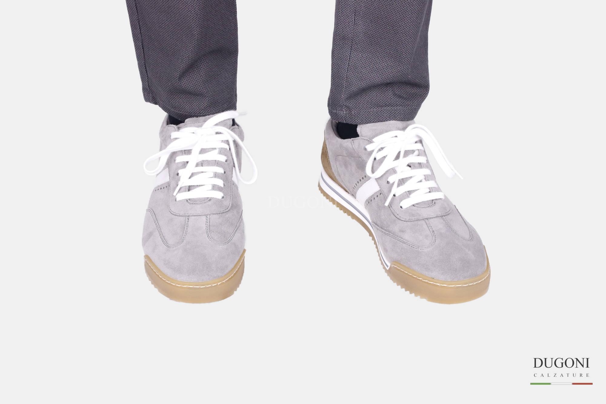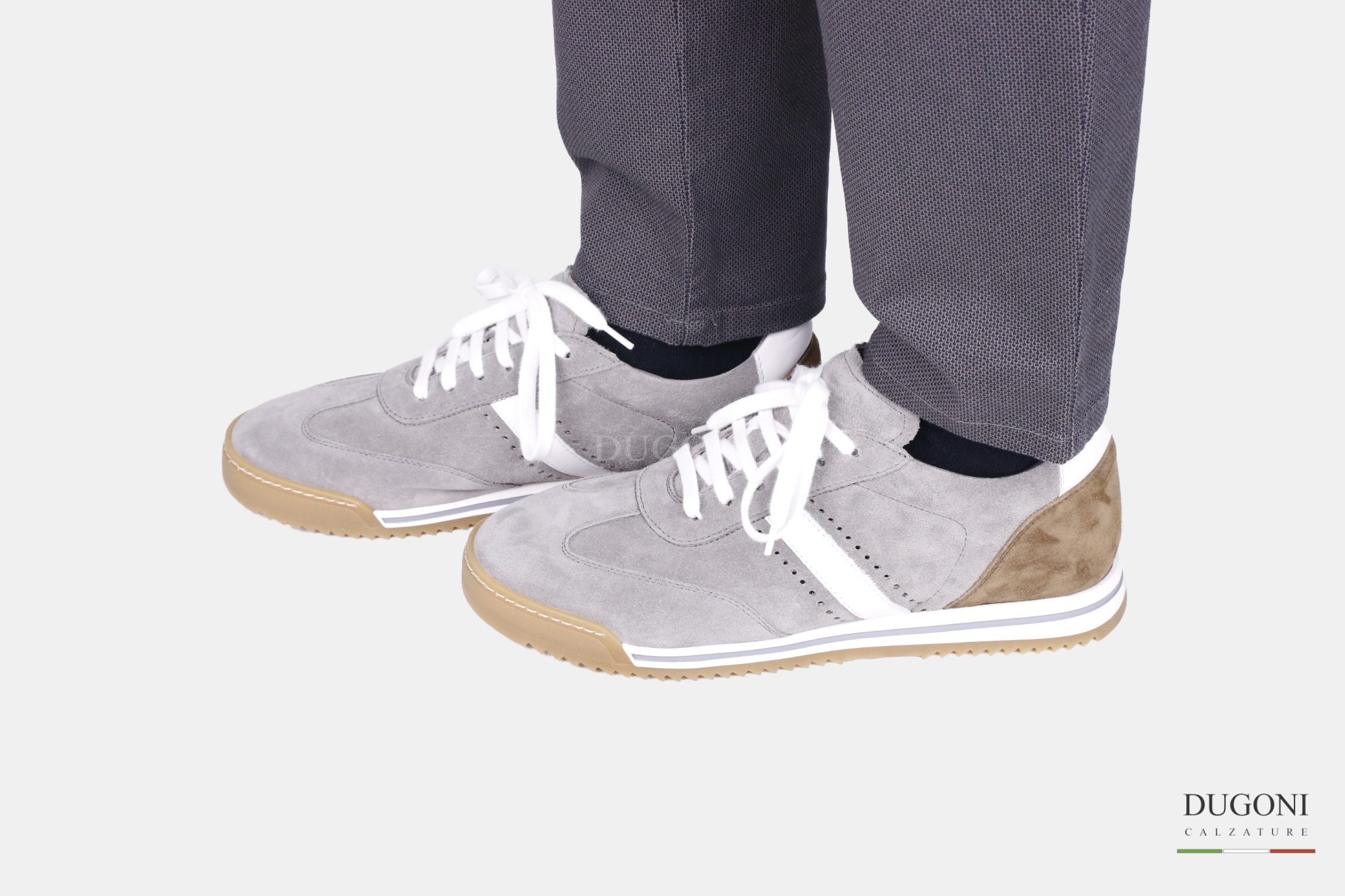 Sneakers stringata in camoscio  grigio. Lacci di colore bianco , disponibili anche in beige. Cuciture in tinta. Plantare estraibile.