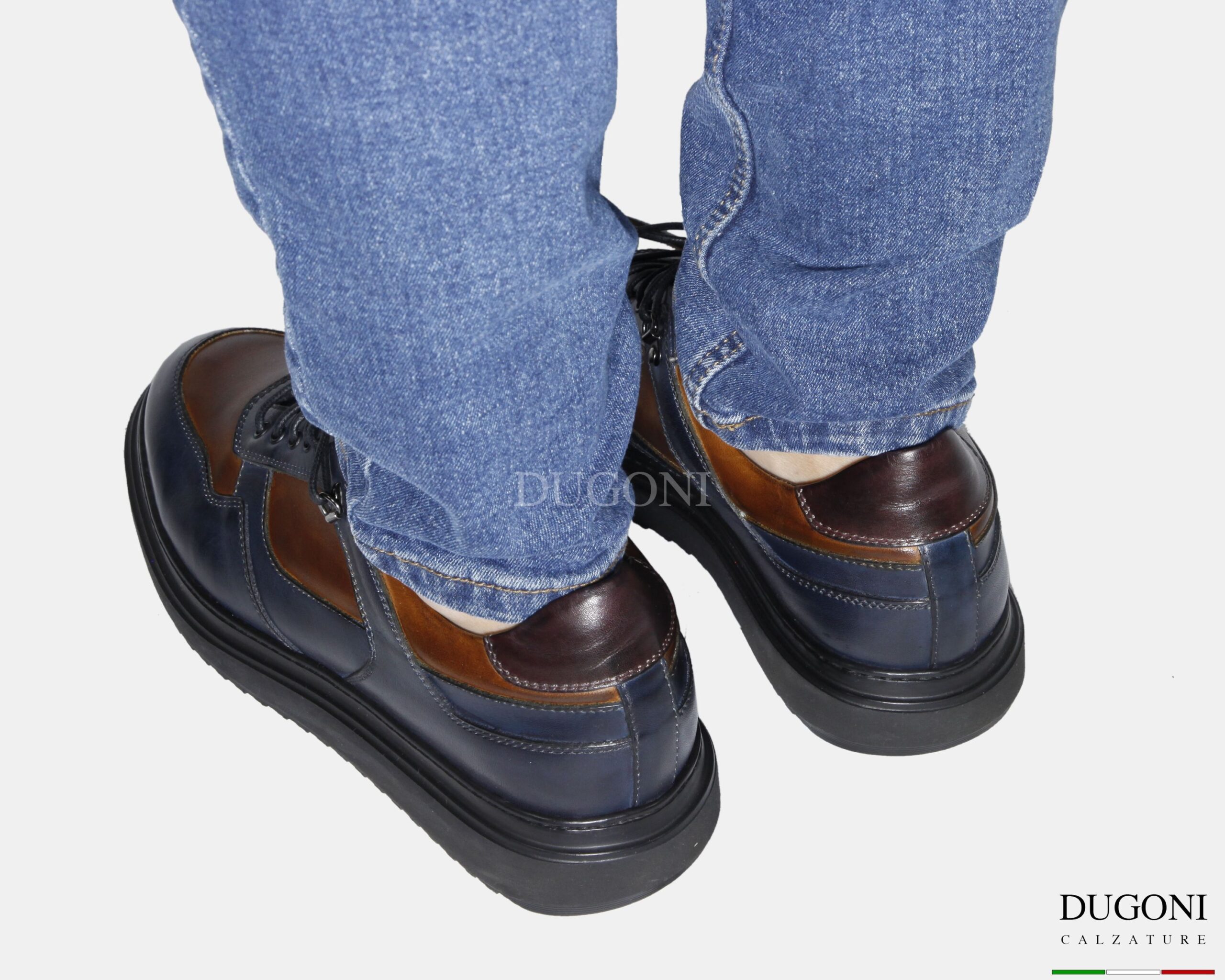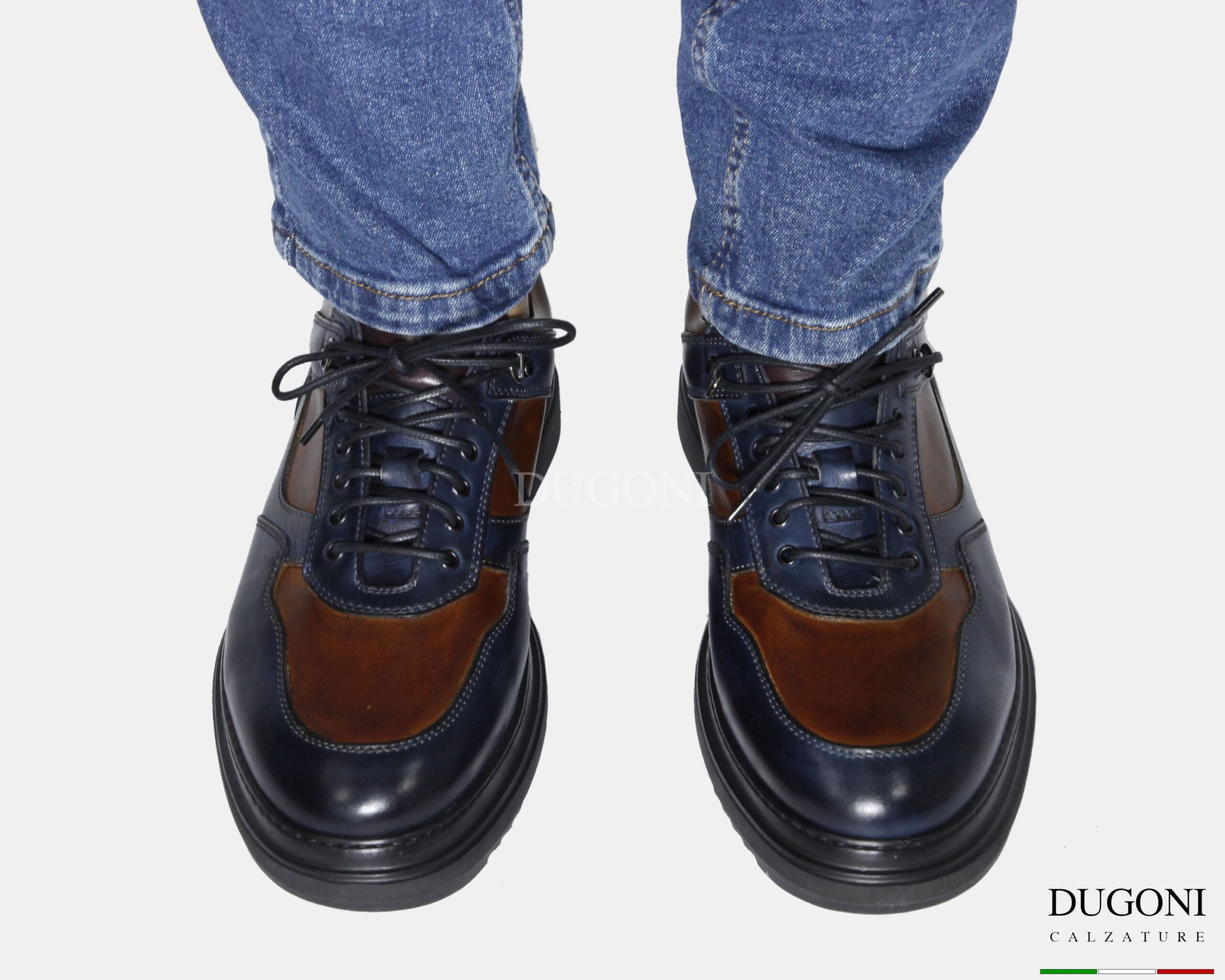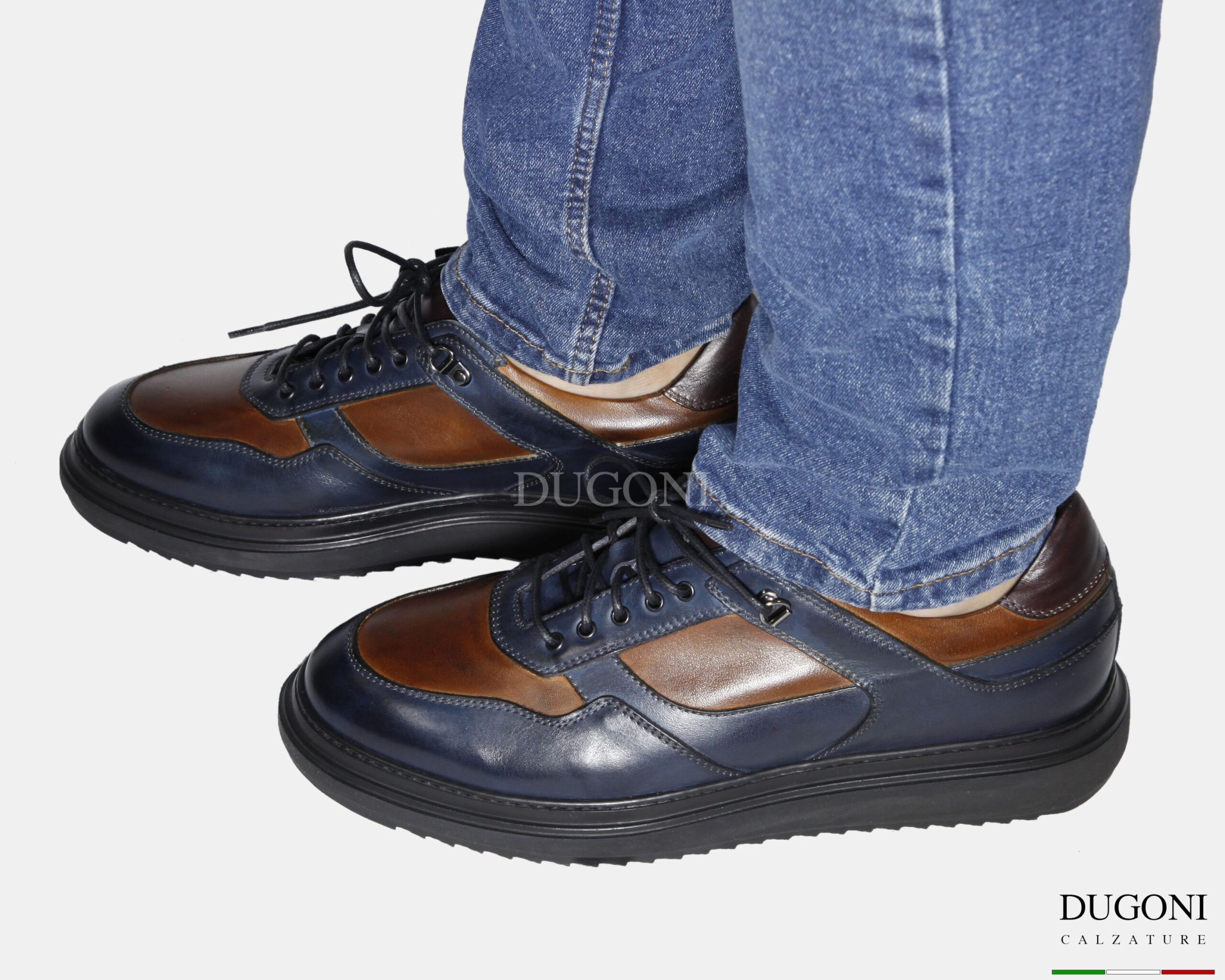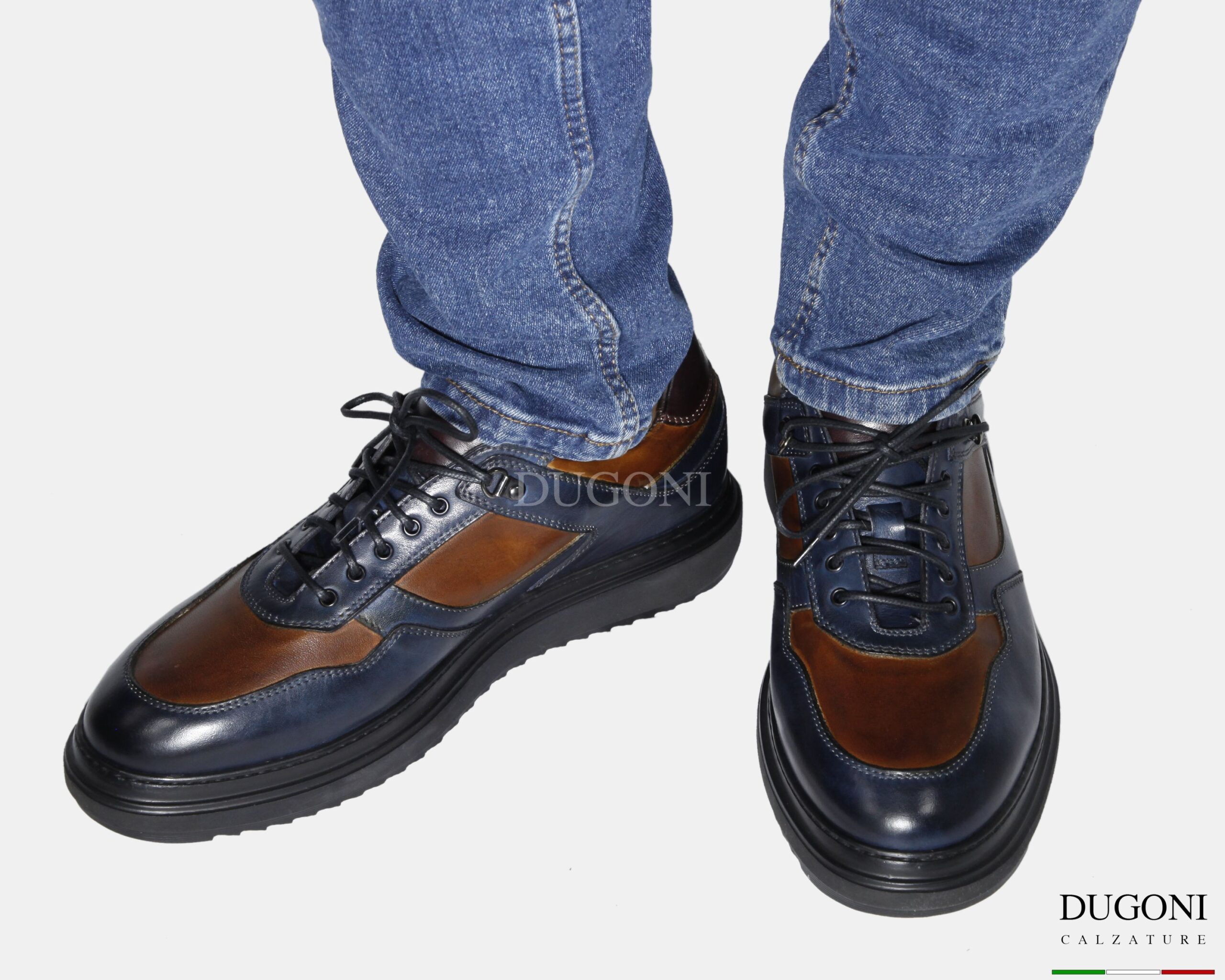 Sneakers in pelle bicolor blu e marrone chiaro  con allacciatura a 5 fori. Plantare estraibile. Fondo a cassetta in gomma .