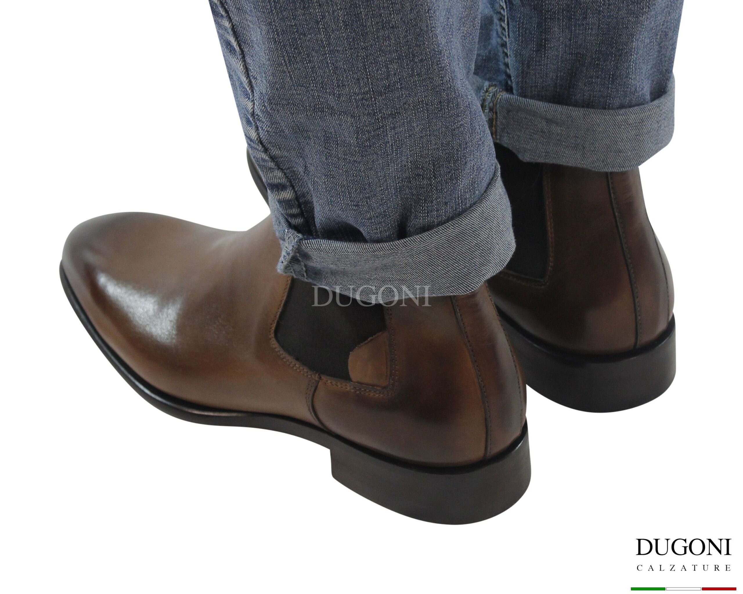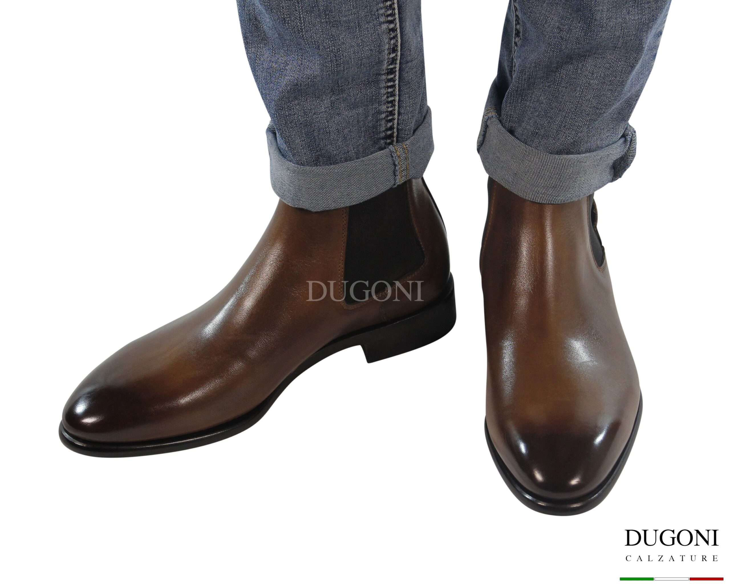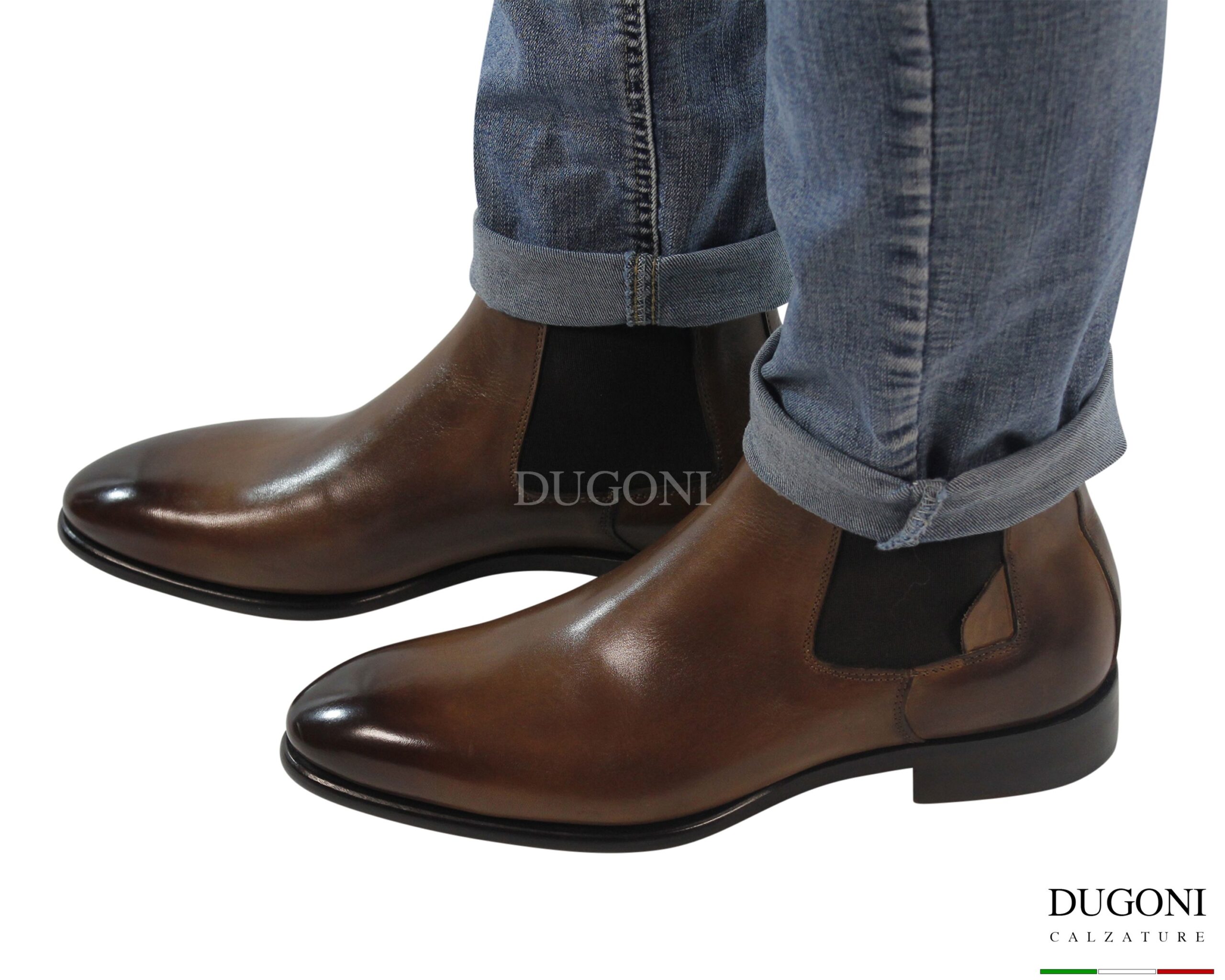 Stivaletto sfilato in pelle marrone chiaro con sfumature brune sulla punta e sul tallone. Modello a 2 elastici in tinta marrone. Suola e tacco in cuoio, con sformatura arrotondata e lucidata. Cuciture in tinta .