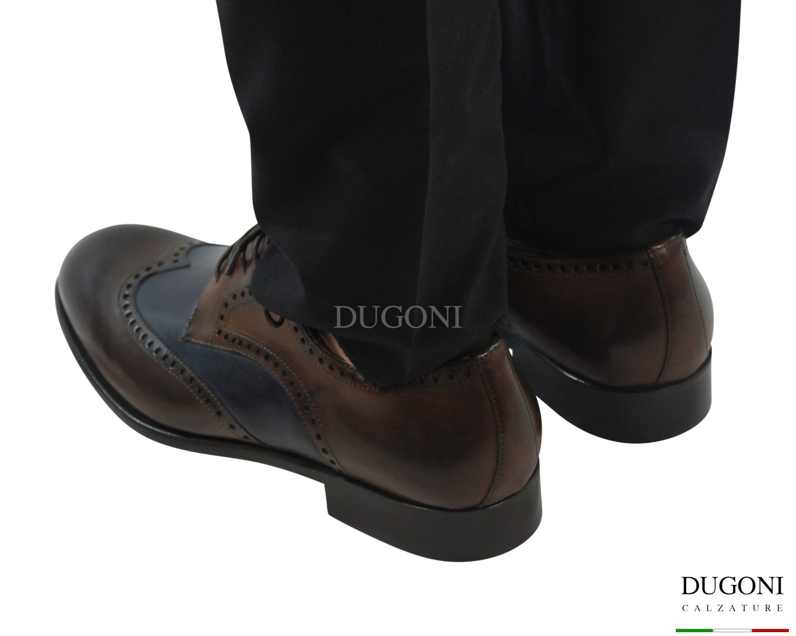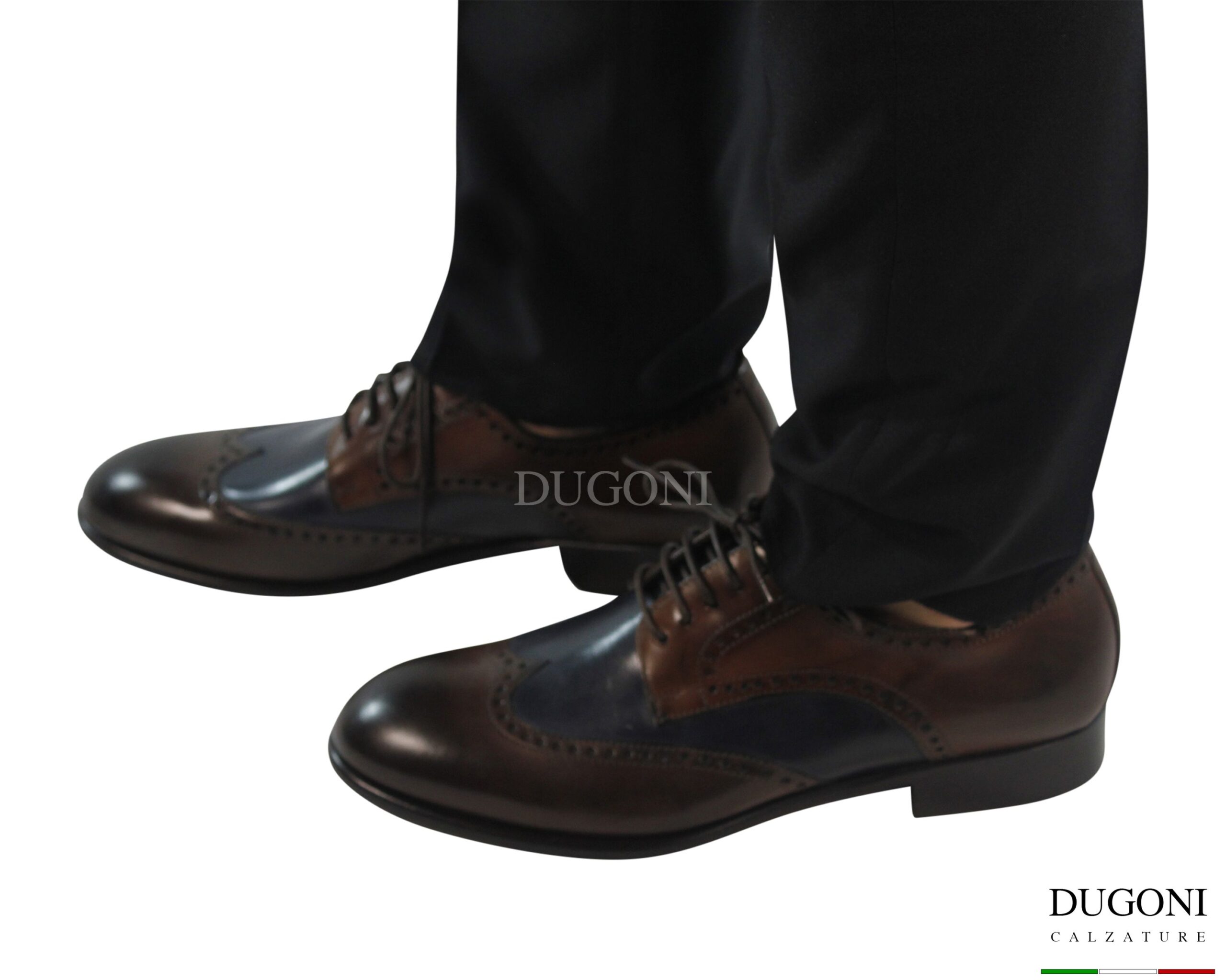 In particolare, per questa calzatura abbiamo utilizzato 2 tinte, il marrone con sfumature chiaro scure e inserito a contrasto il blu, per dare maggior carattere a questa stringata BRECOS.