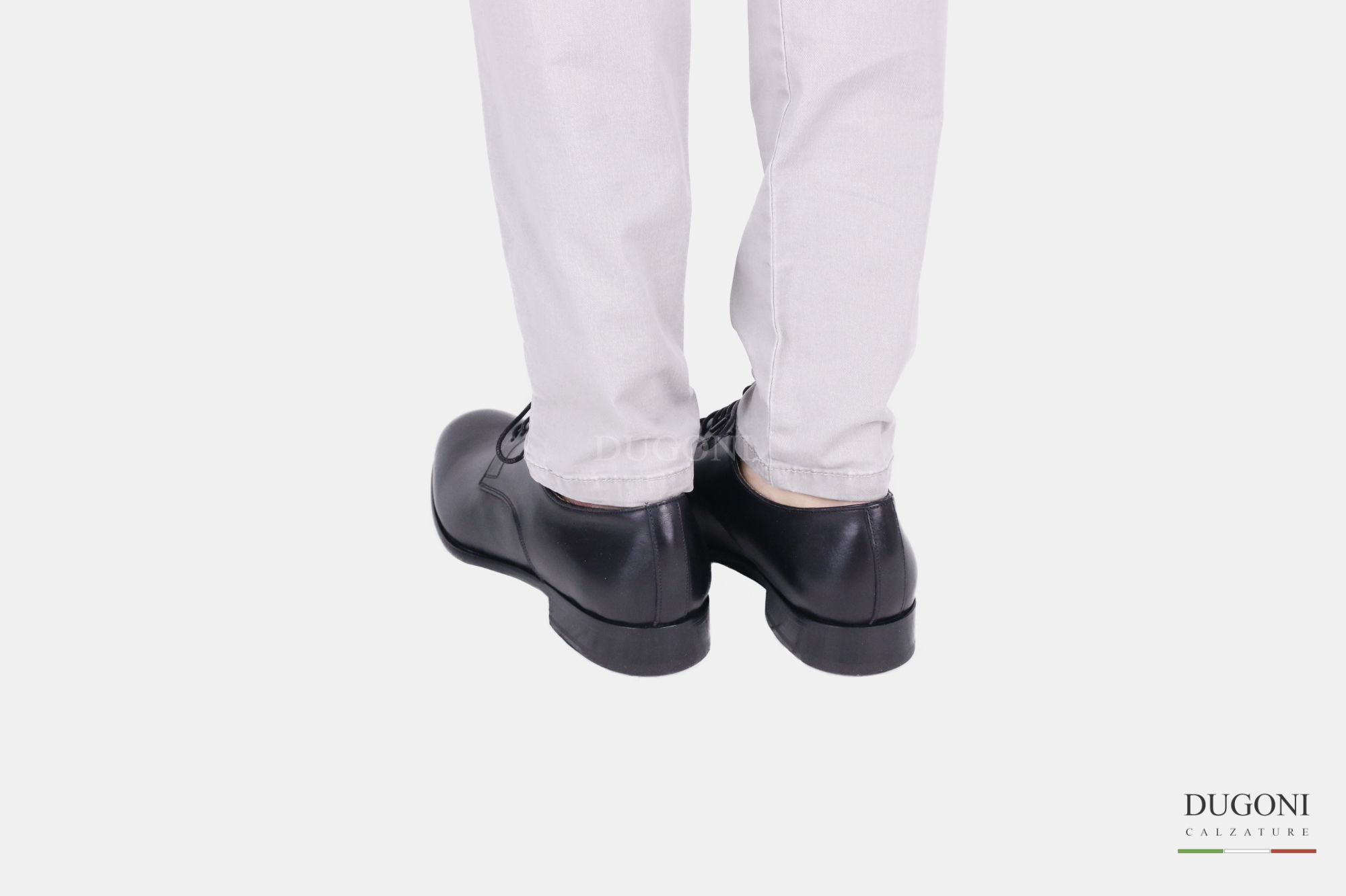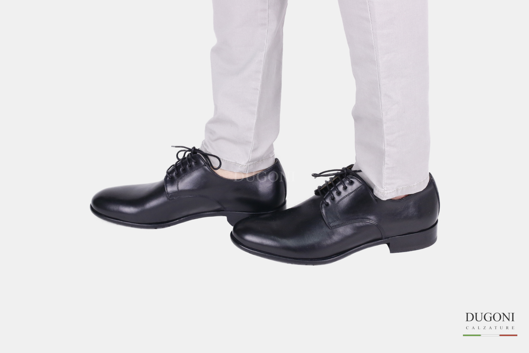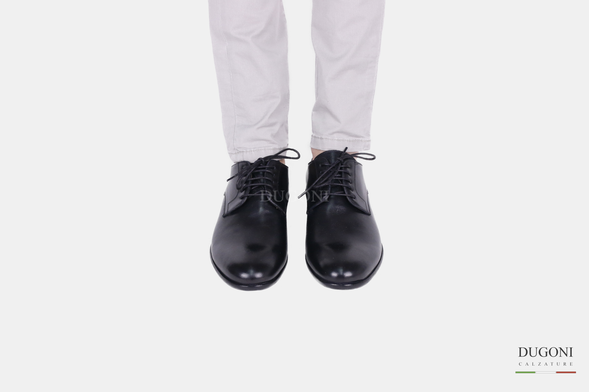 Stringata derby a 5 occhielli, in pelle nera liscia . Cuciture in tinta . Fondo cuoio con antiscivolo.
