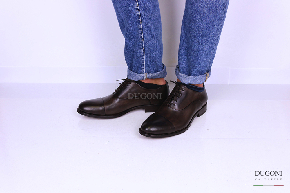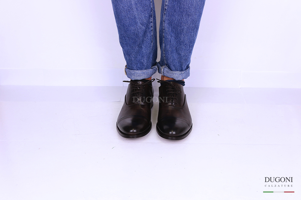 Francesina con puntale in pelle marrone con sfumature. Cuciture rigirate . Suola in cuoio con ovalino gomma antiscivolo.