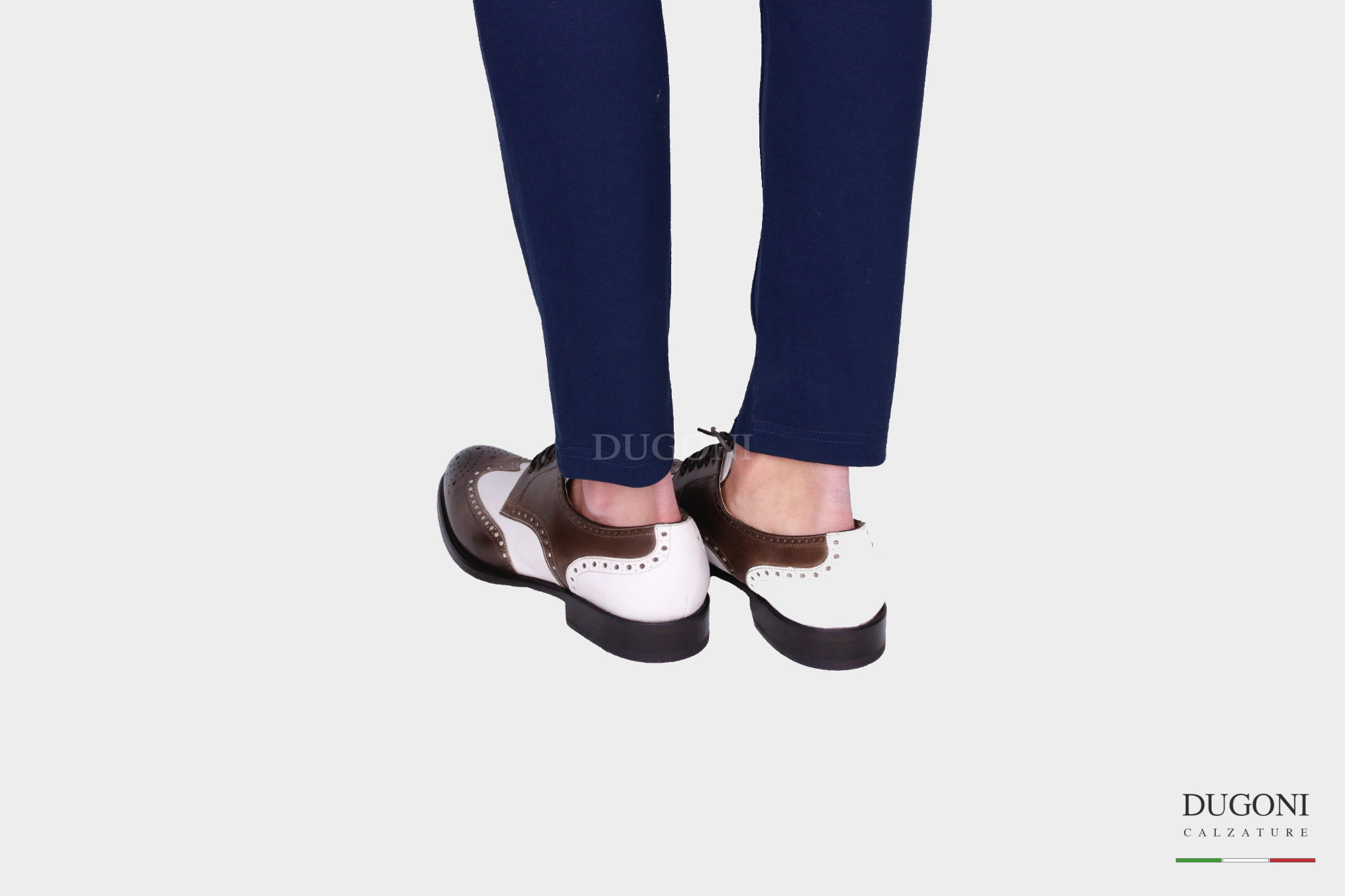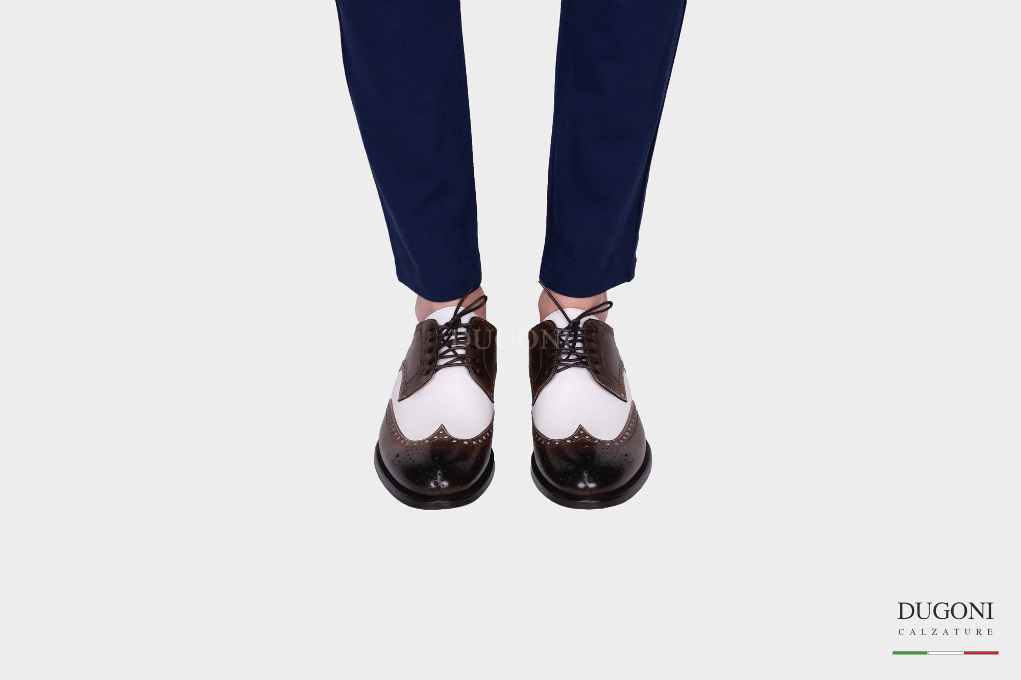Derby  bicolor bianco e marrone. Microforata  a coda di rondine e fiore in punta.  Allacciatura a 5 fori. Suola in cuoio, lavorazione blake , con inserto gomma antiscivolo .