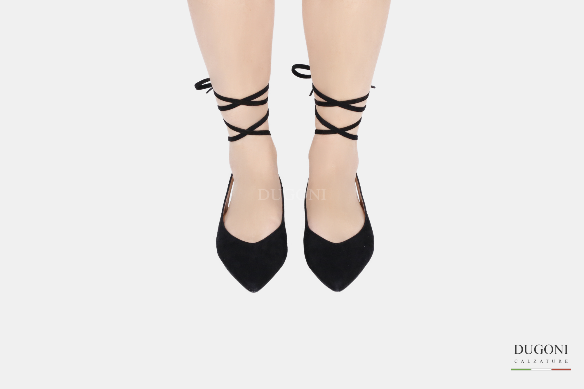 Ballerina in pelle scamosciata nera con lacci incrociati alla caviglia.