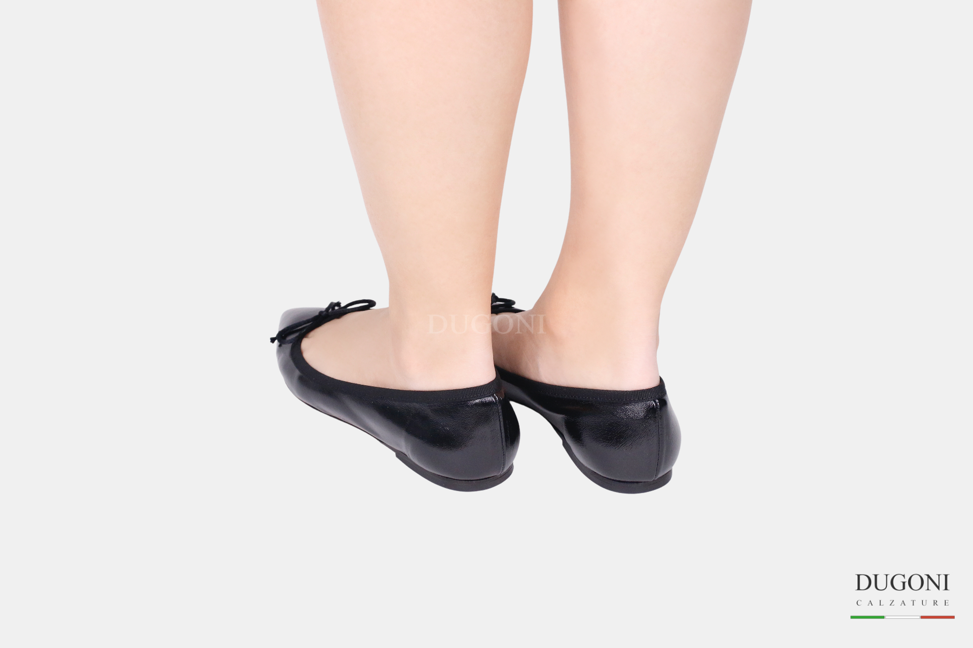 Ballerina sfilata in pelle verlux nera, sfoderata. Profilo in gros grain e nastro in raso in tinta. Il materiale verlux è una pelle leggermente lucida e morbidissima.