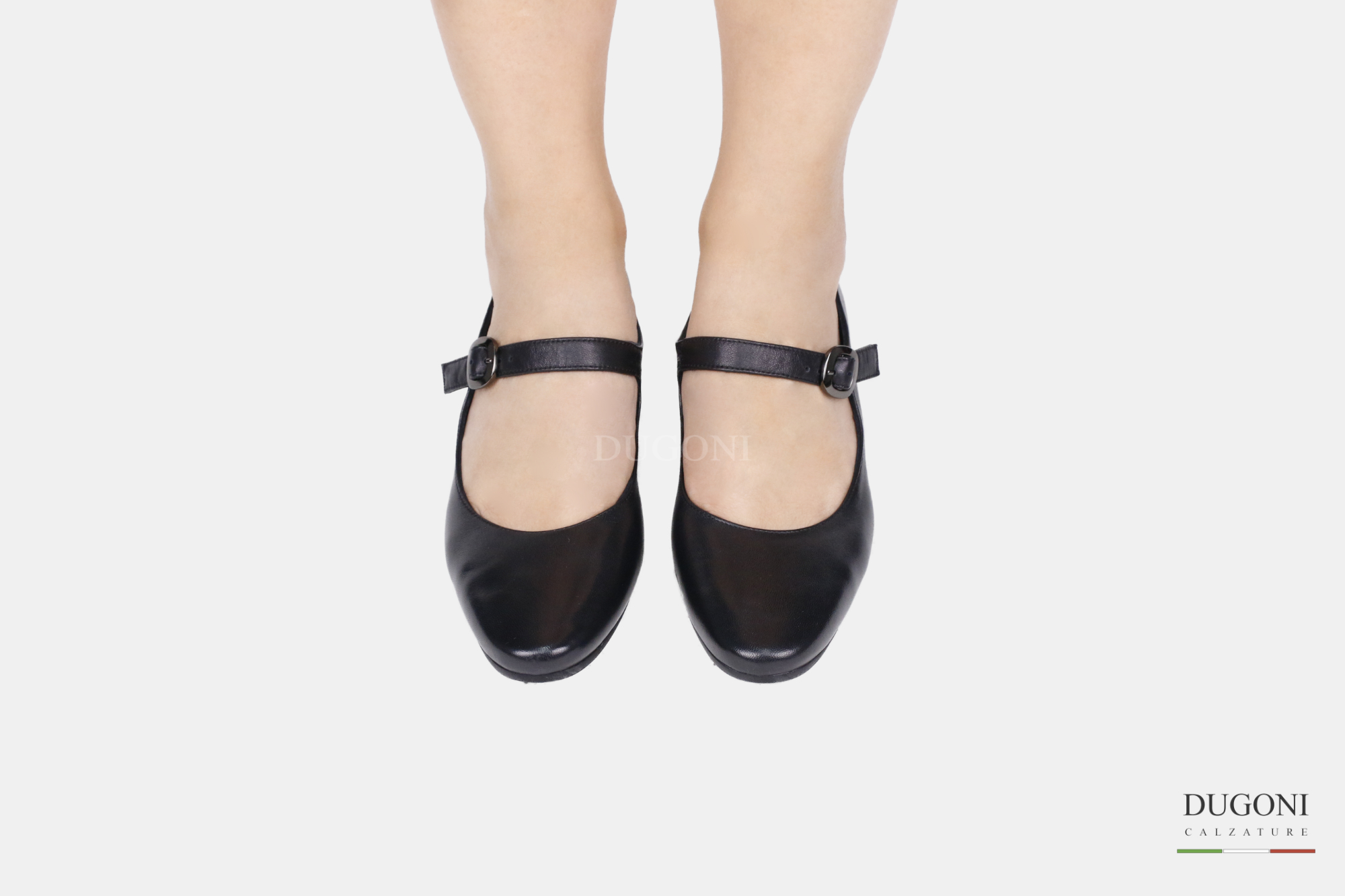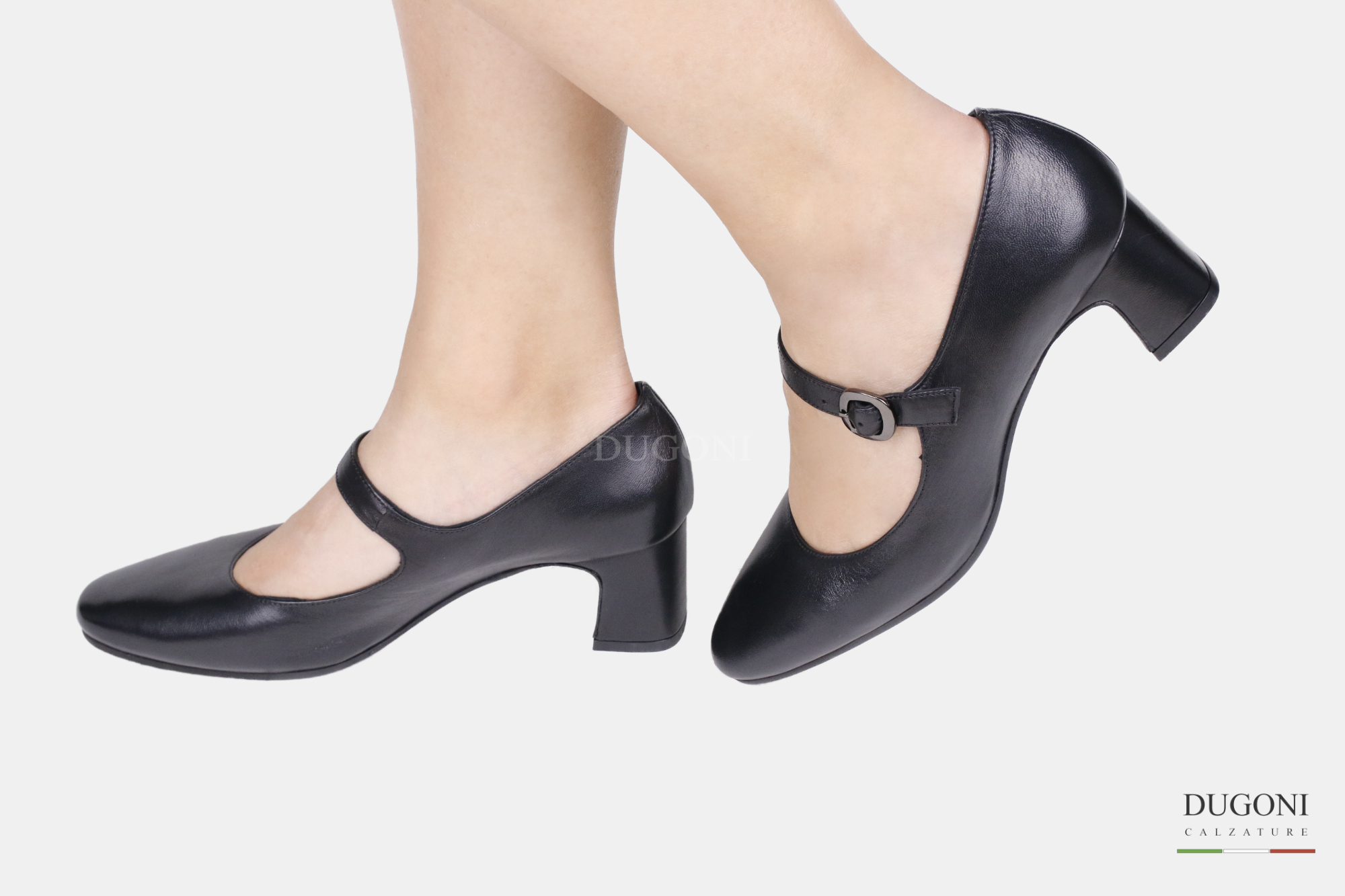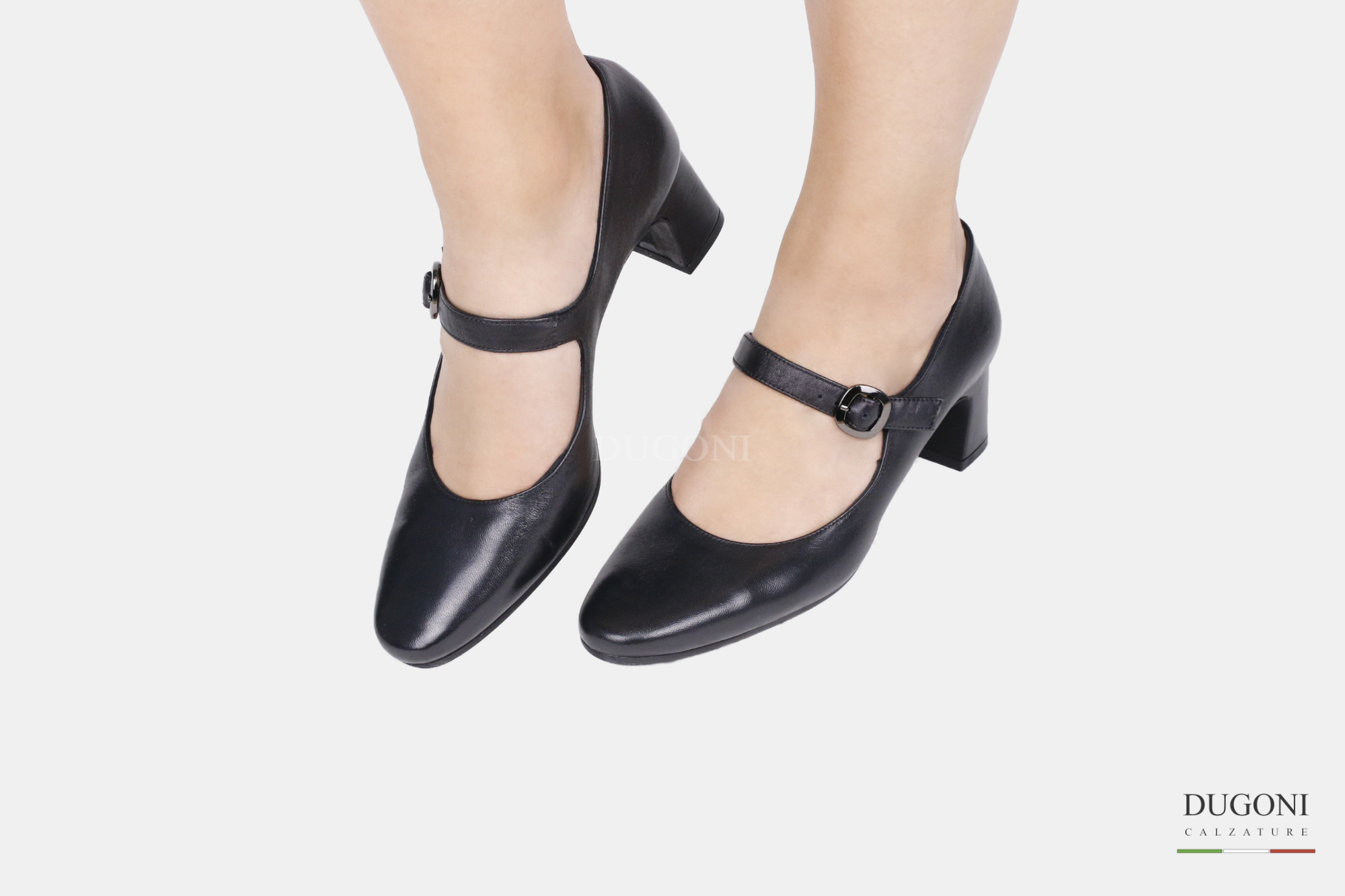 Mary Jane in pelle nera, *lavorazione a sacchetto . Suola in gomma, tacco a coda ricoperto in tinta.