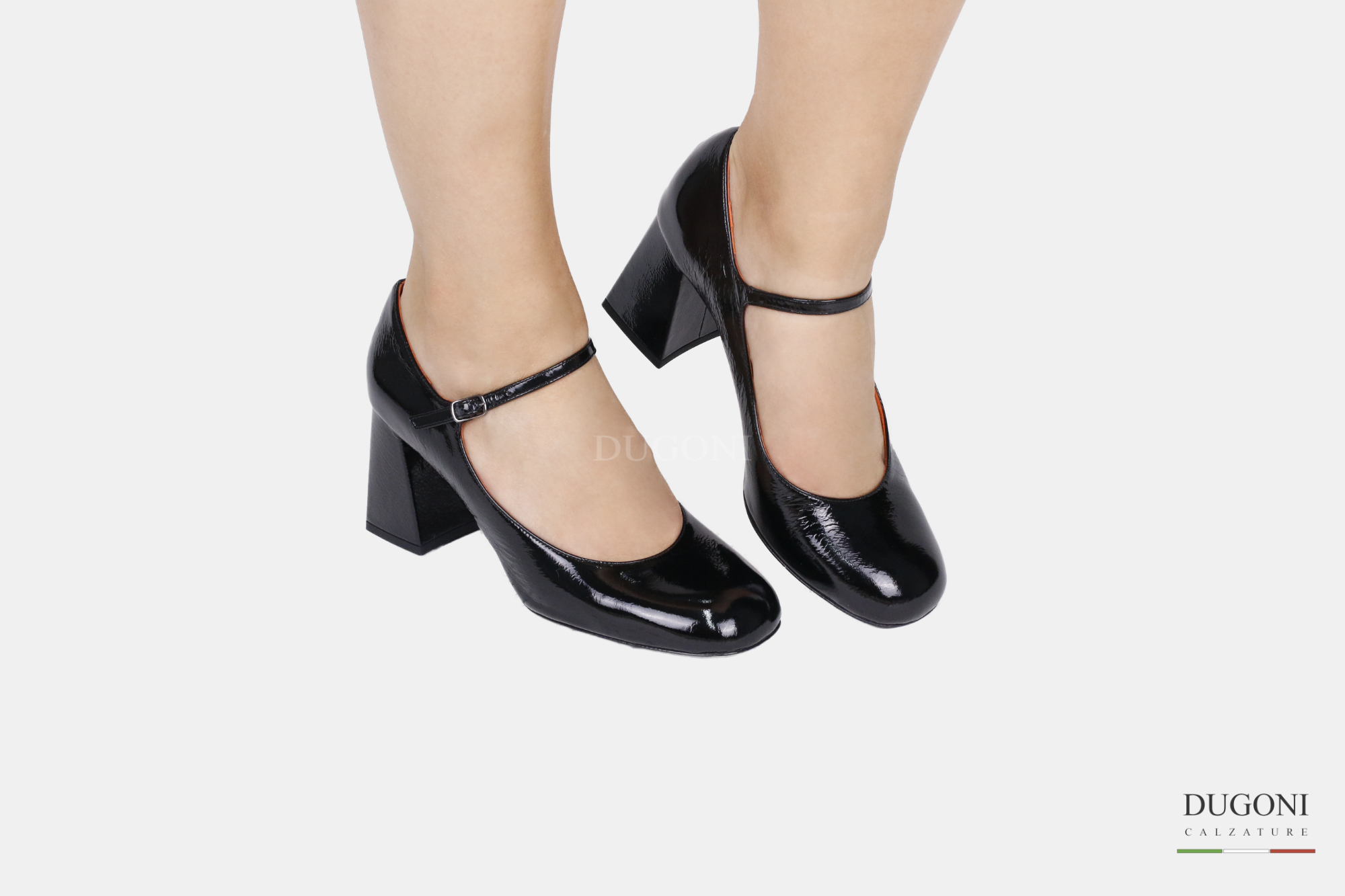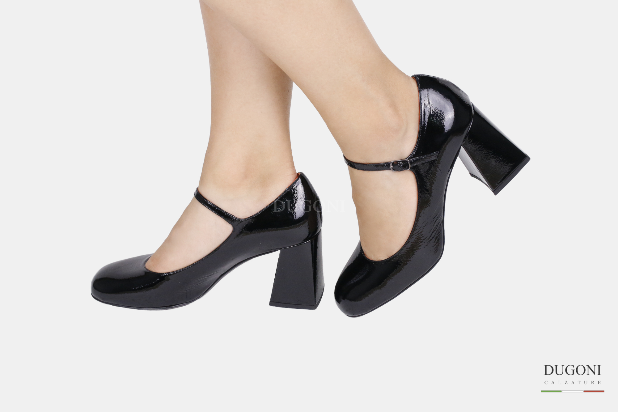 Mary Jane in naplak nera con tacco svasato. Suola in cuoio con ovalino gomma antiscivolo.