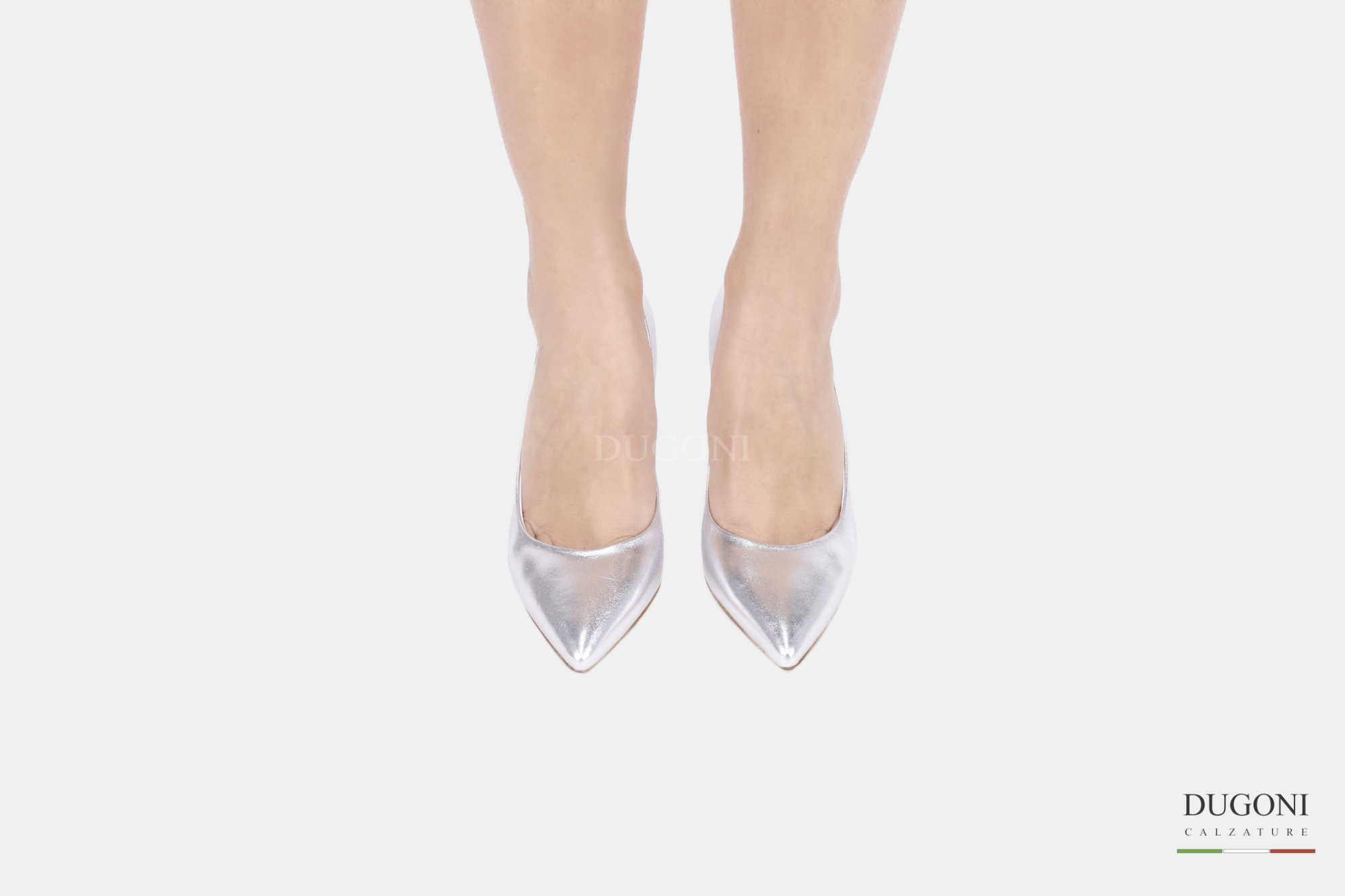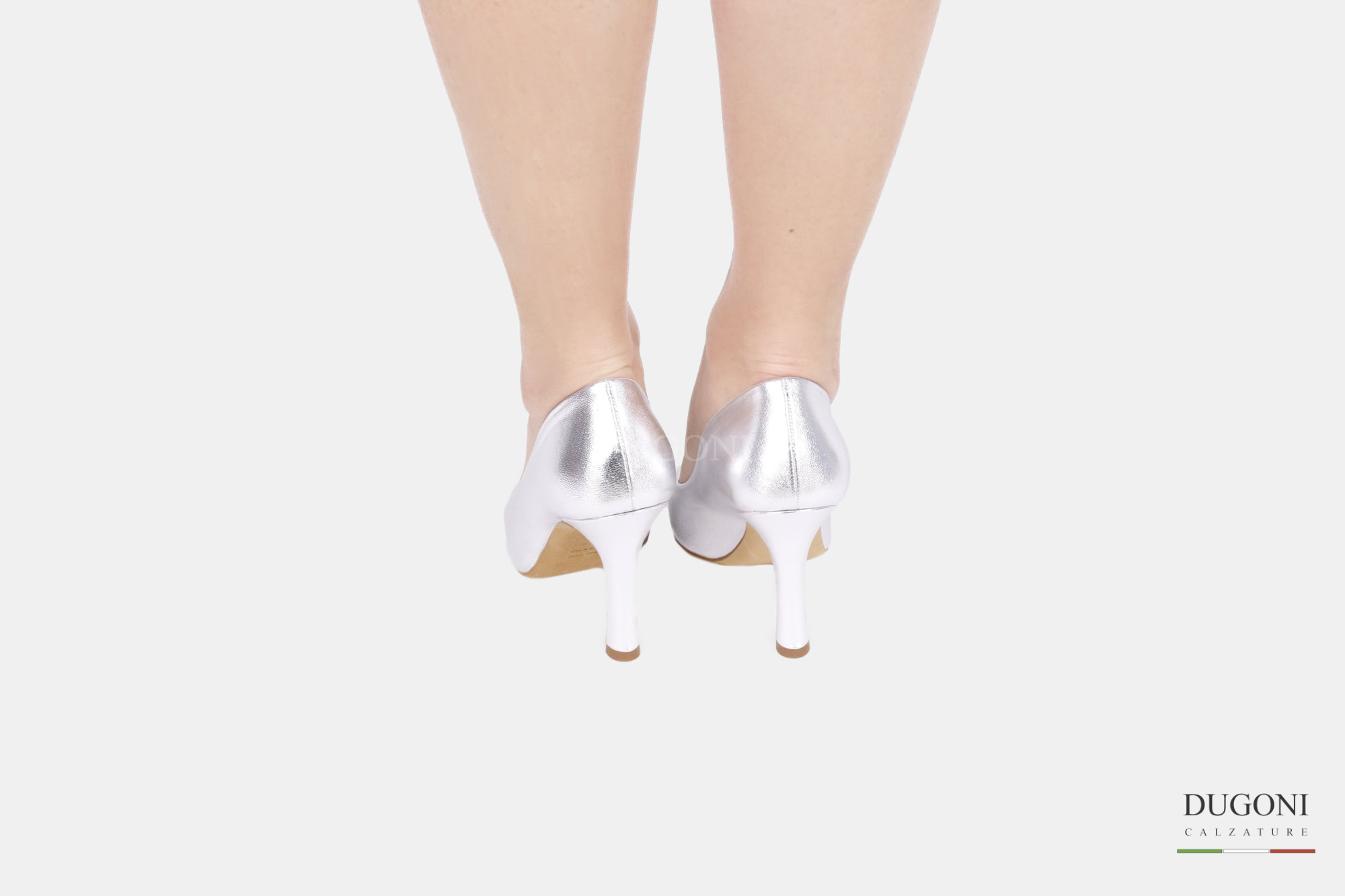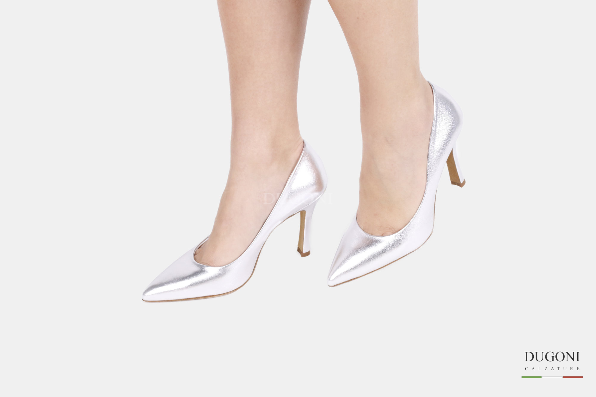 Décolleté sfilato in pelle morbida colore argento. Tacco a coda.