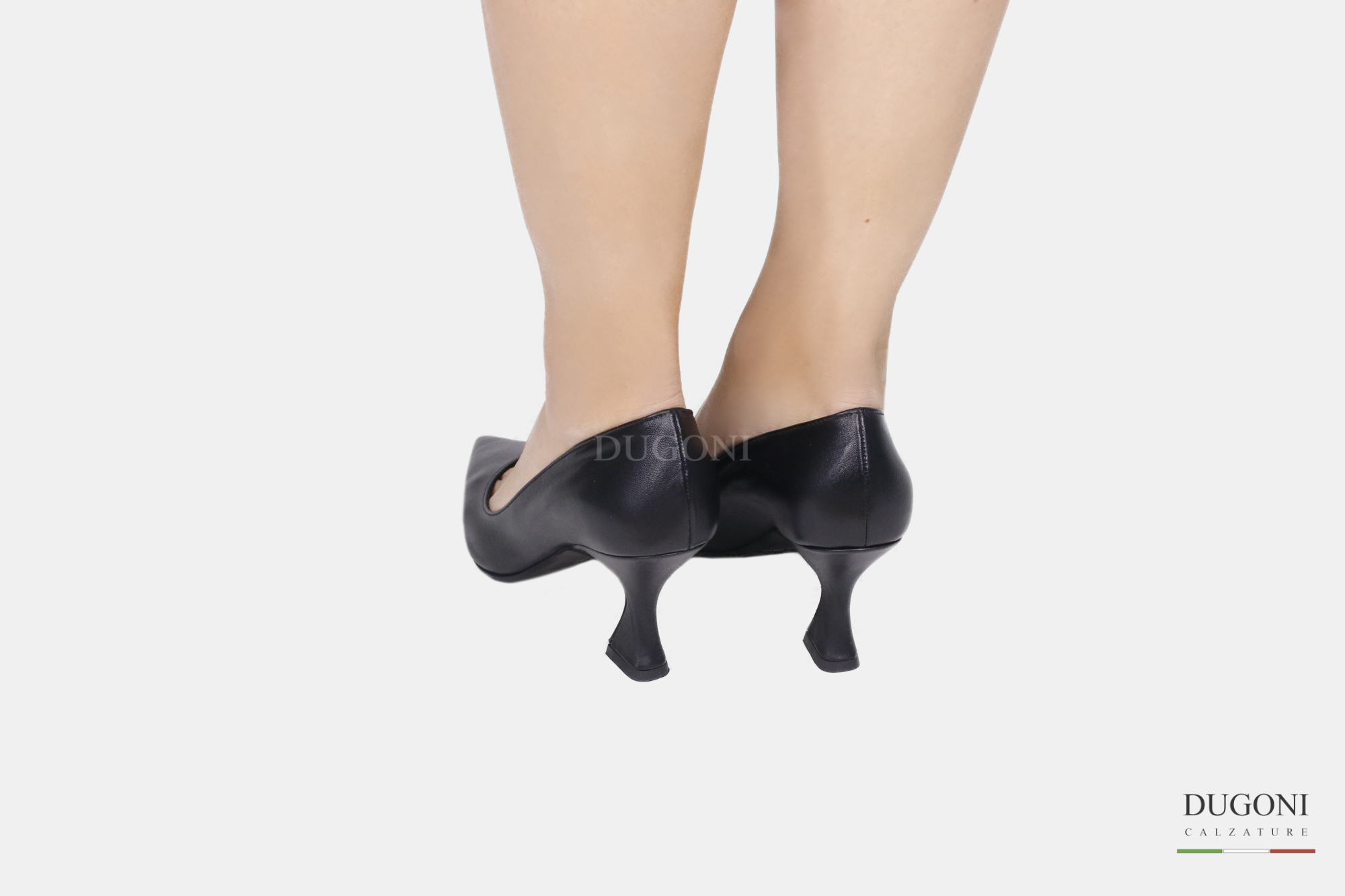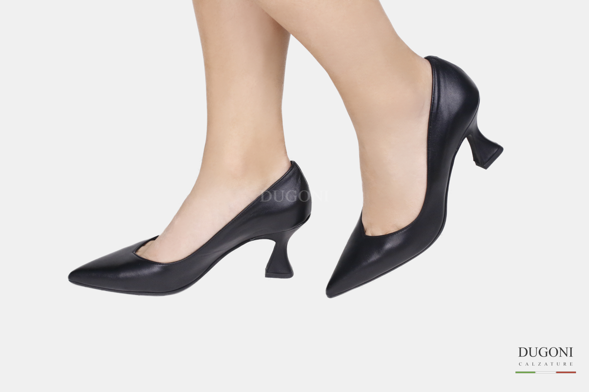 Décolleté sfilato in pelle nera con scollatura a cuore. Tacco a rocchetto. Suola in gomma