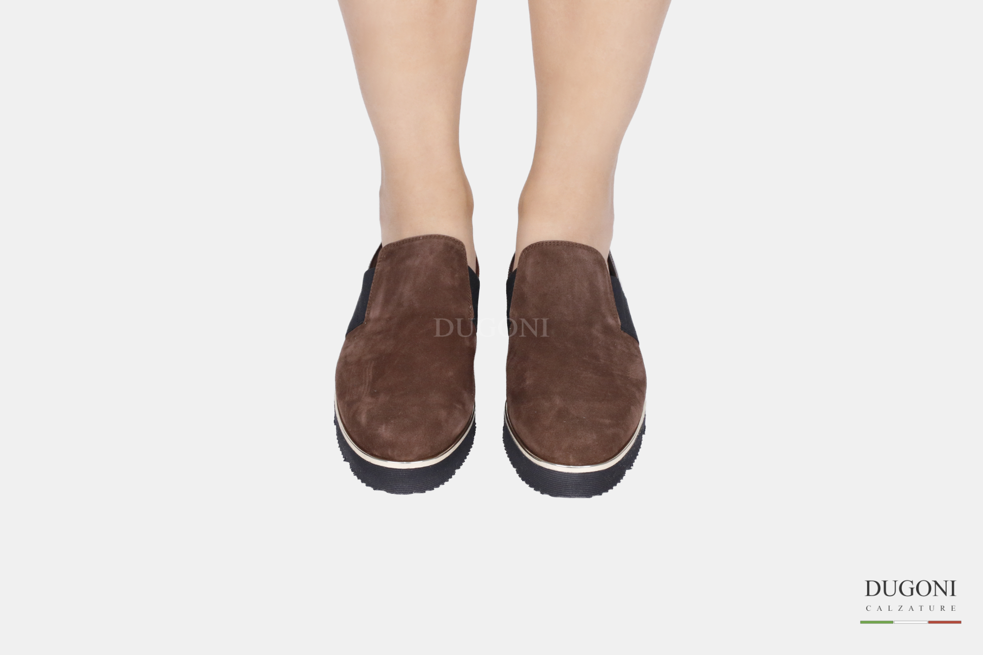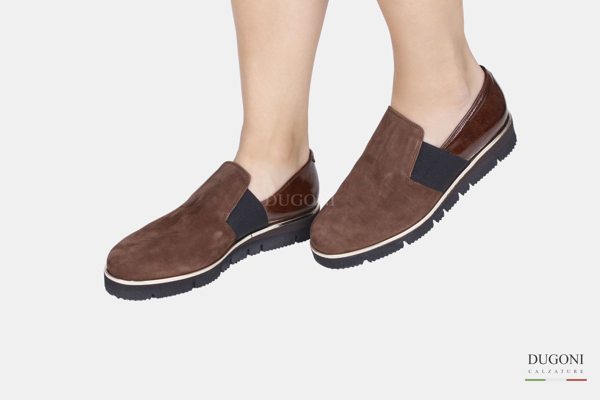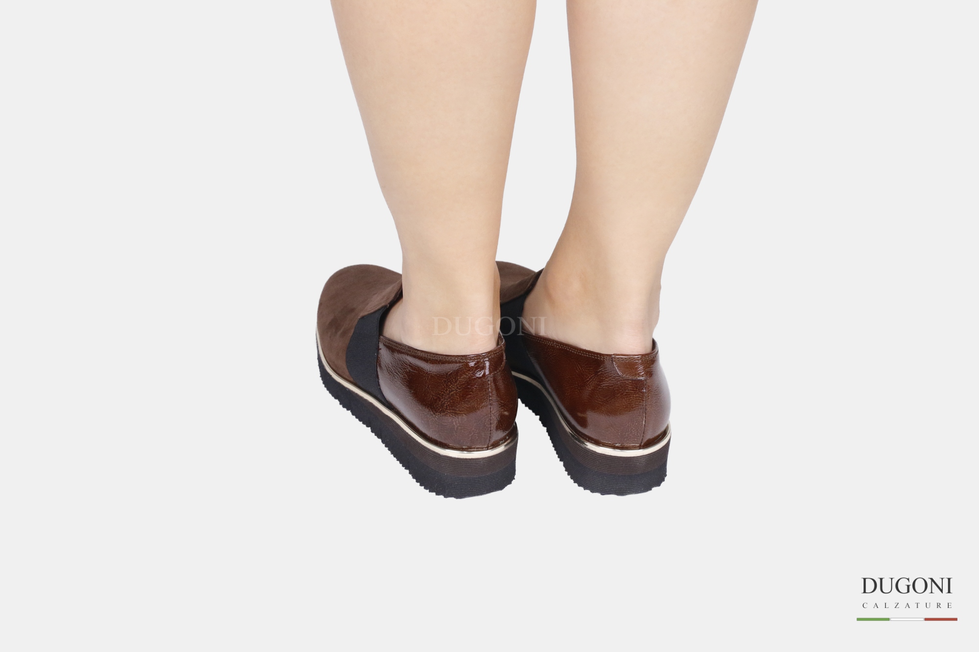 Mocassino in camoscio marrone e vernice in tinta, con elastico nero . Zeppa in gomma morbida con profilo d’orato.