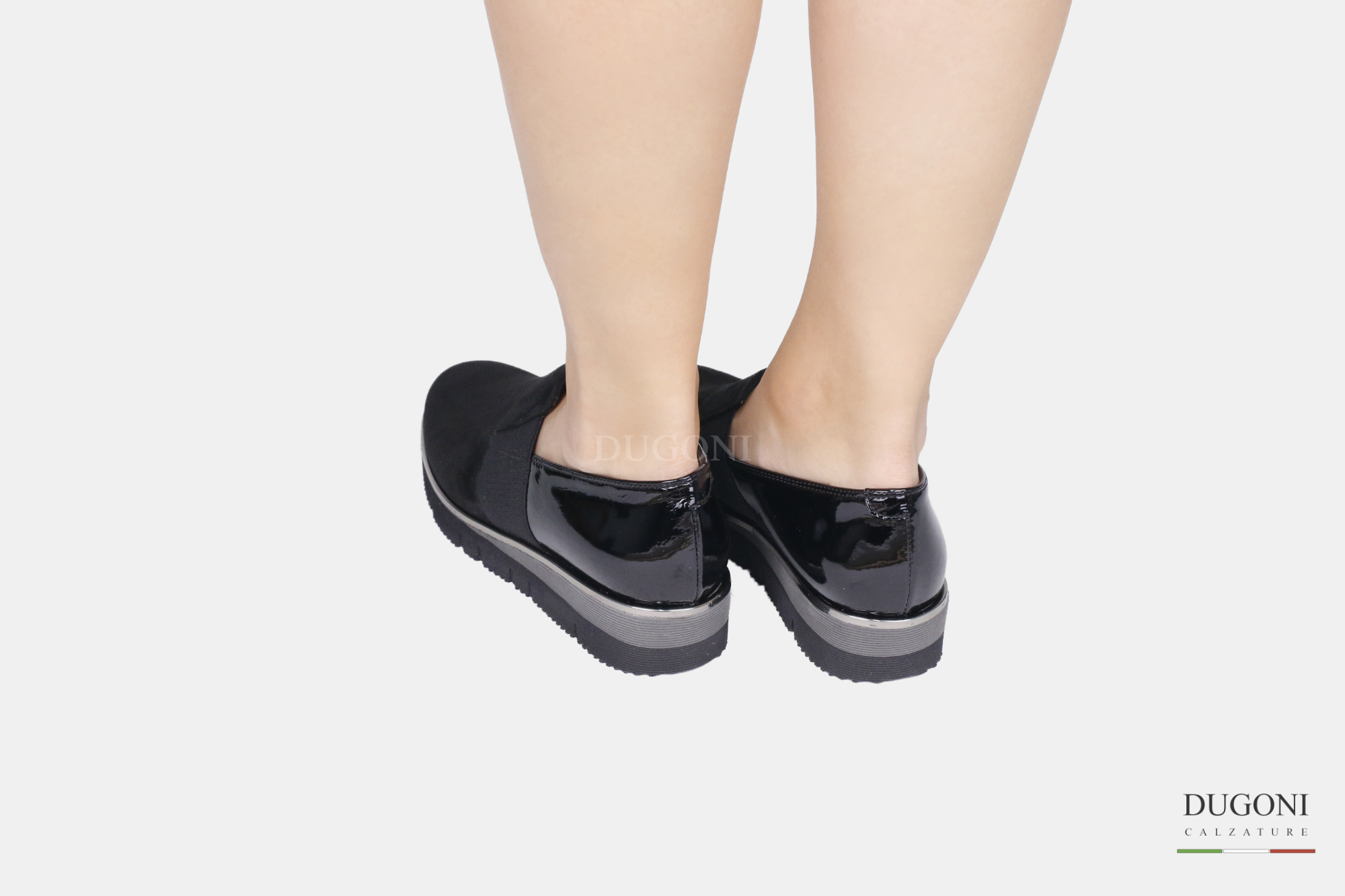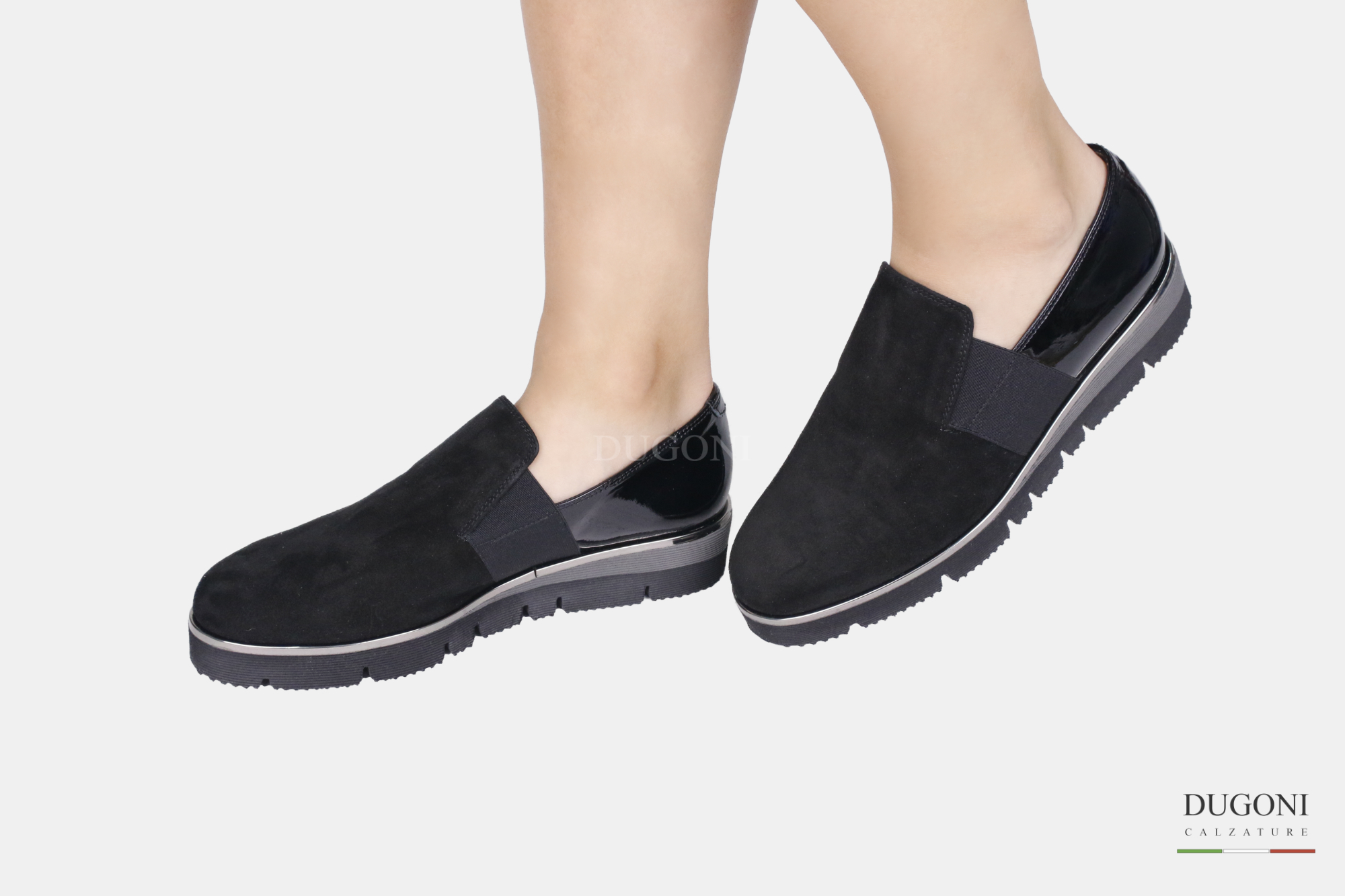 Mocassino in camoscio nero e vernice, con elastico. Zeppa in gomma morbida con profilo cromato.