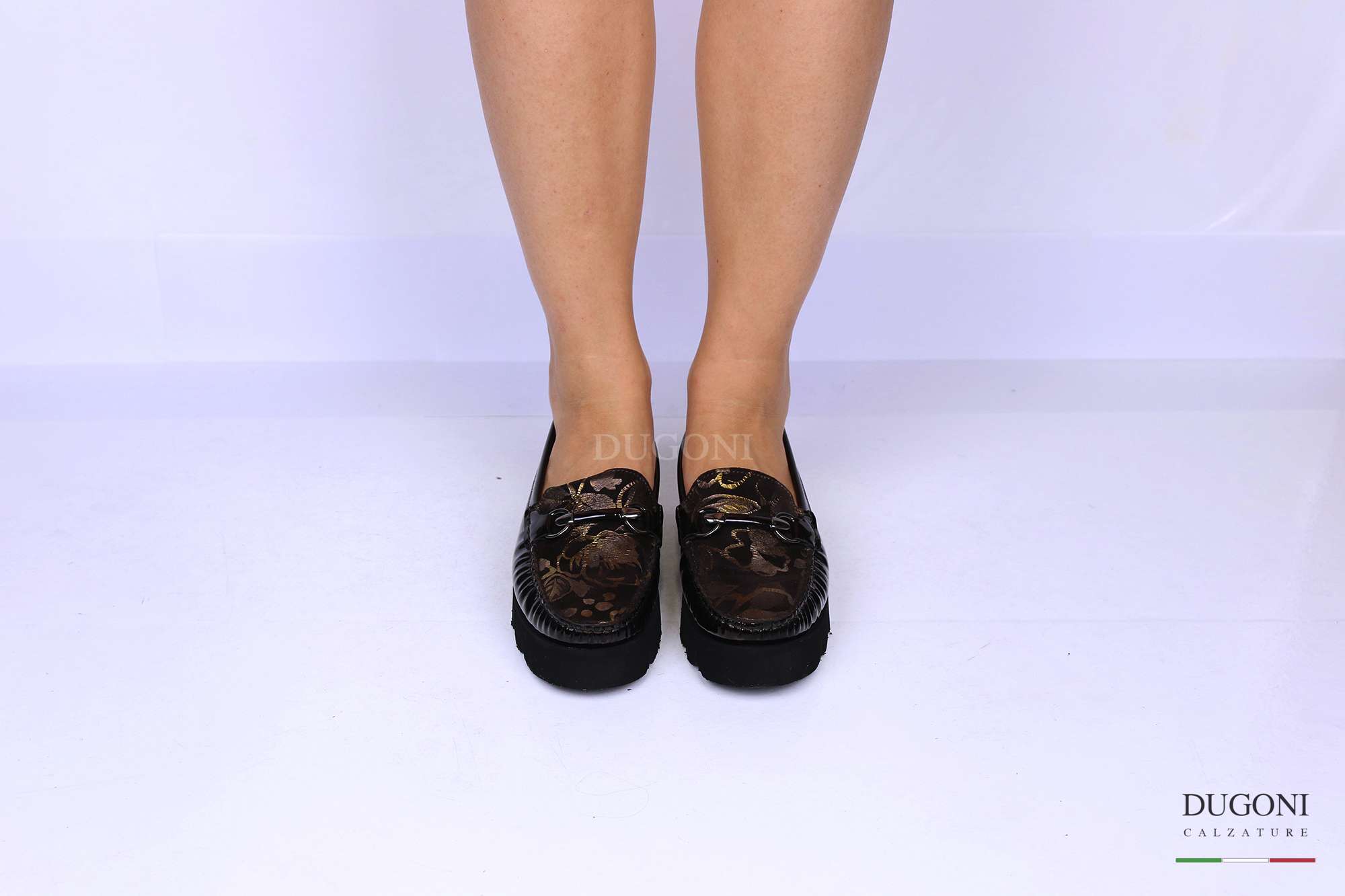Mocassino in vernice marrone con parte superiore in velluto damascato. Morsetto argento. Suola carrarmato in extralight.