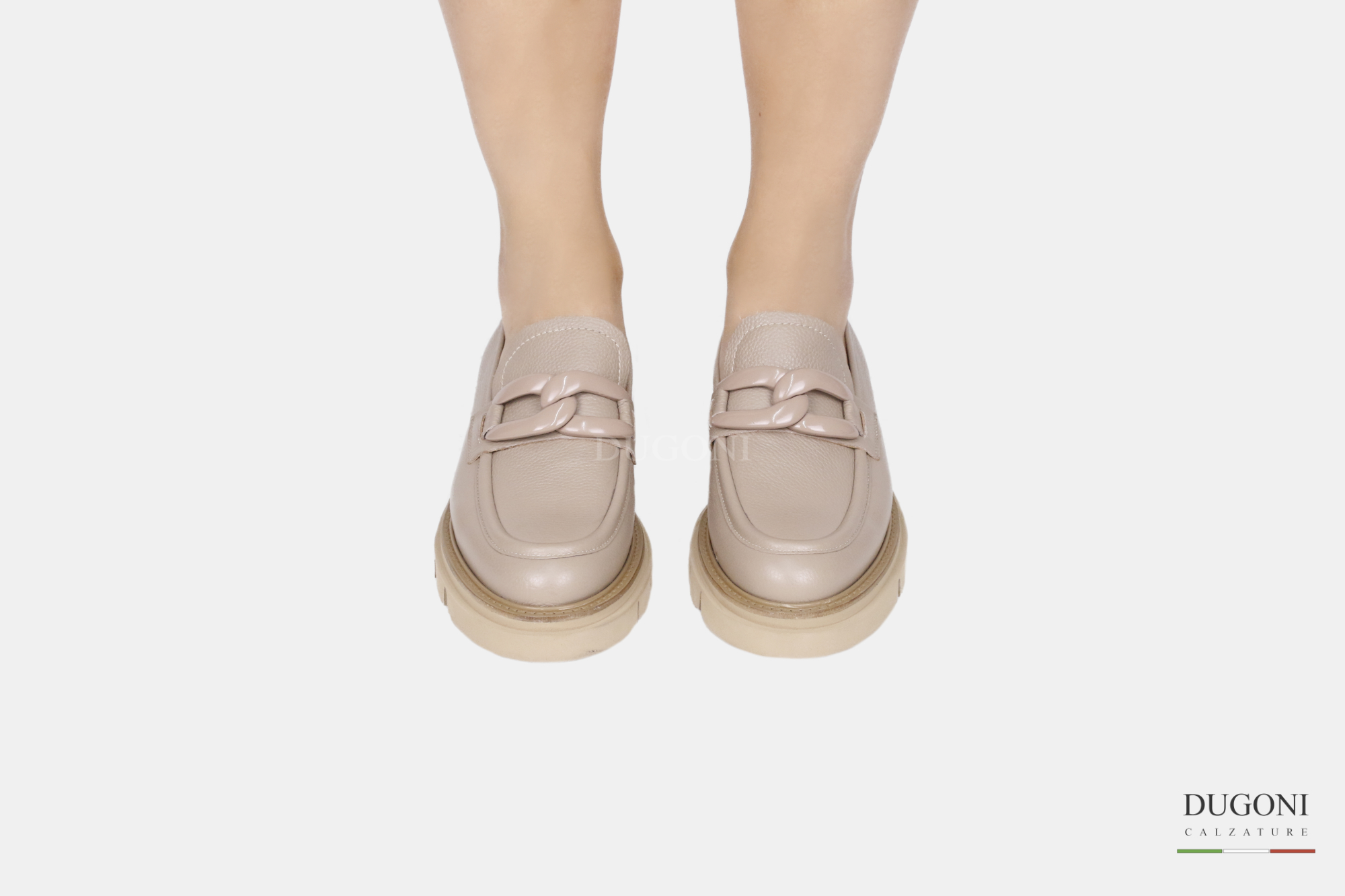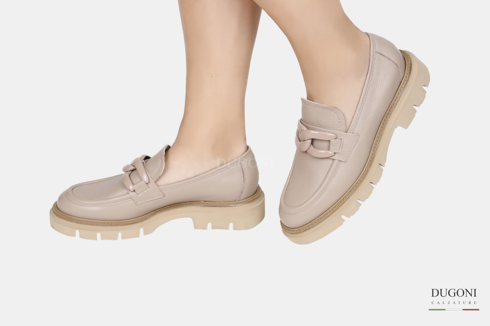 Mocassino in pelle beige con accessorio in tinta.