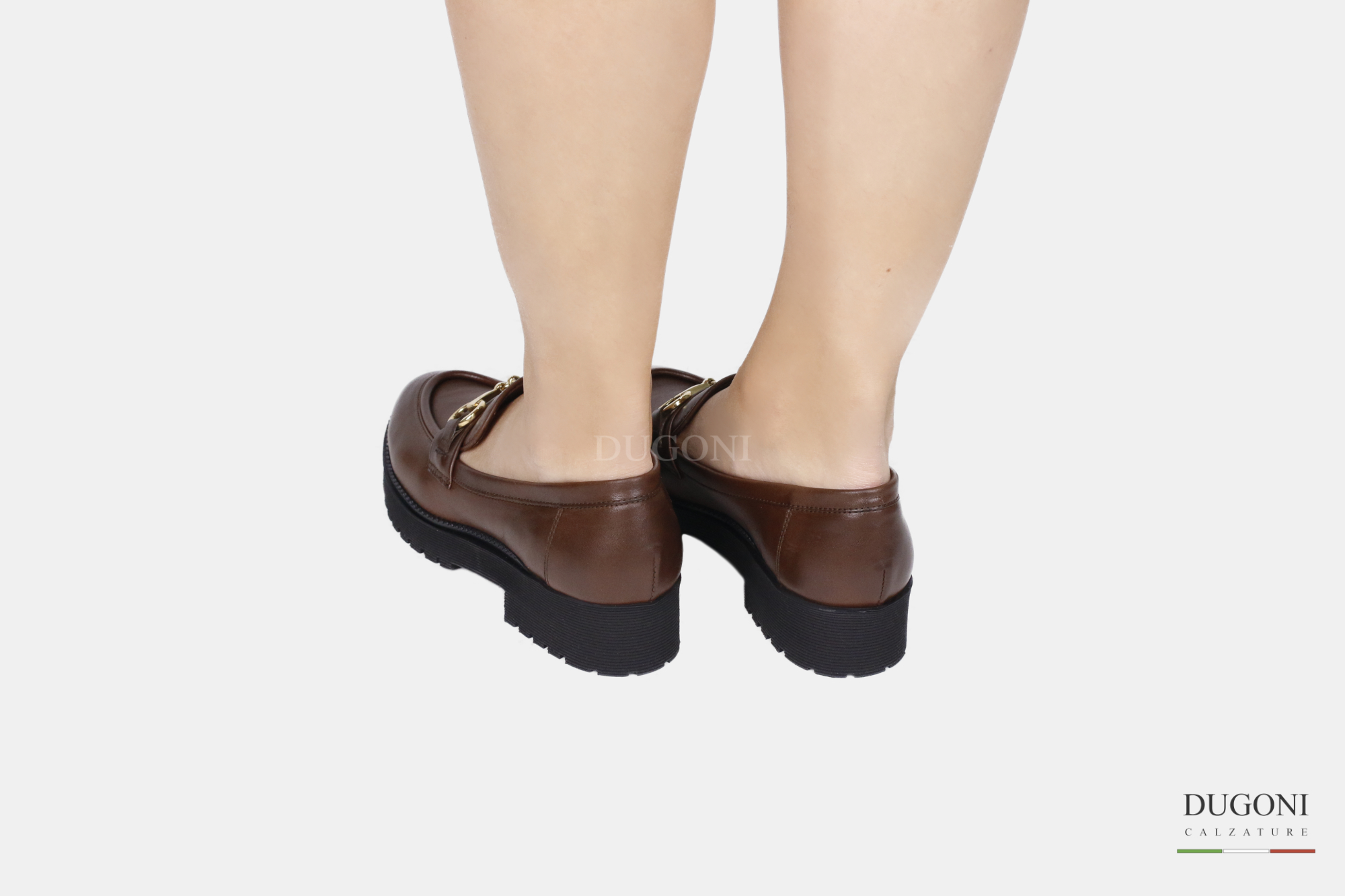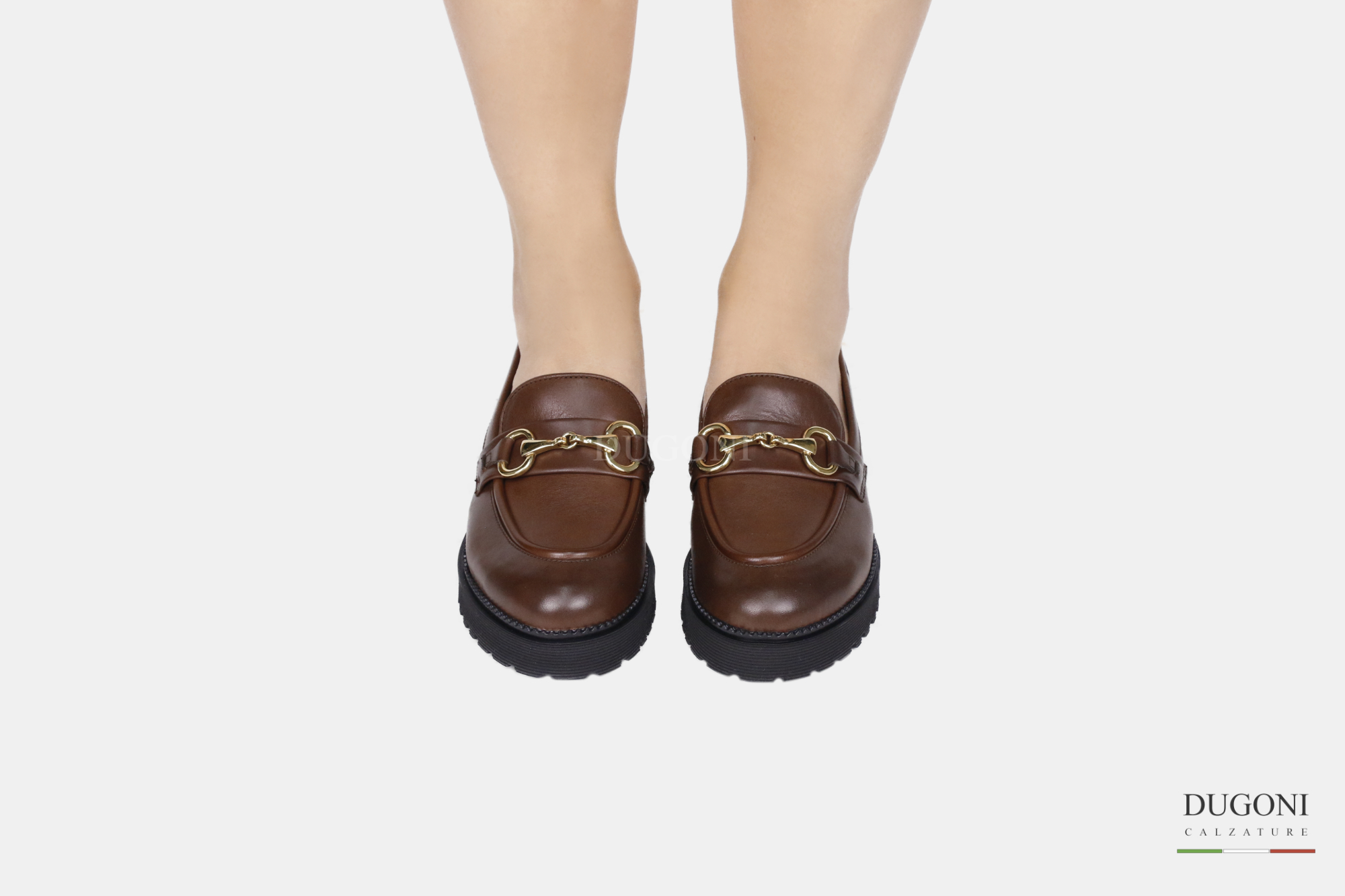 Mocassino in pelle marrone con accessorio oro. Fondo carrarmato.