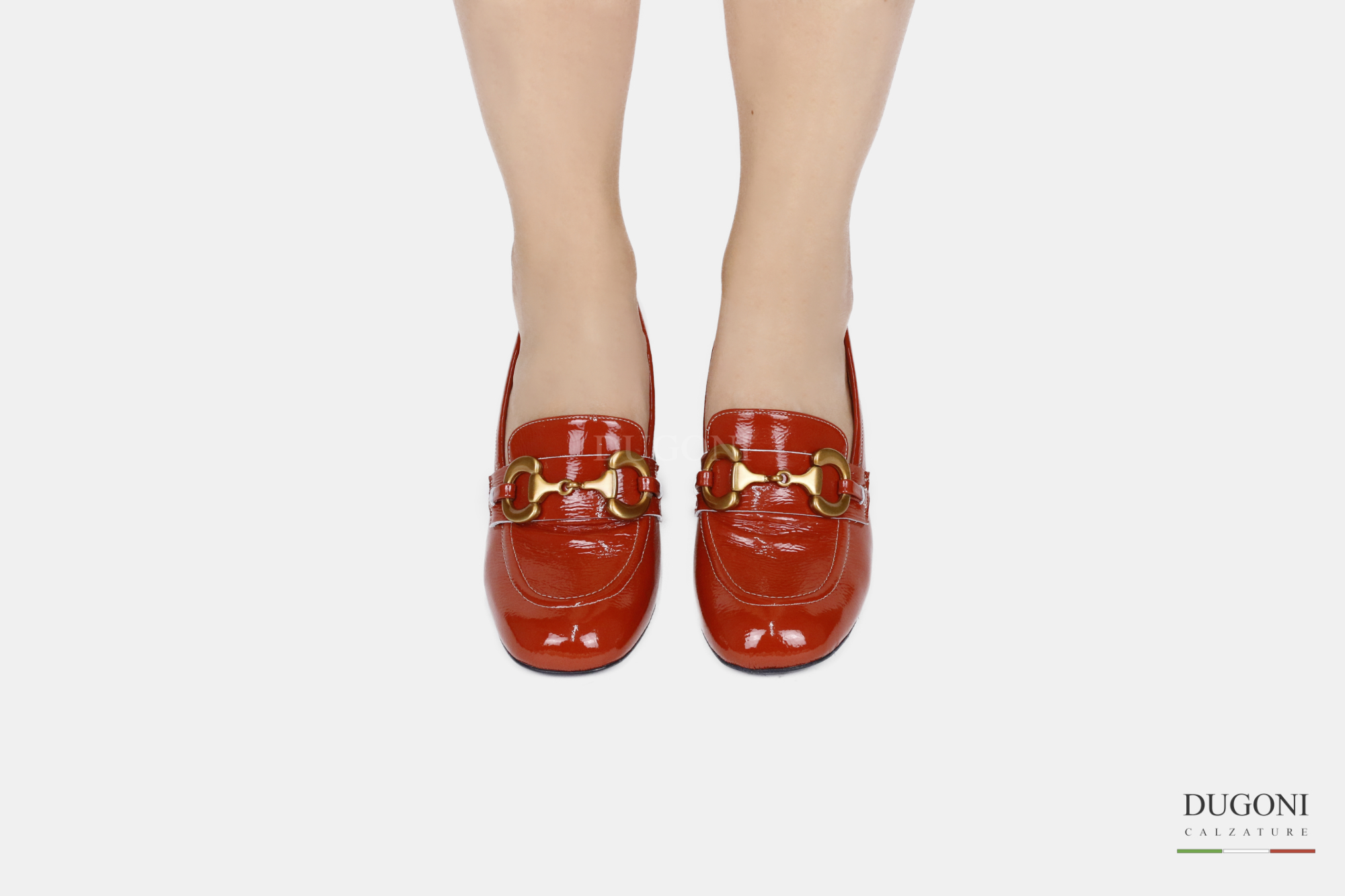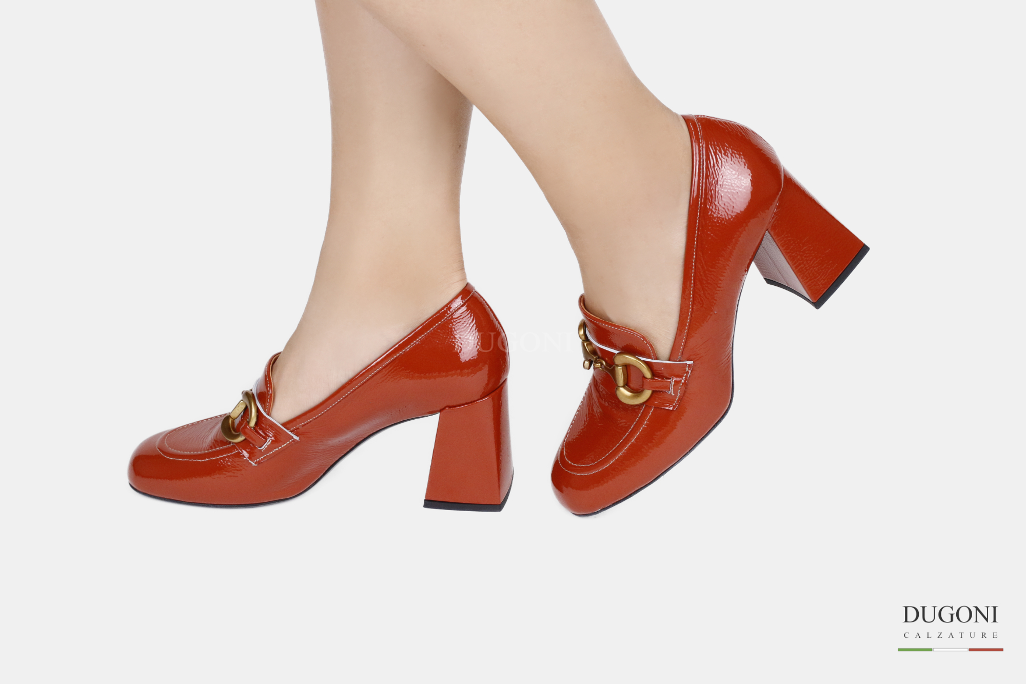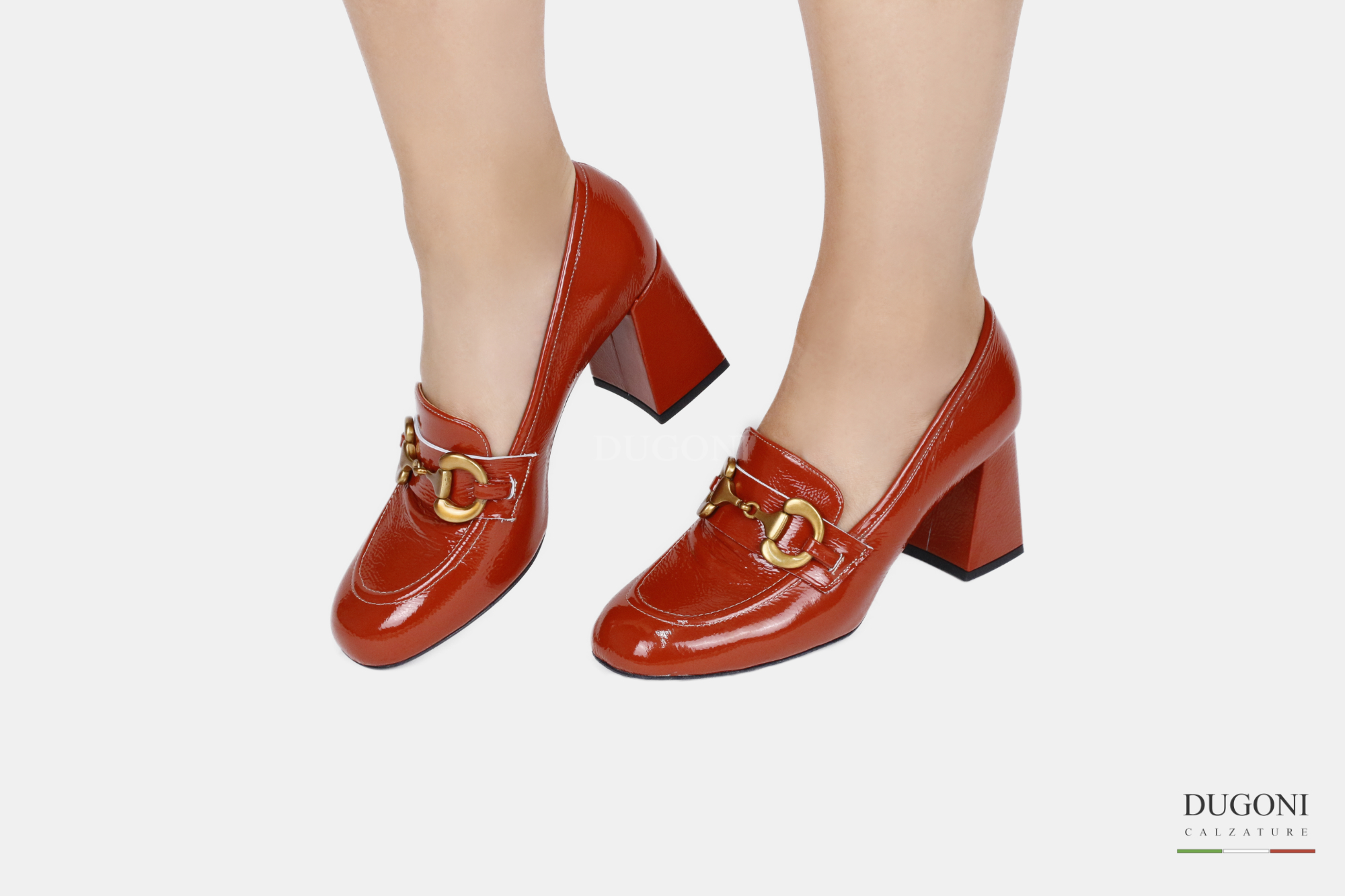 Mocassino in naplak mattone con accessorio color bronzo e forma sfilata. Tacco a coda ricoperto in tinta. Cuciture in tinta.