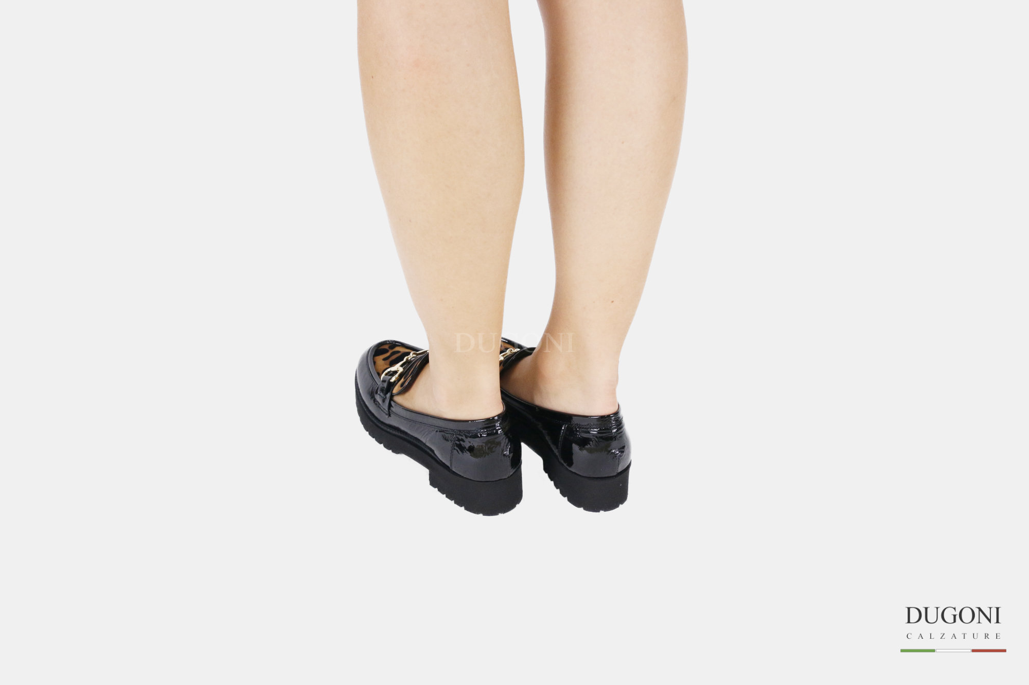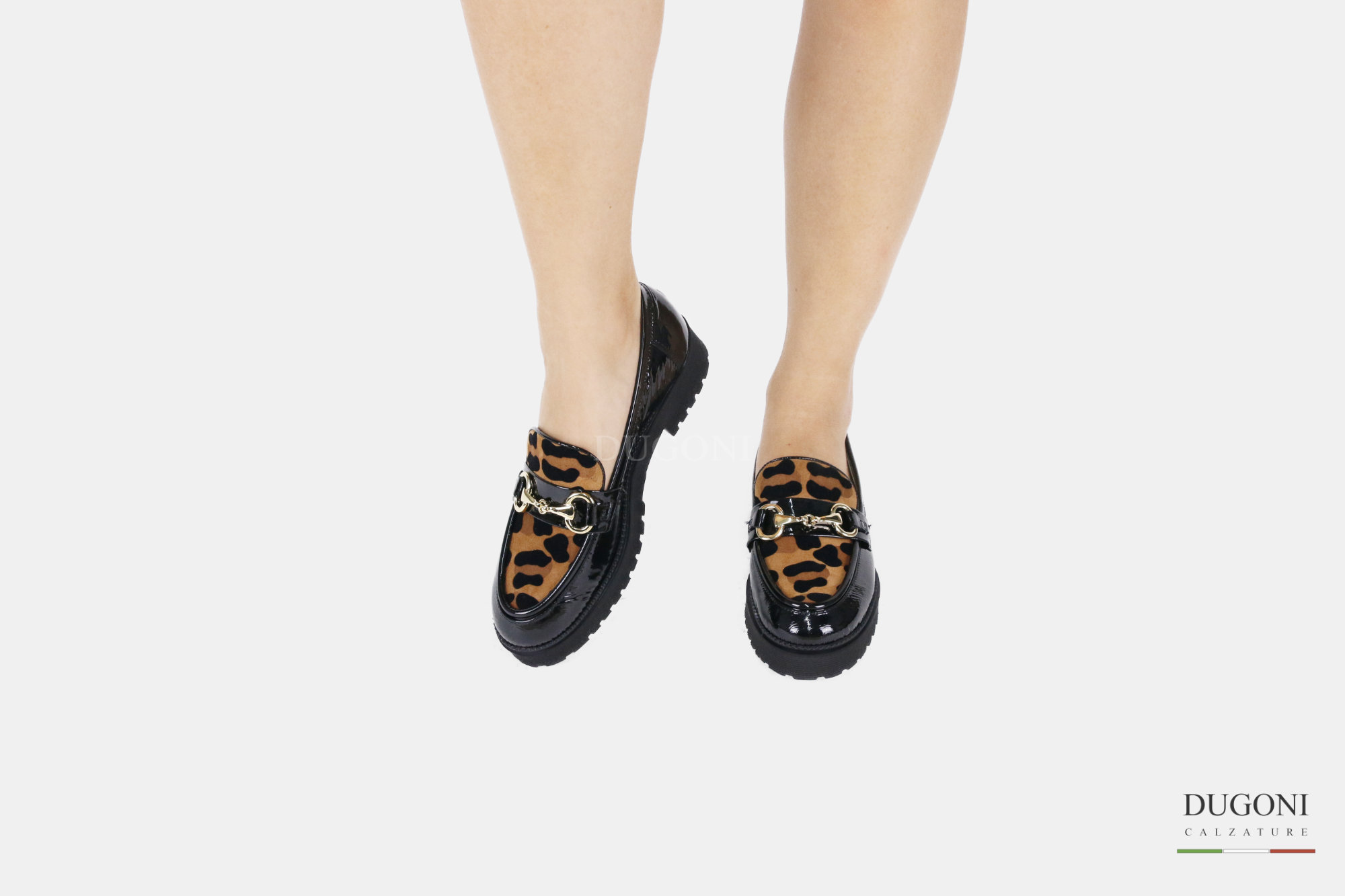 Mocassino in vernice nera con stampa in camoscio animalier leopardato. Morsetto dorato e suola carrarmato.