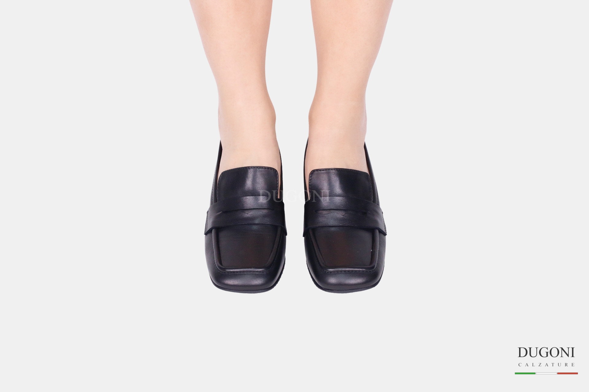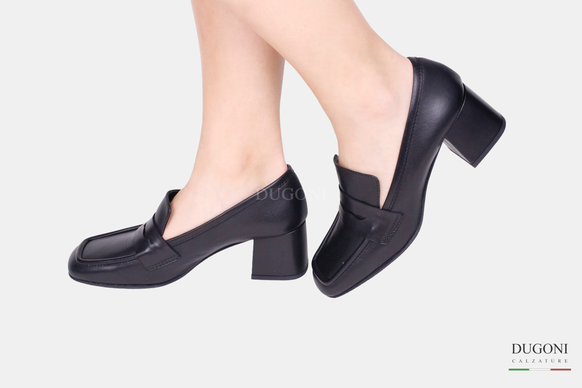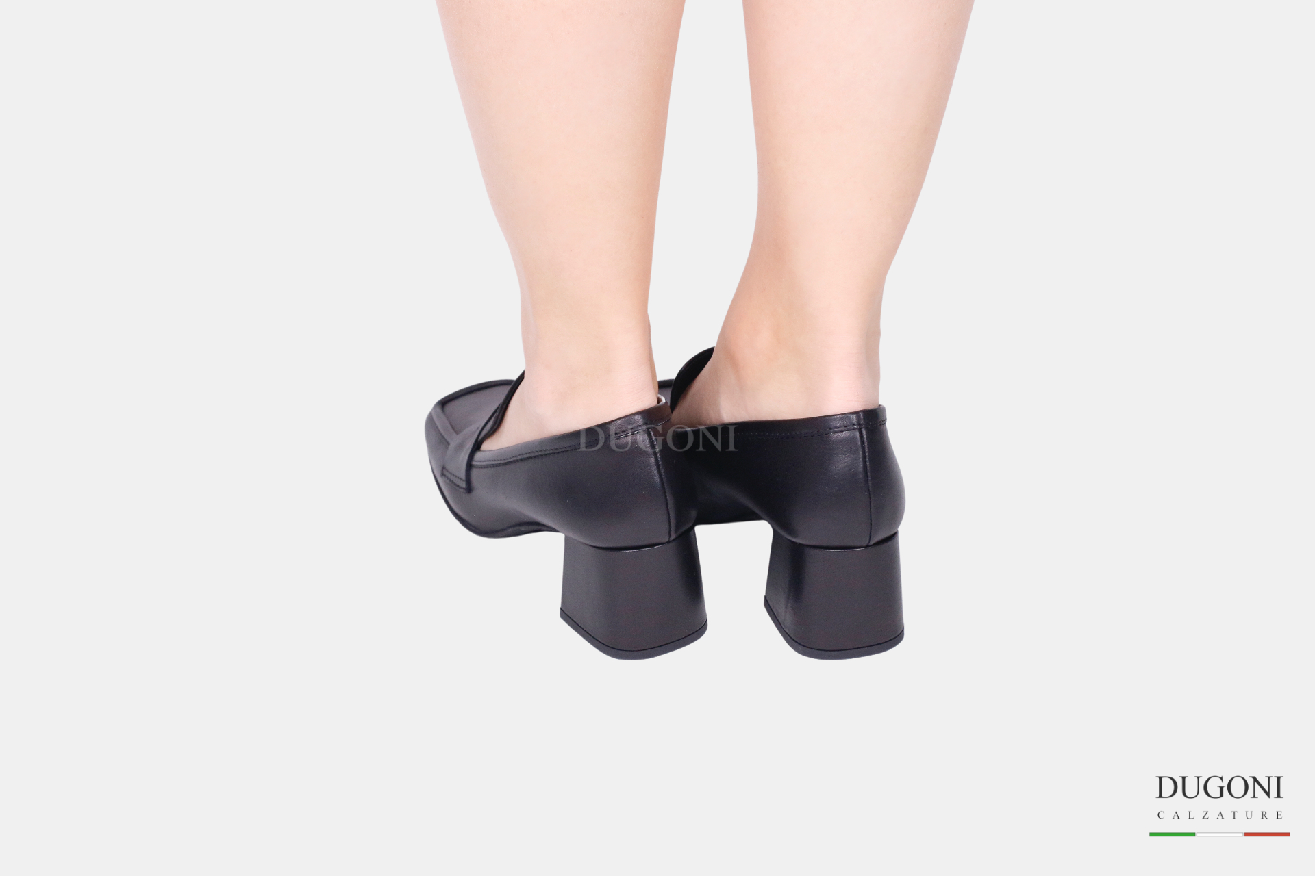 Mocassino in pelle colore nero. Suola in gomma con tacco ricoperto in tinta. Cuciture in tinta.