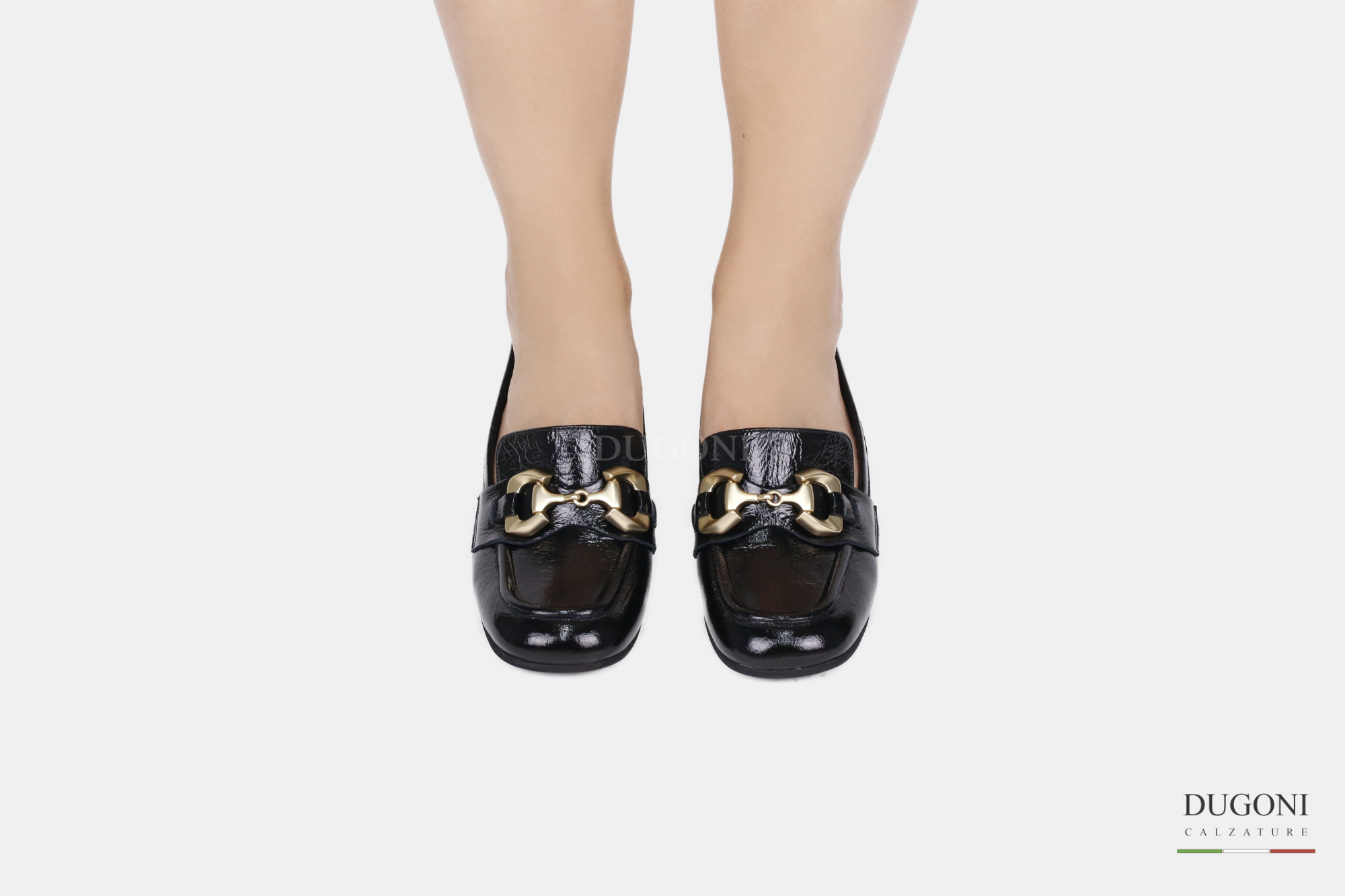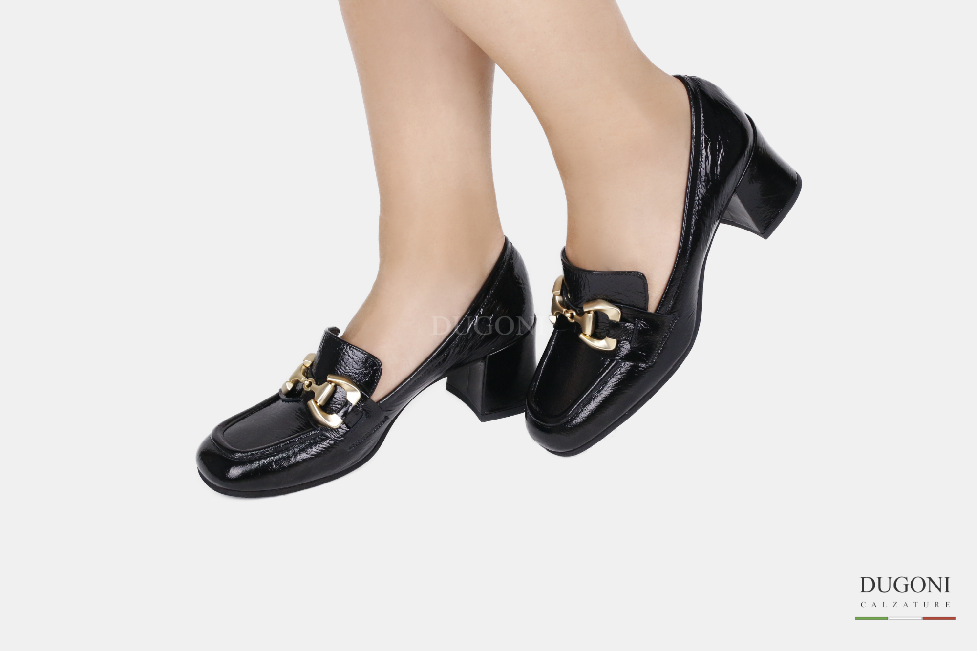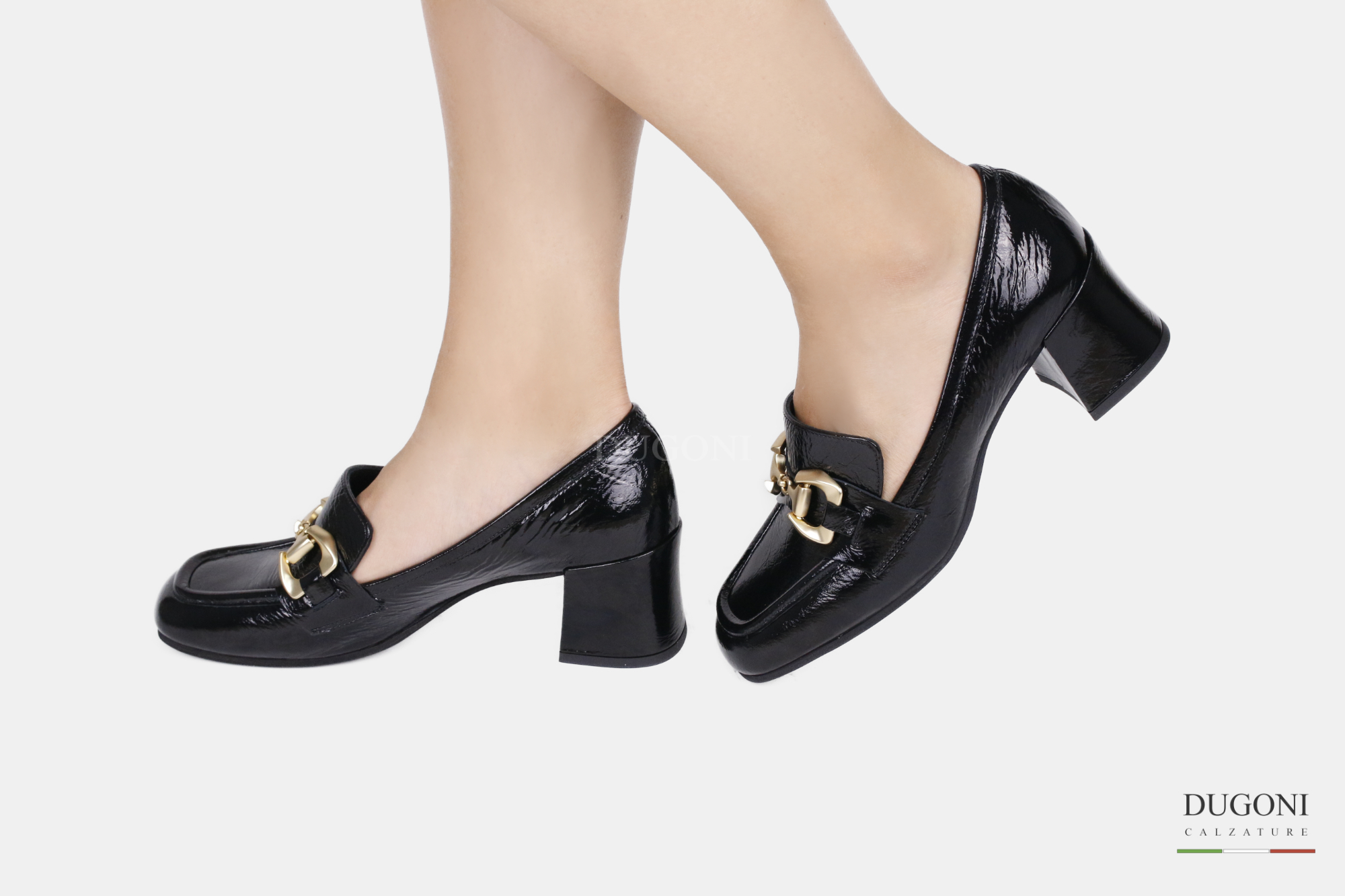 Mocassino in naplak nera con accessorio satinato dorato, sottopiede morbido , lavorazione a sacchetto. . Suola in gomma,  tacco ricoperto in tinta.