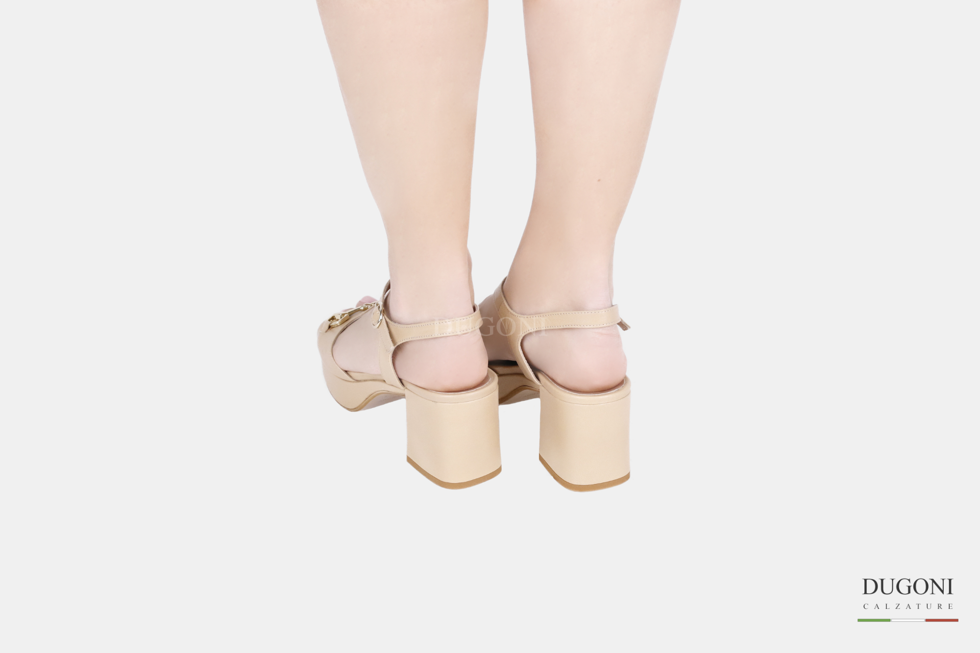 Sandalo con cinturino a T in morbida nappa beige, arricchito da accessorio in color oro. Plateau singolo. Cinturino regolabile alla caviglia con fibbia ovale in color oro. Tacco largo e rivestito.