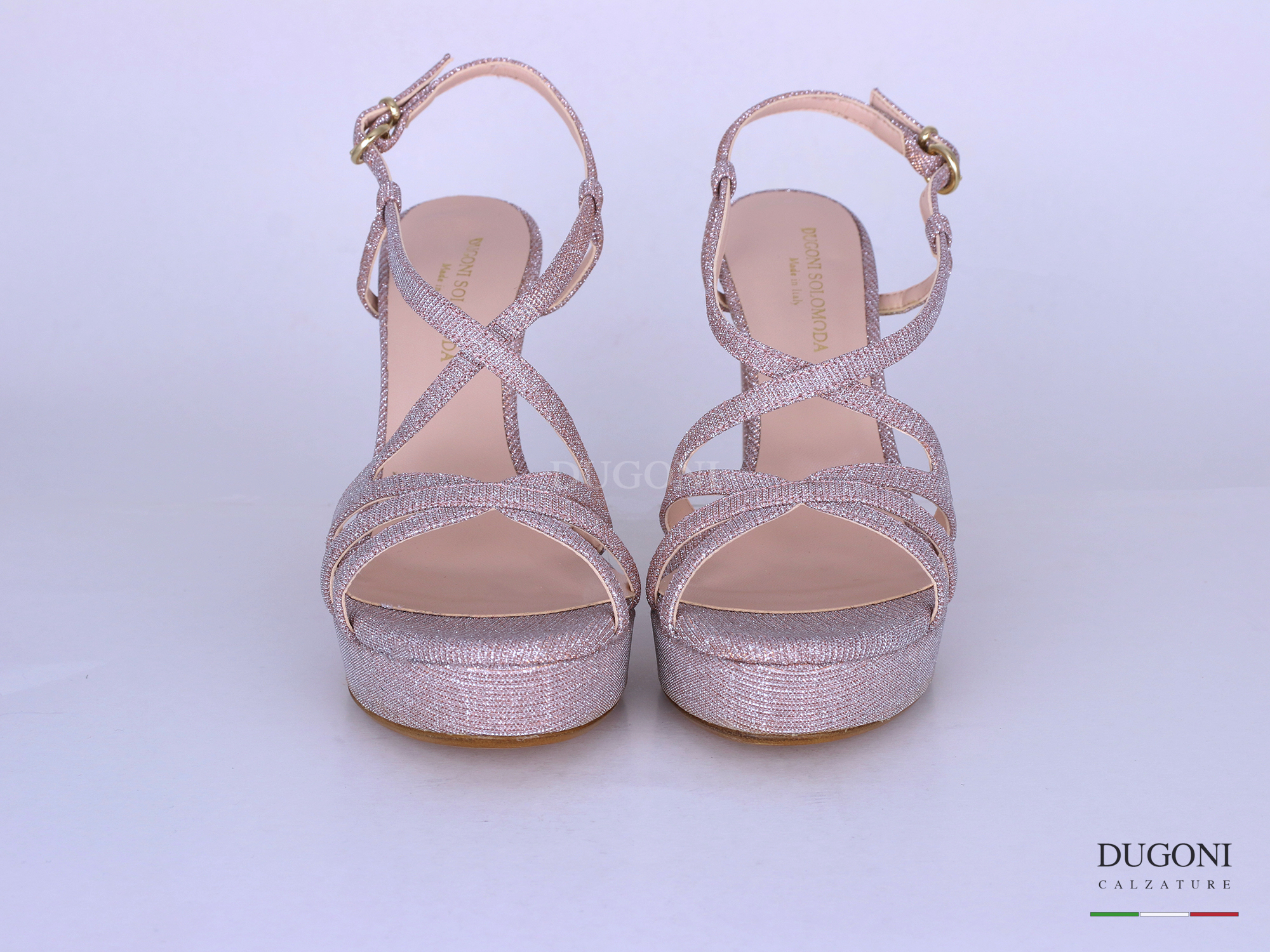 Sandalo in tessuto galassia rosa, con incrocio sul collo del piede e fascetta a mignon.