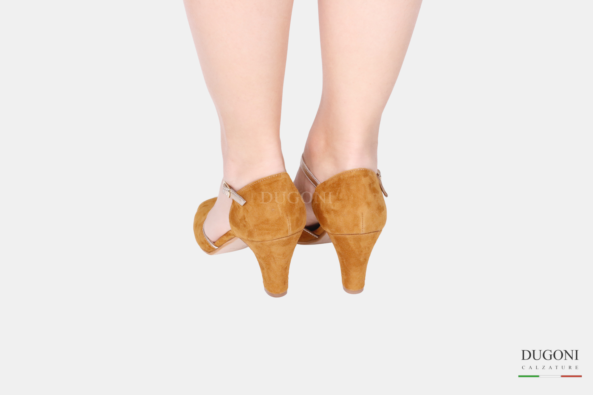 Sandalo tallone chiuso in camoscio marrone chiaro con cinturino a T. Cinturino regolabile in tinta laminato platino.