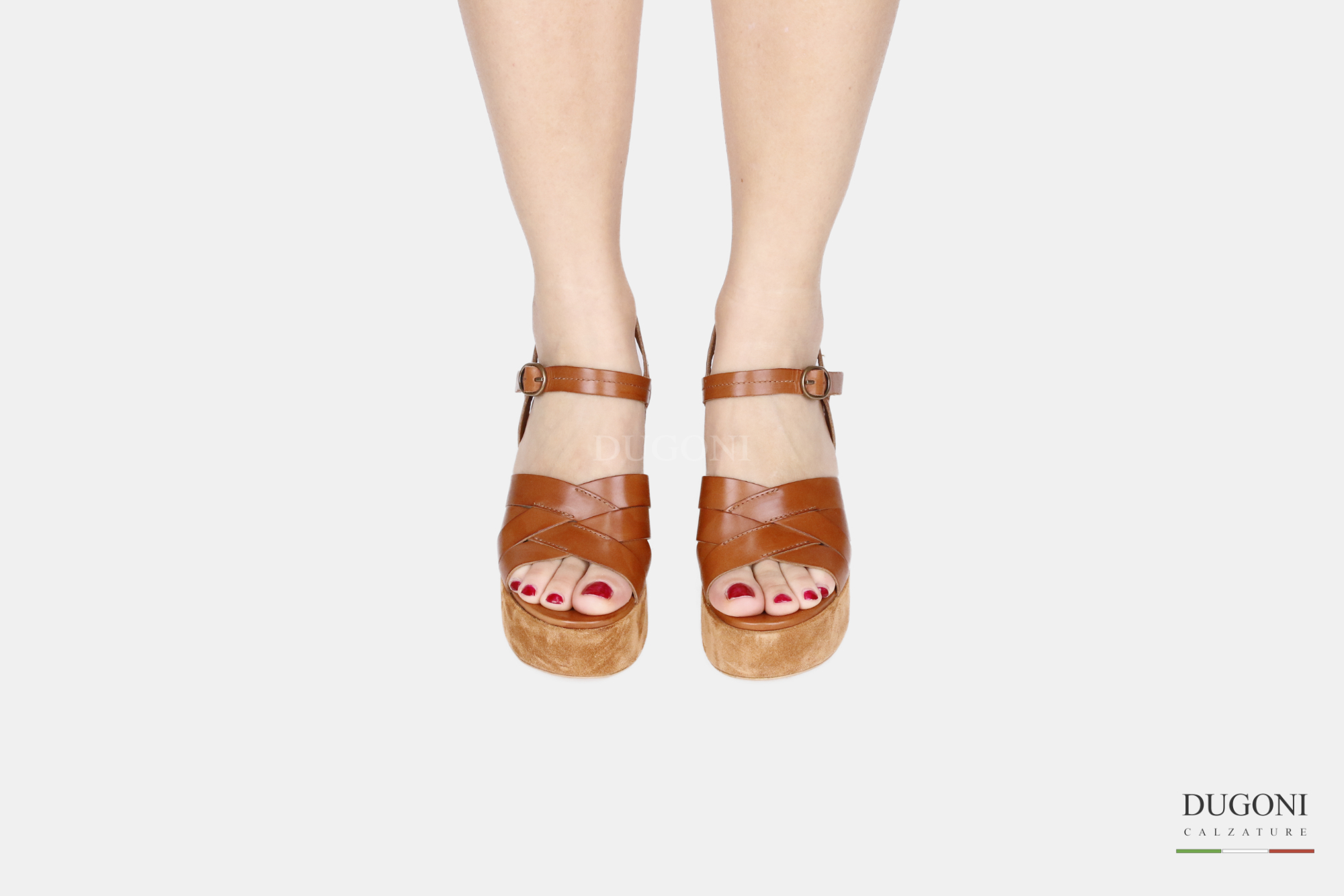 Sandalo in pelle e camoscio color marrone cuoio. Fascette in pelle incrociate nella pianta del piede. Cinturino regolabile alla caviglia. Tacco grosso e rivestito in camoscio.