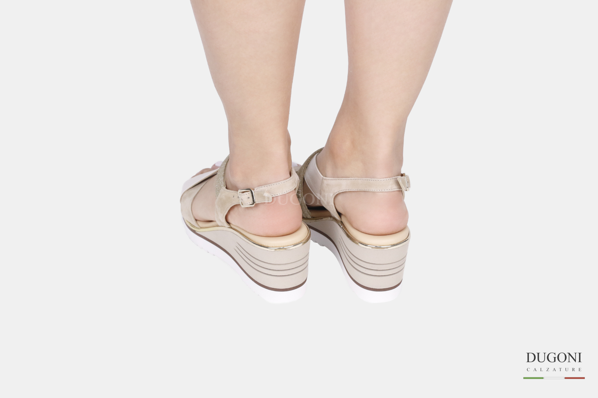 Sandalo con zeppa alta a fascette incrociate sul collo del piede. Cinturino posteriore regolabile. Zeppa in gomma bicolor..