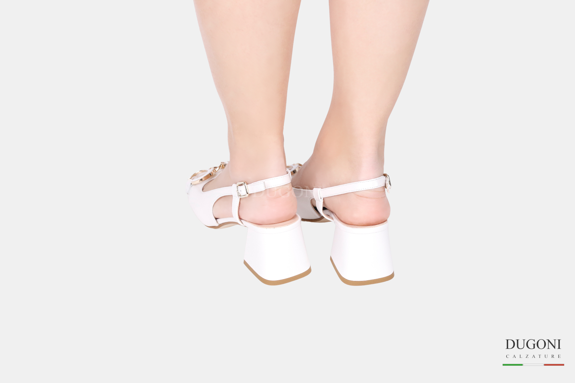 Slingback in pelle di vernice morbida colore bianca. Cinturino regolabile. Tacco svasato in tinta. Accessorio color bianco e oro.