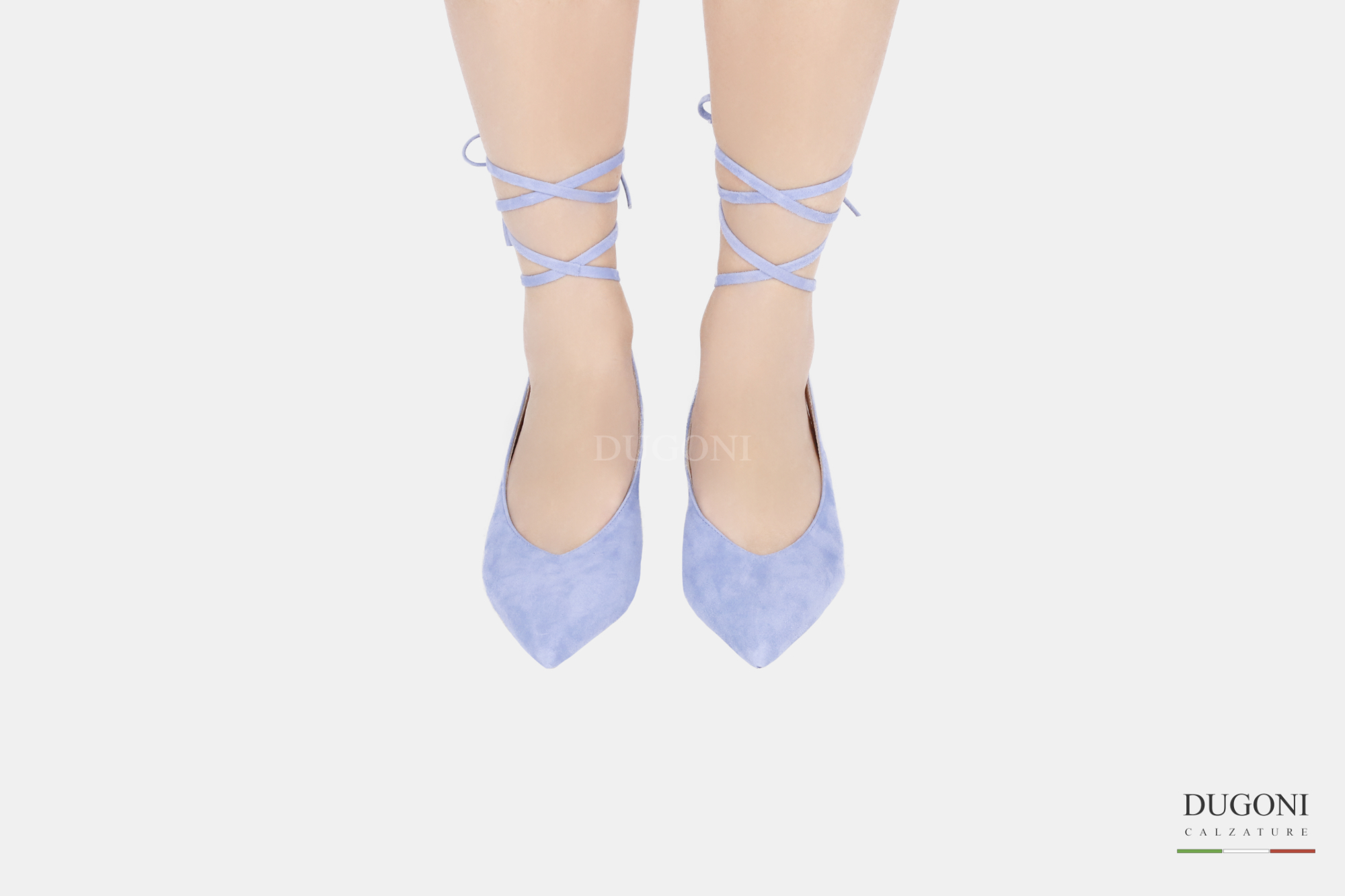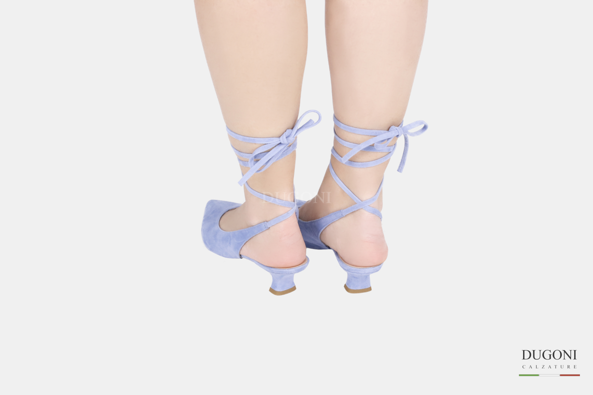 Slingback in camoscio azzurro con lacci incrociati alla caviglia. Tacco a rocchetto.