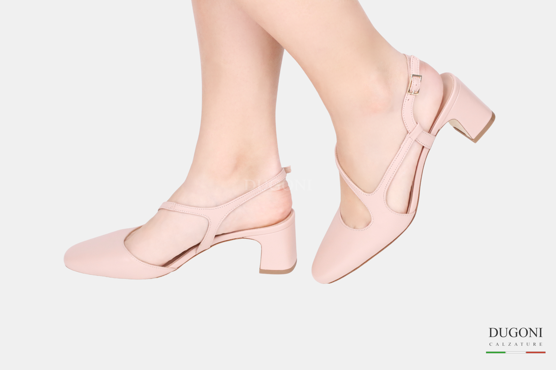 Slingback con forma tonda in pelle morbida colore cipria. Cinturino regolabile. Tacco in tinta rivestito..