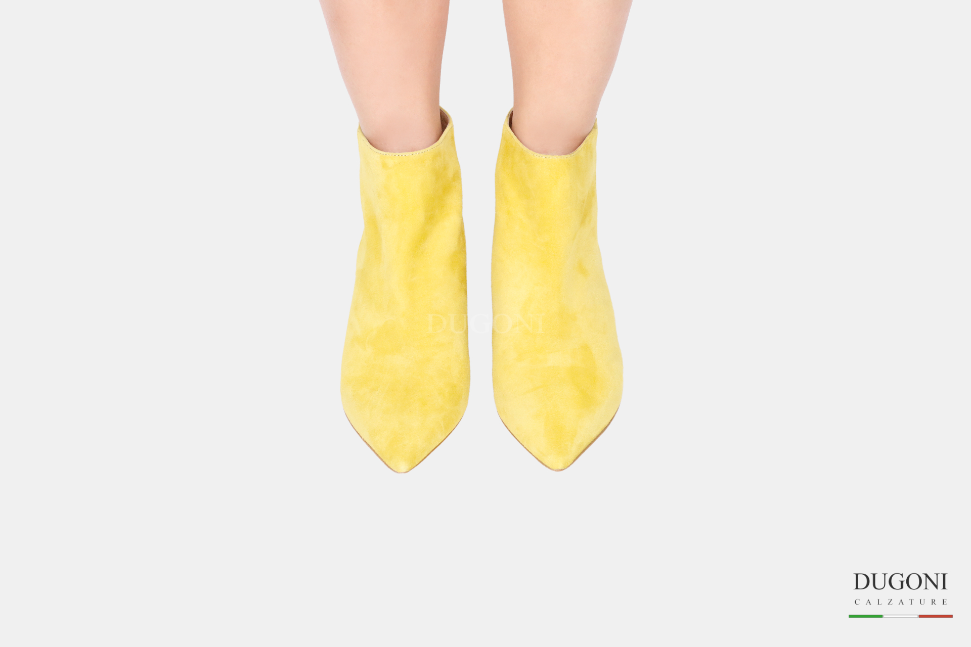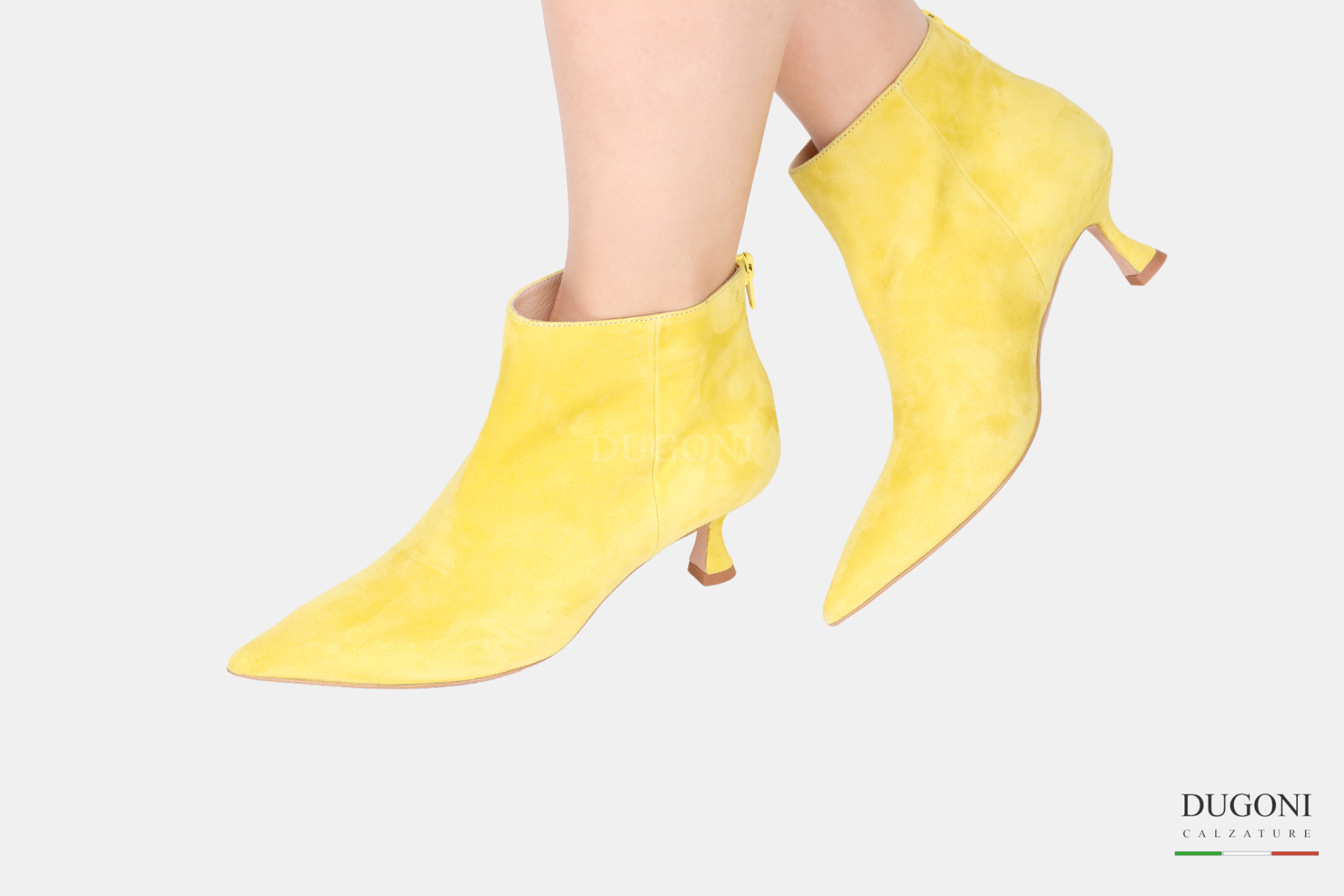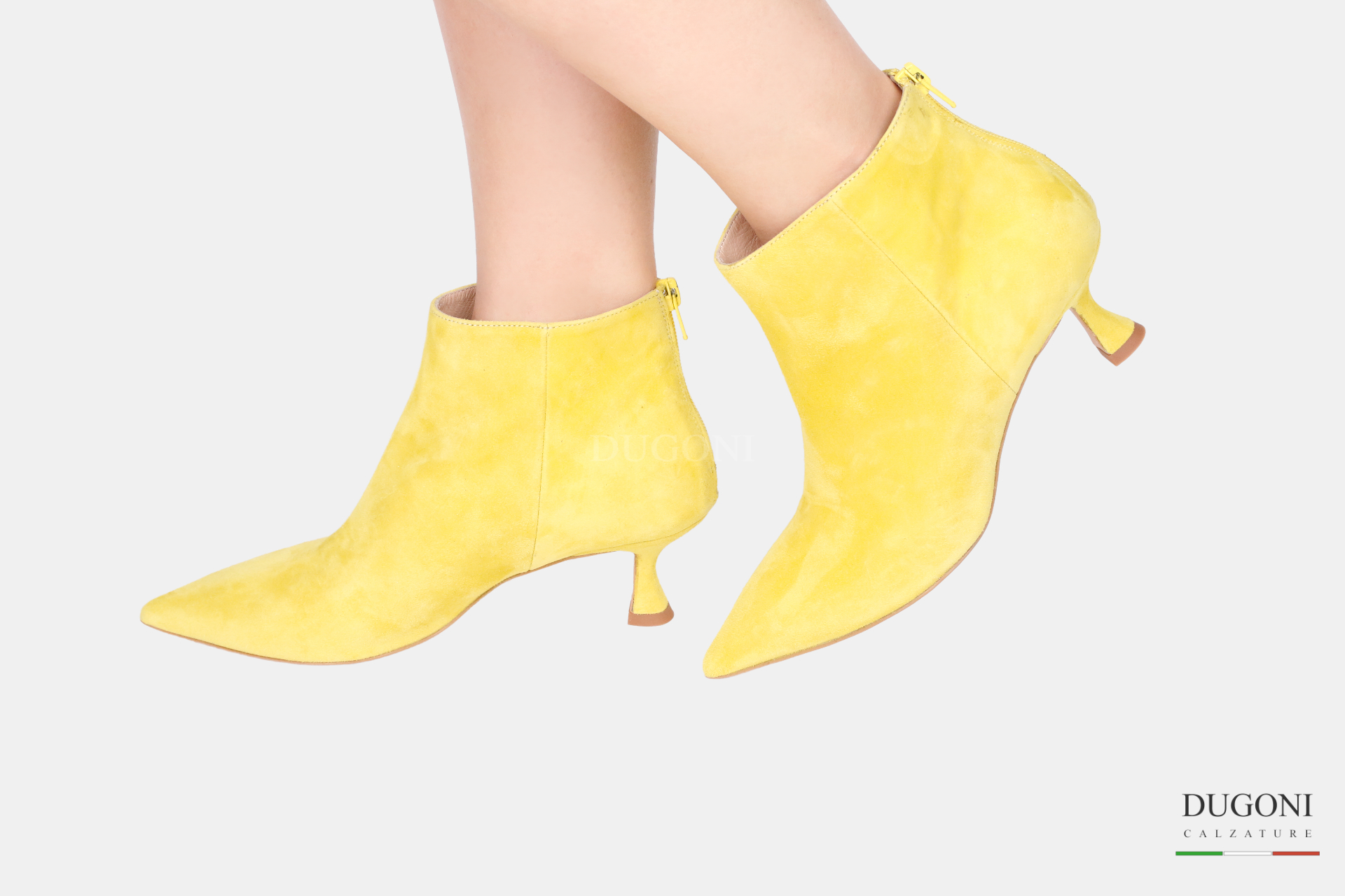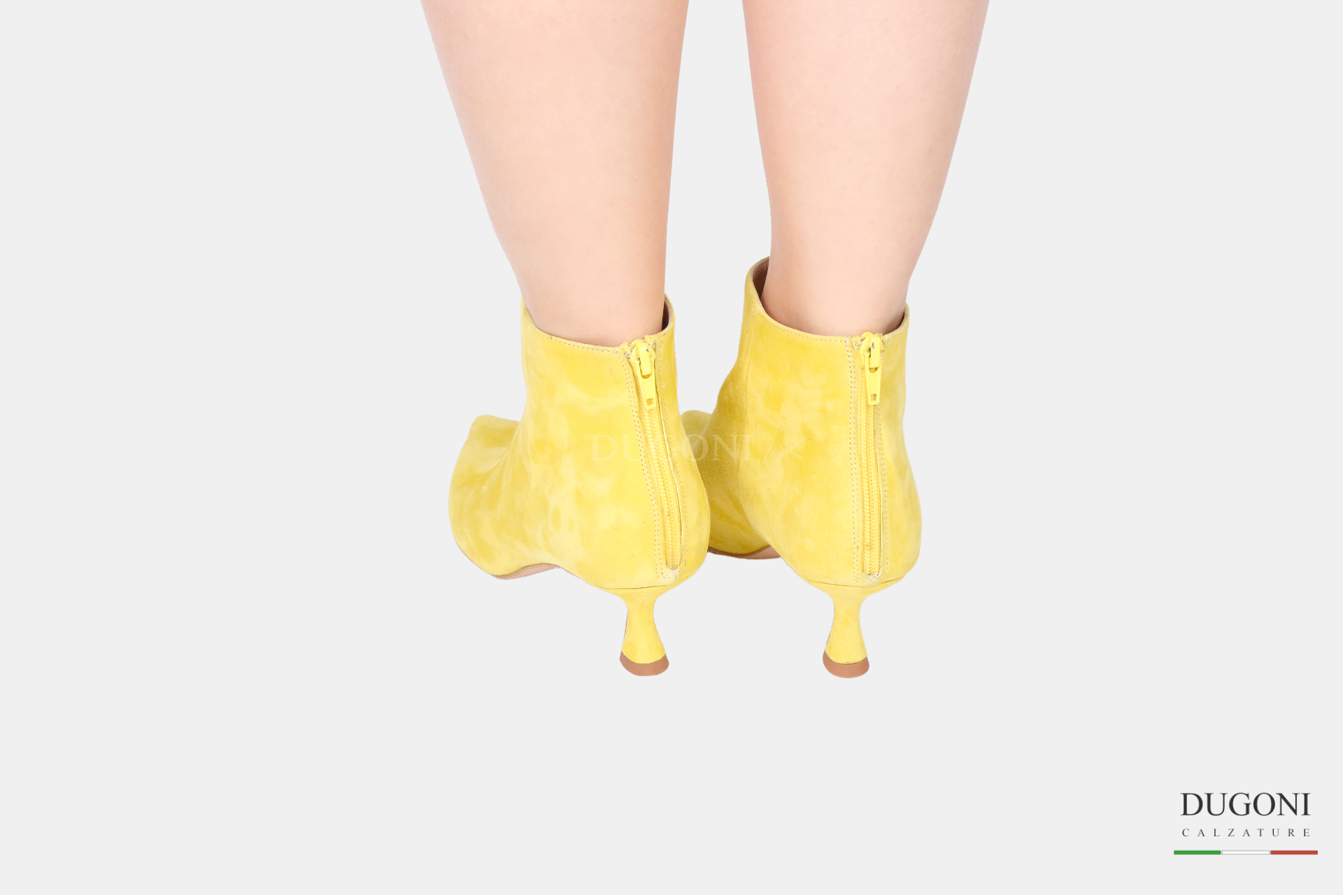 Tronchetto sole in camoscio con  tacco a rocchetto  ricoperto in tinta .  Cerniera dietro.