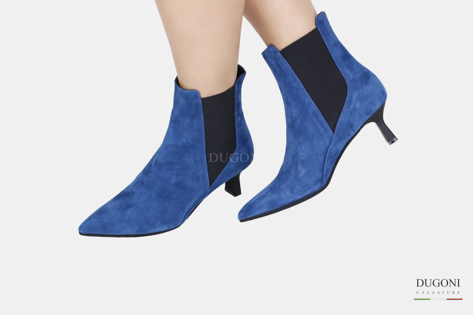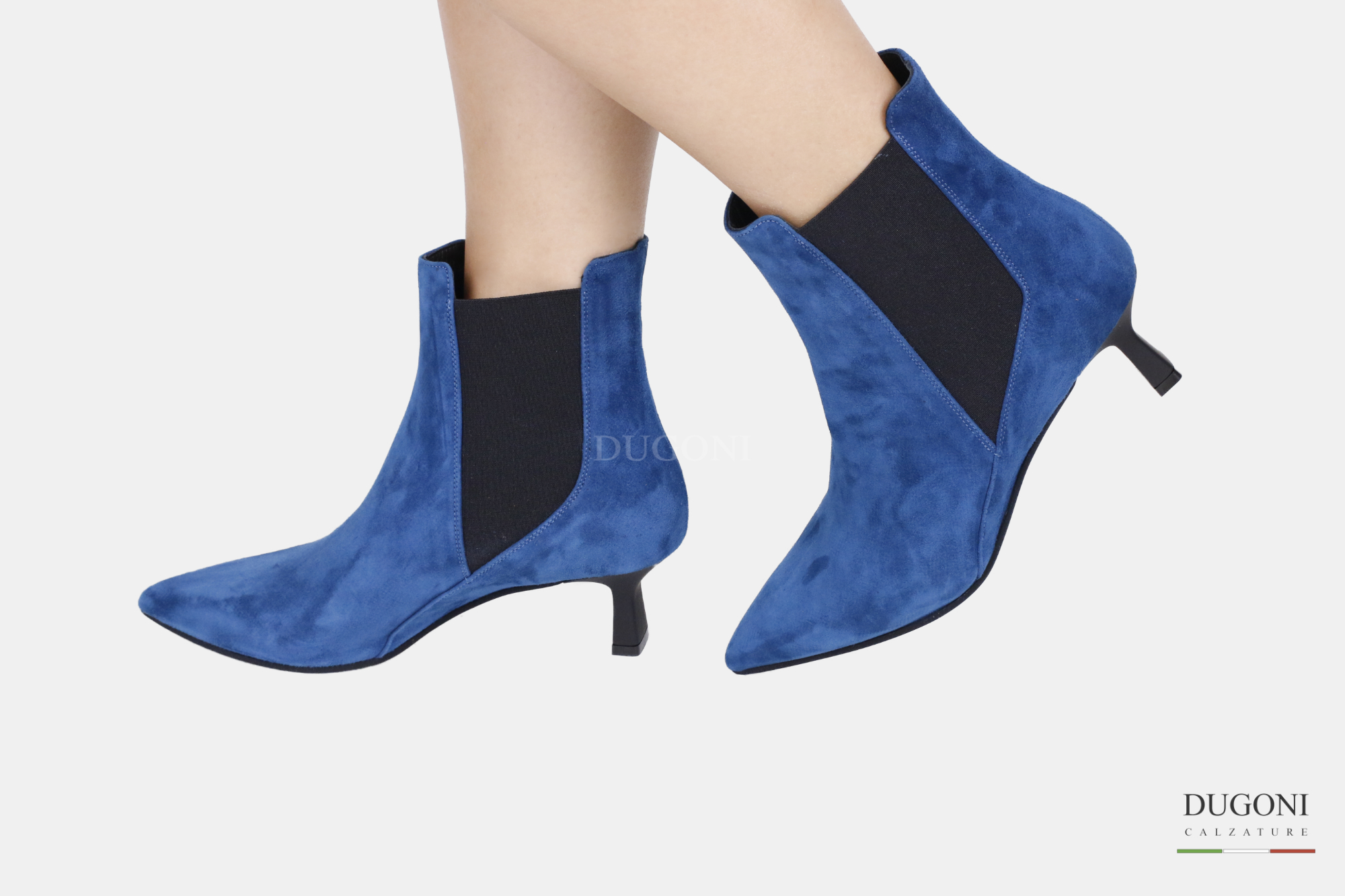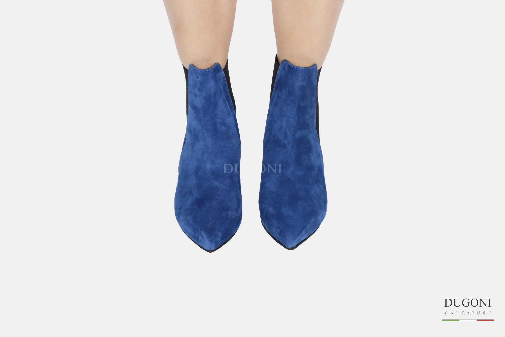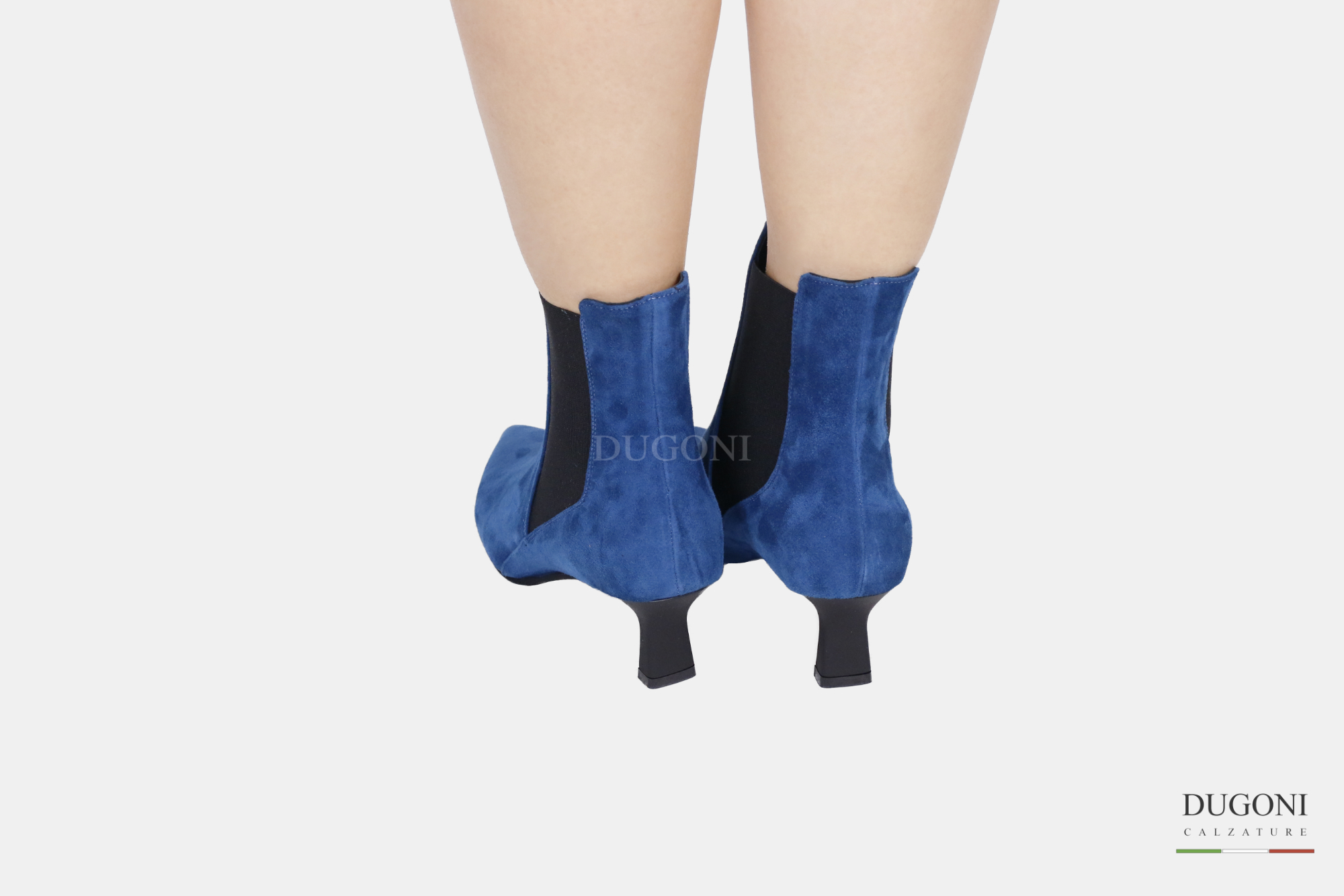 Tronchetto con *lavorazione a sacchetto, in camoscio ottanio con elastici. Suola in gomma, tacco rocchetto in abs nero.