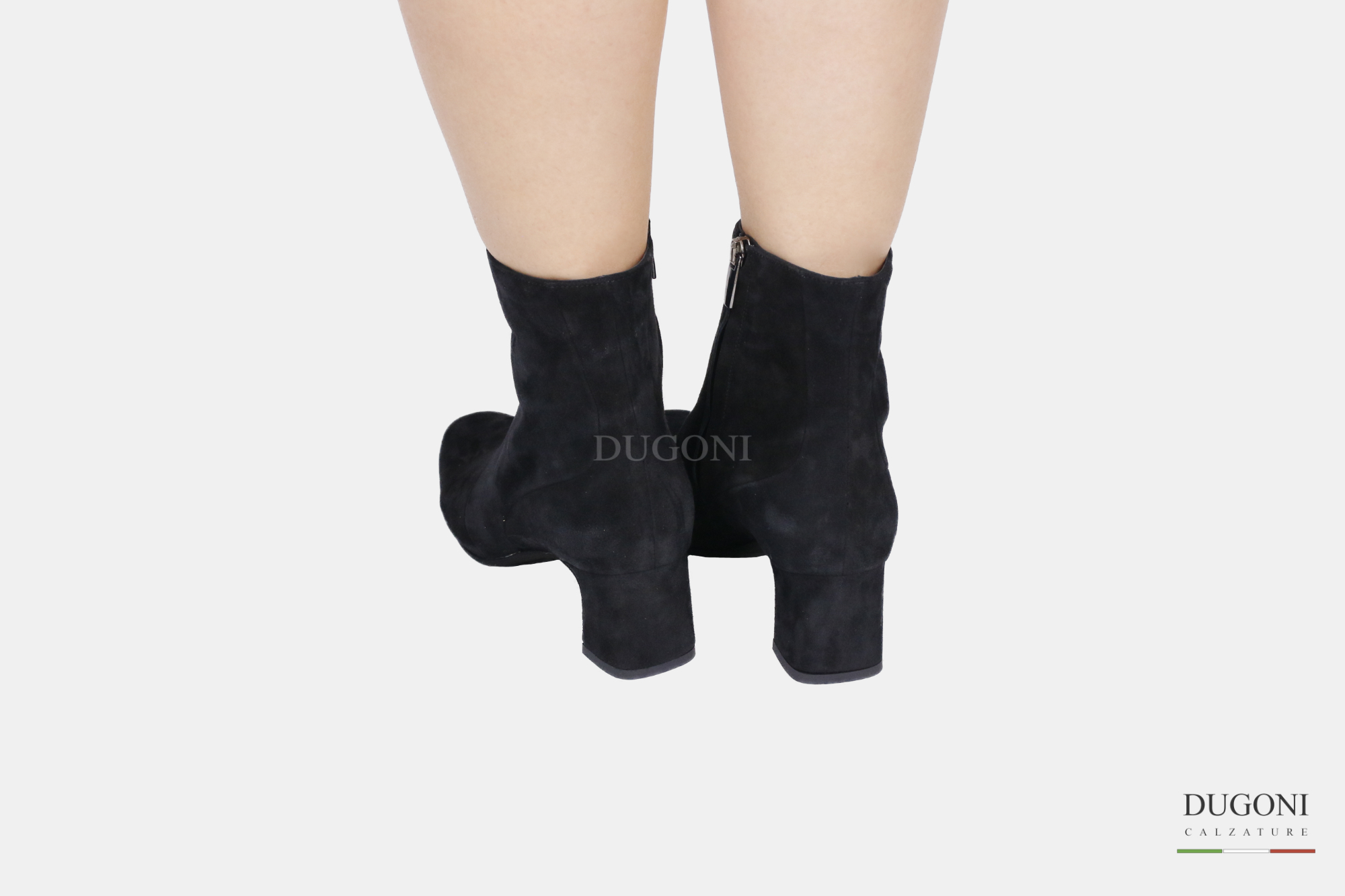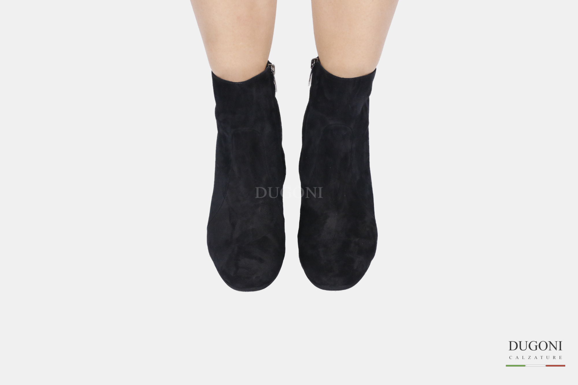 Stivaletto con *lavorazione a sacchetto, in camoscio nero con cerniera interna. Tacco ricoperto.