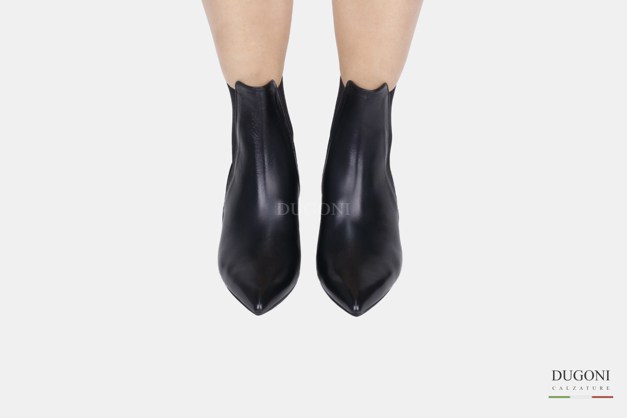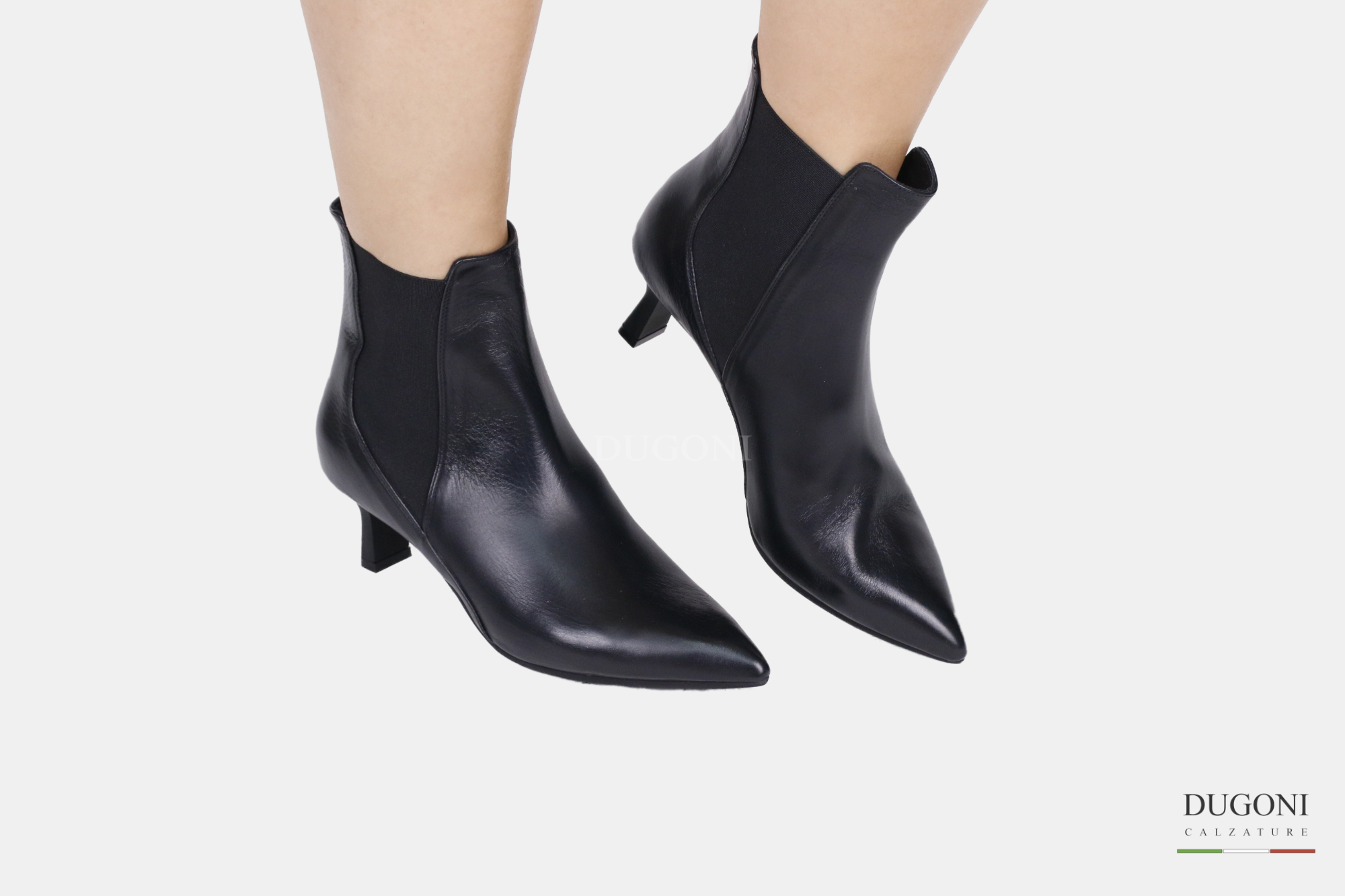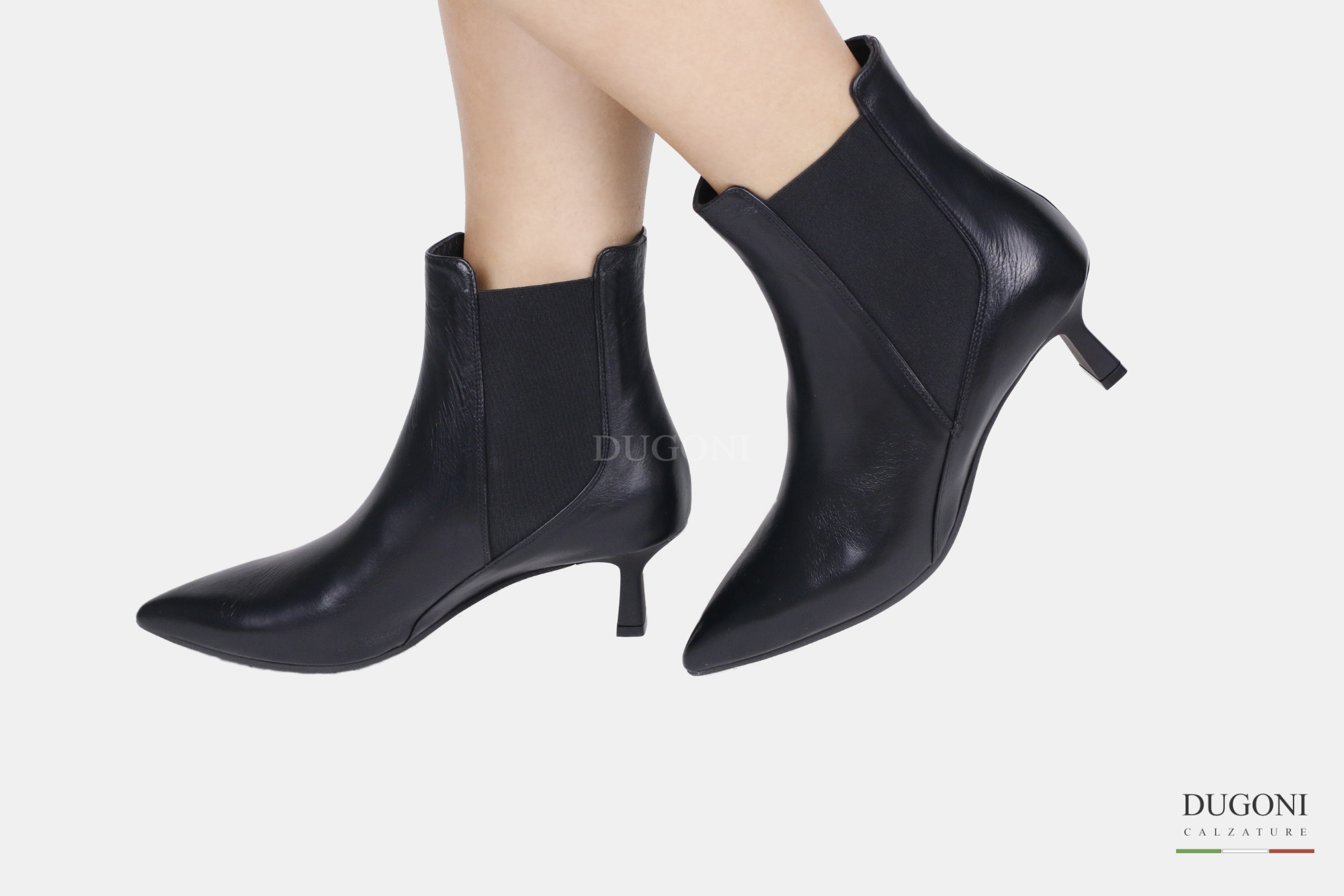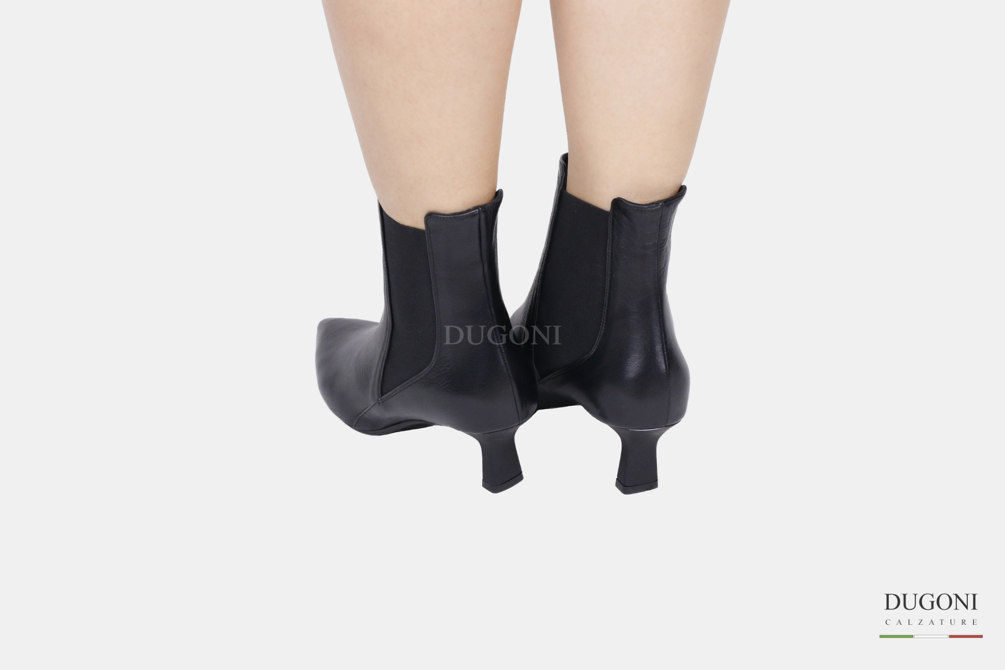 Tronchetto con *lavorazione a sacchetto, in pelle nera con elastici.,Suola in gomma , tacco rocchetto in abs.