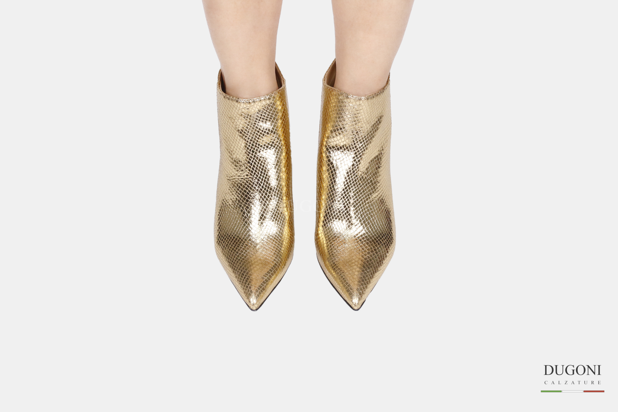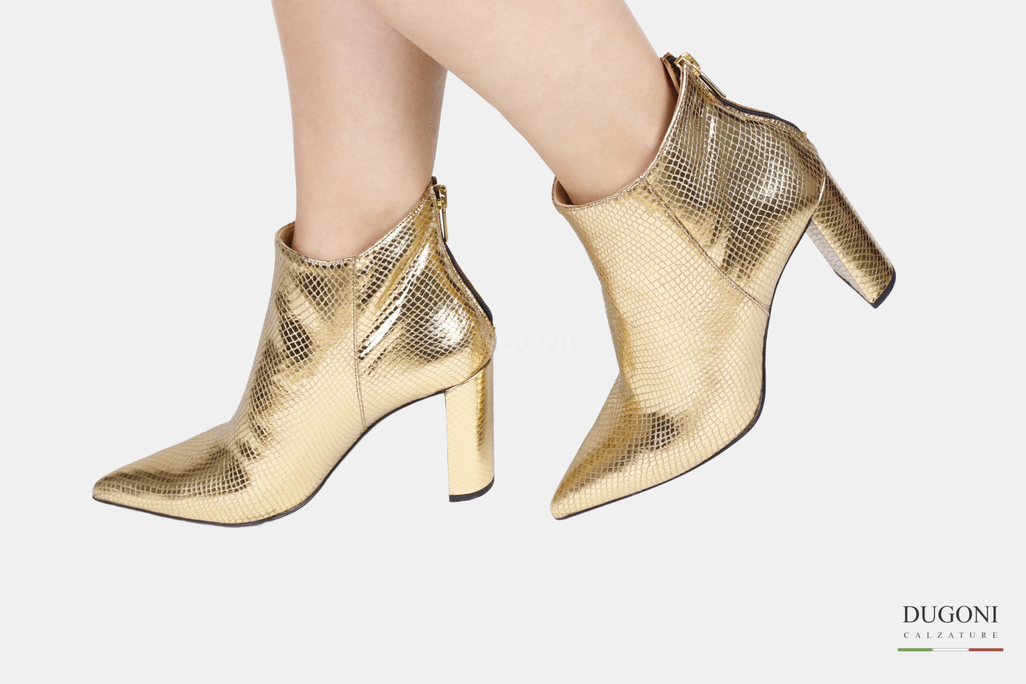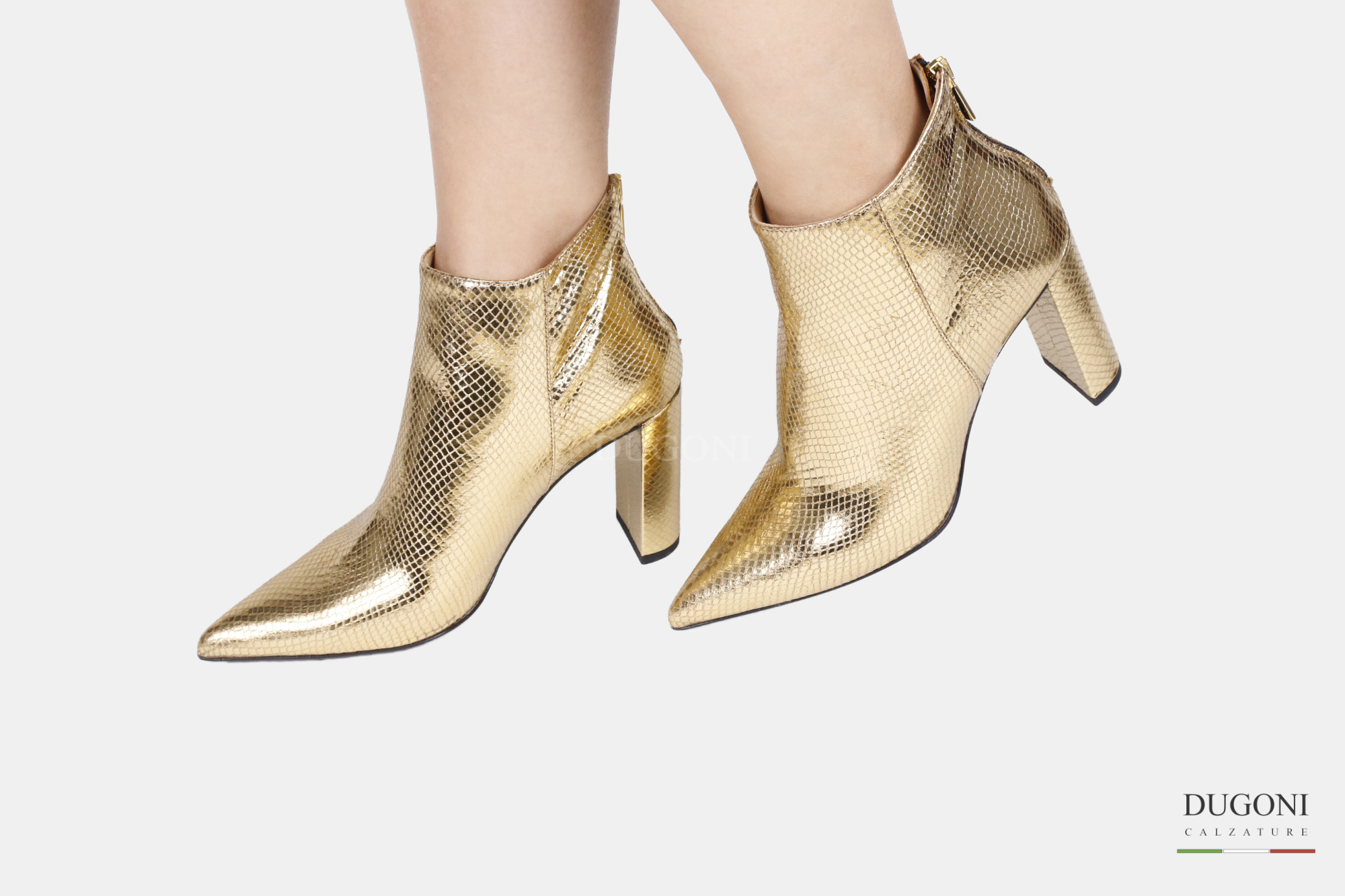 Stivaletto in pelle stampata oro con cerniera sul retro. Tacco largo e ricoperto. Fondo cuoio con ovalino antiscivolo.