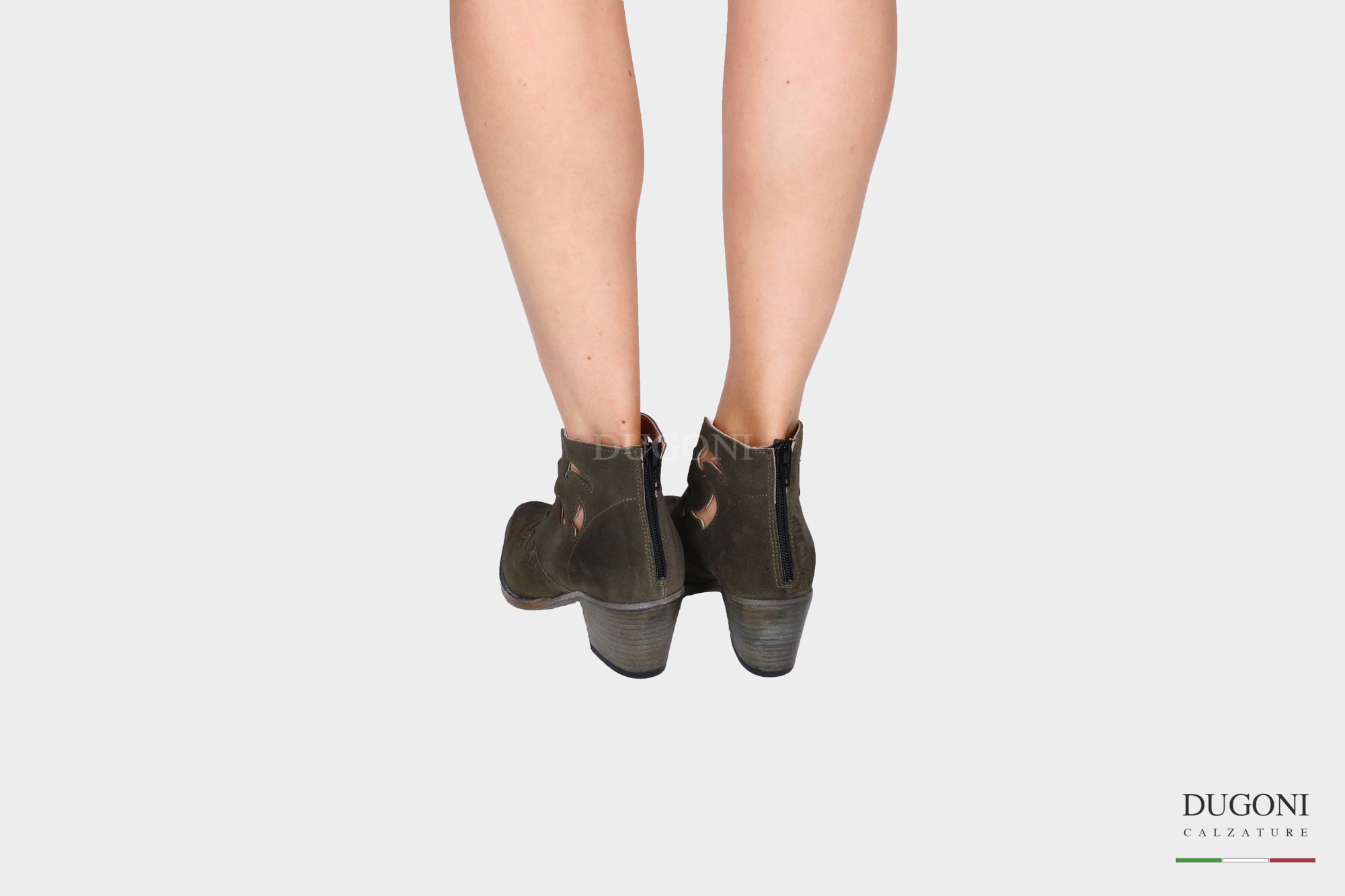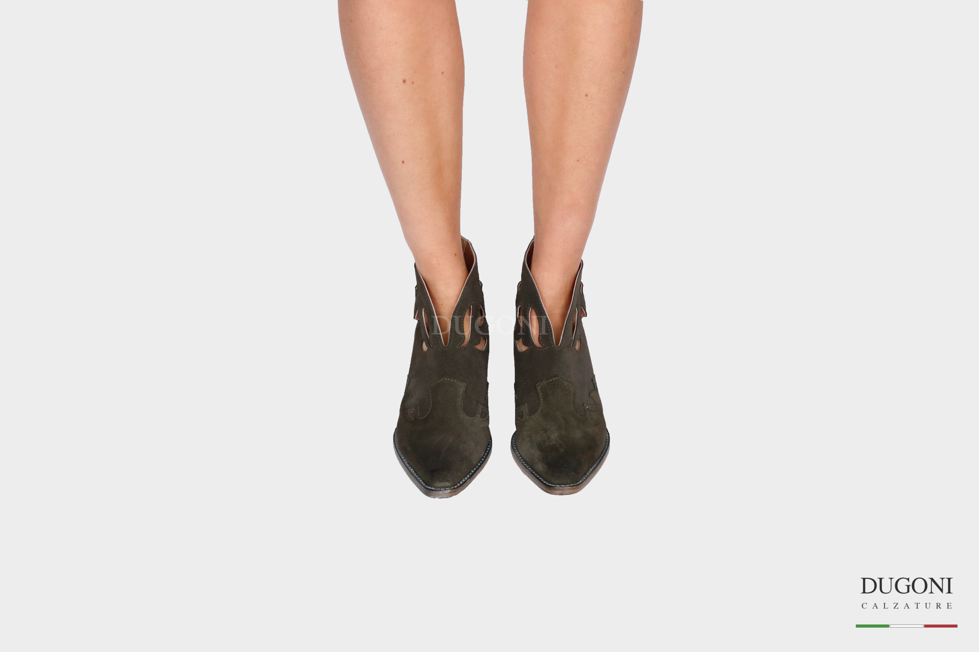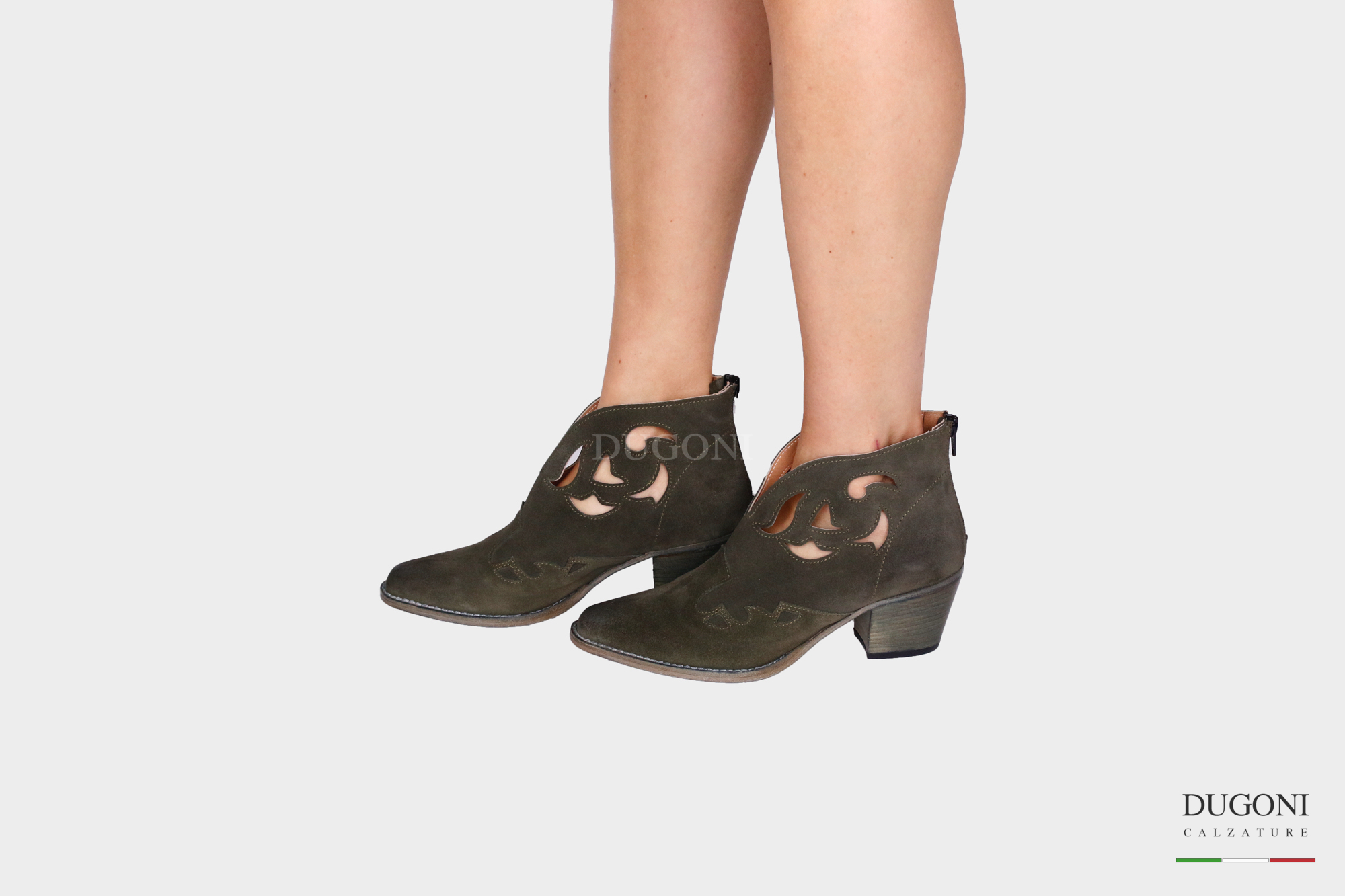 Stivaletto tipo texano sfilato in pelle di camoscio color verde. Cerniera posteriore. Intagliato con decori. Tacco in cuoio. Profilo suola con cucitura in tinta.