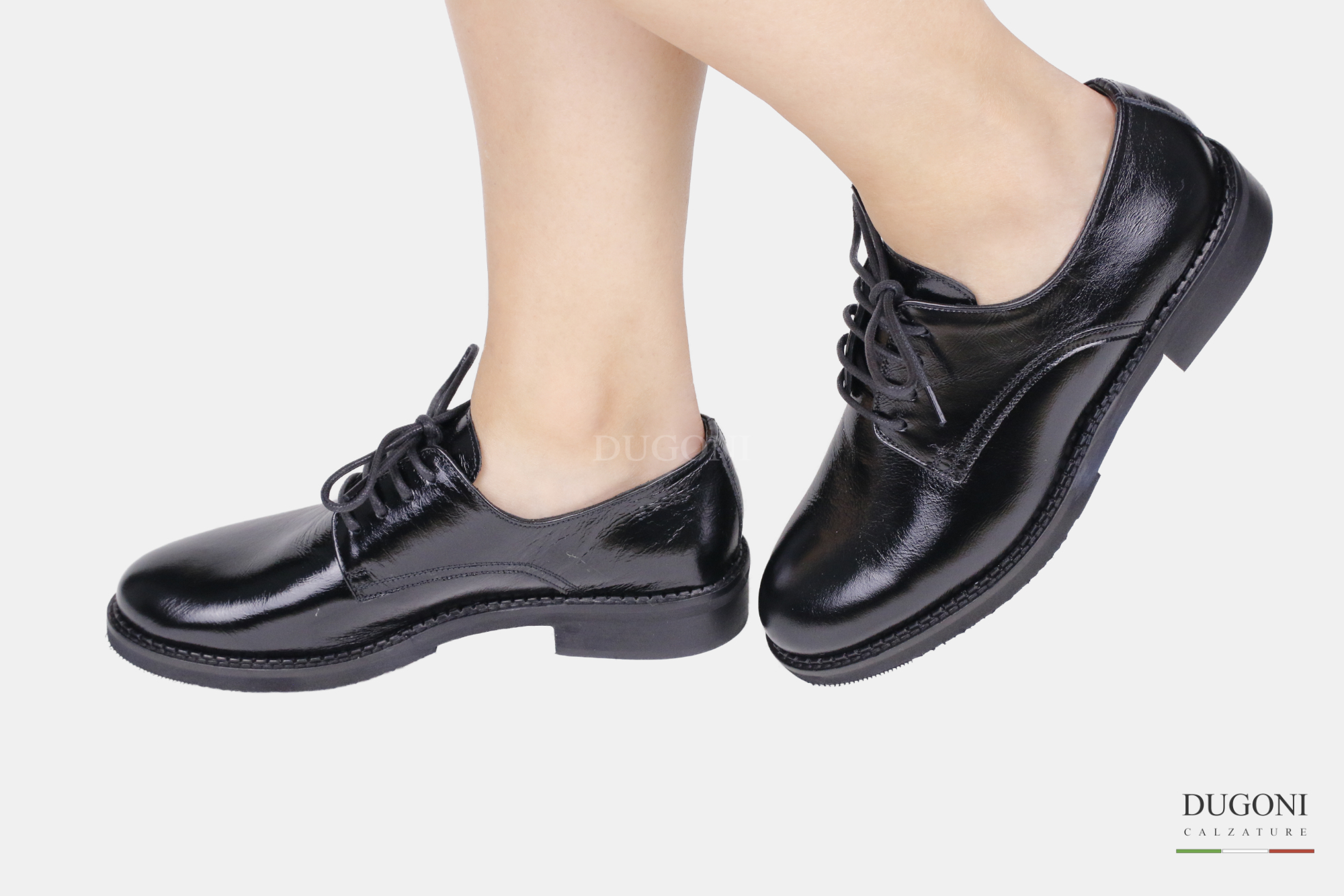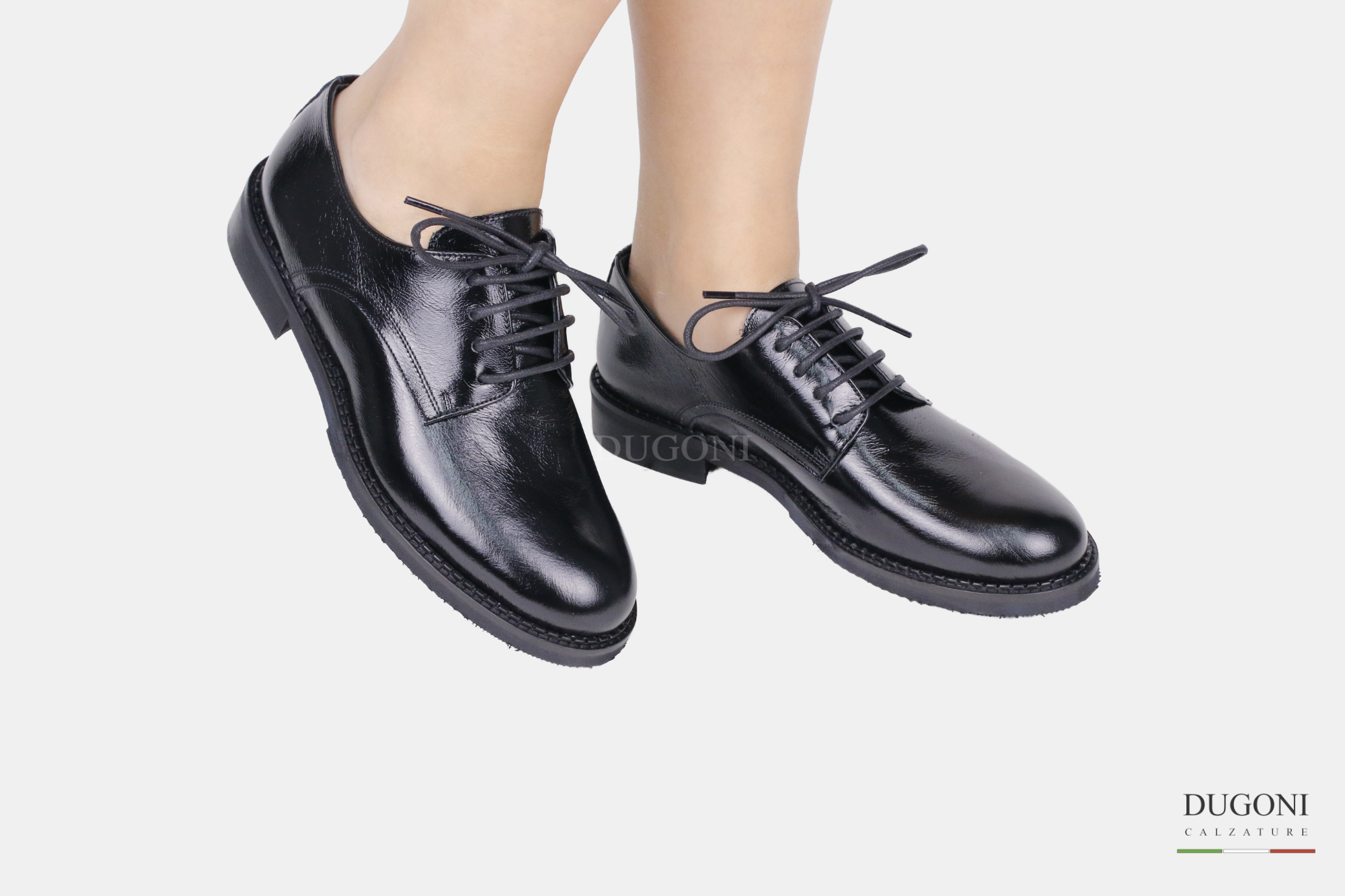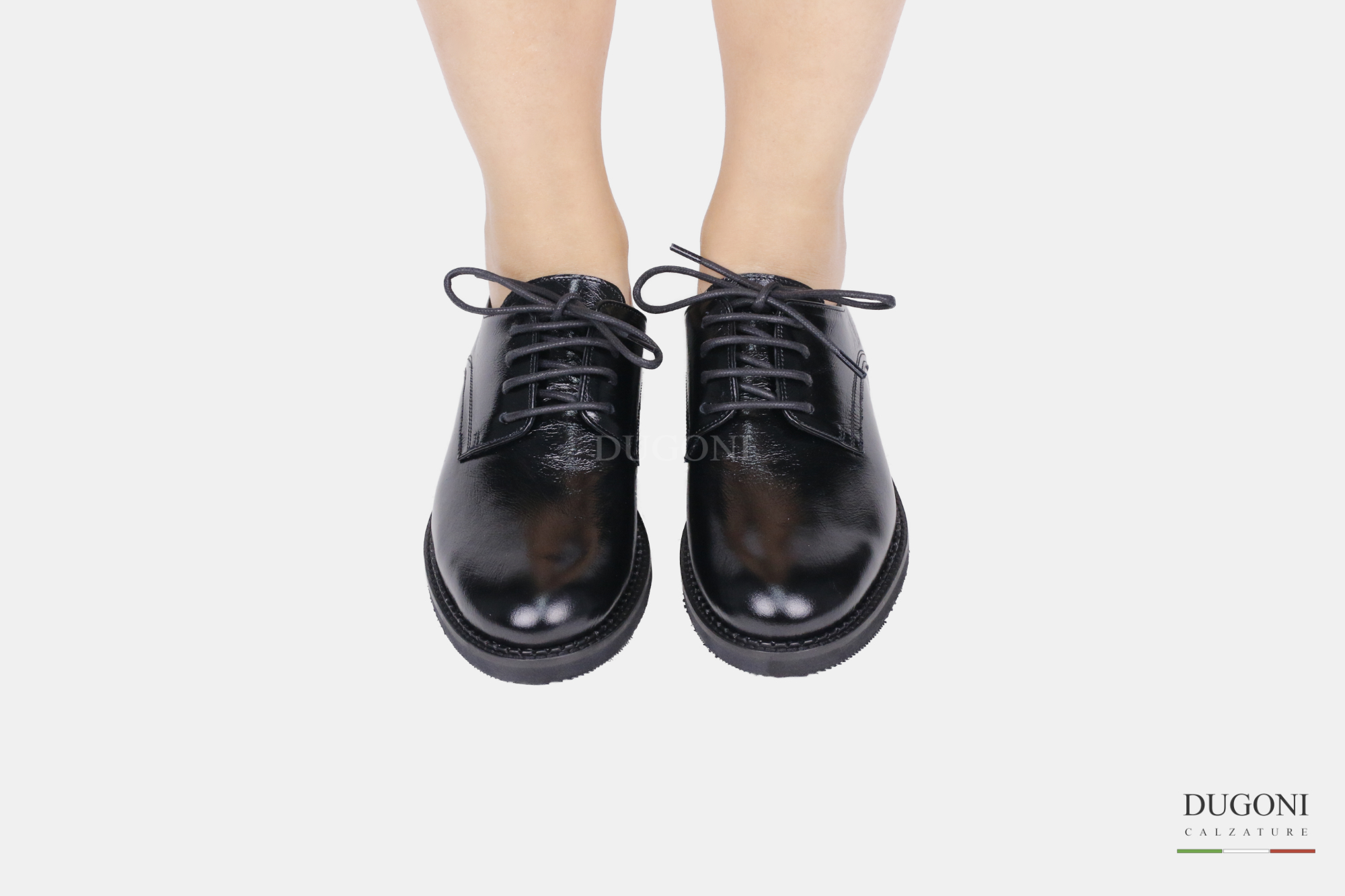 Stringata derby  in pelle  naplak nera . Fondo gomma extralight.