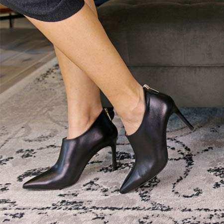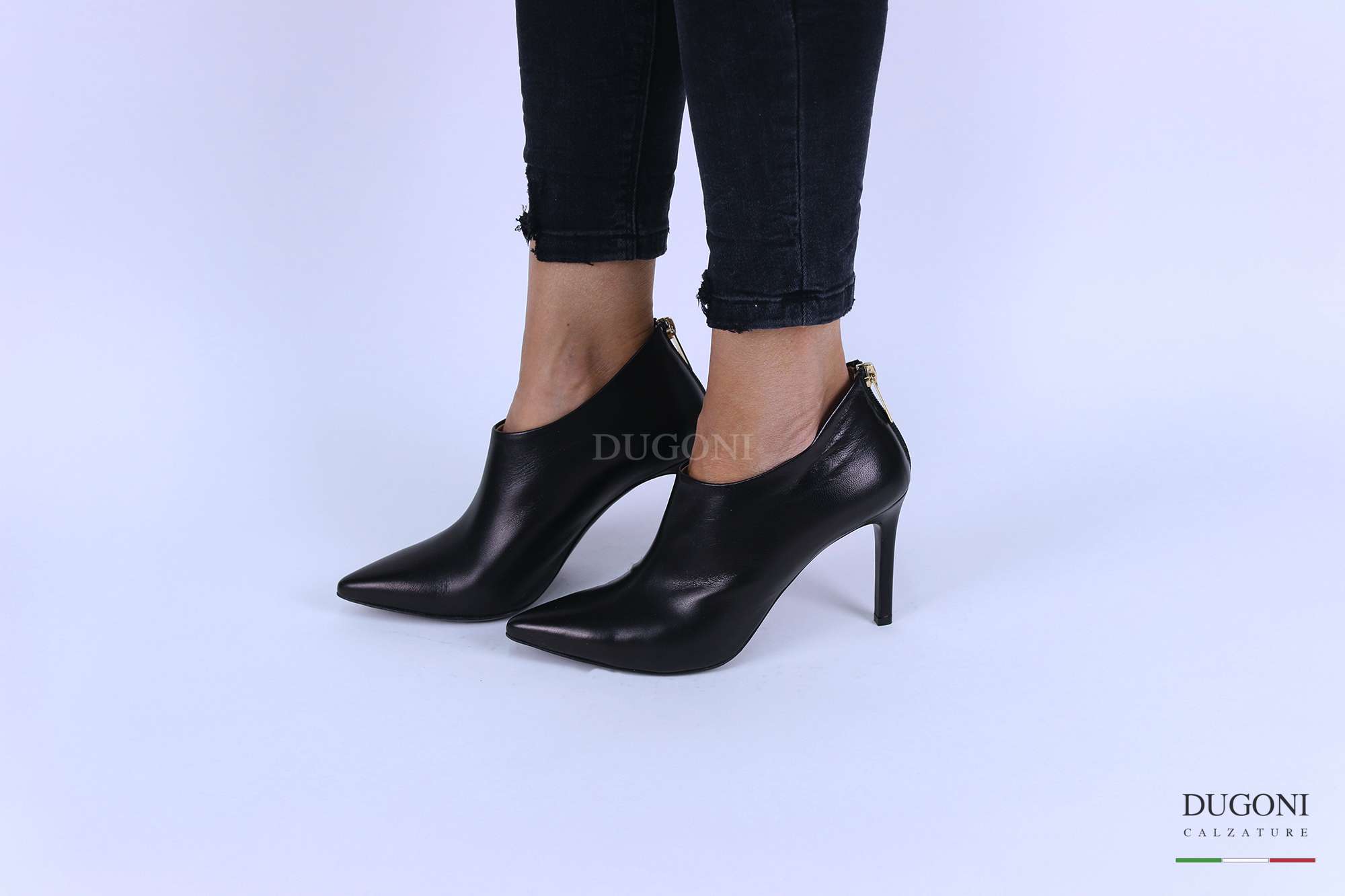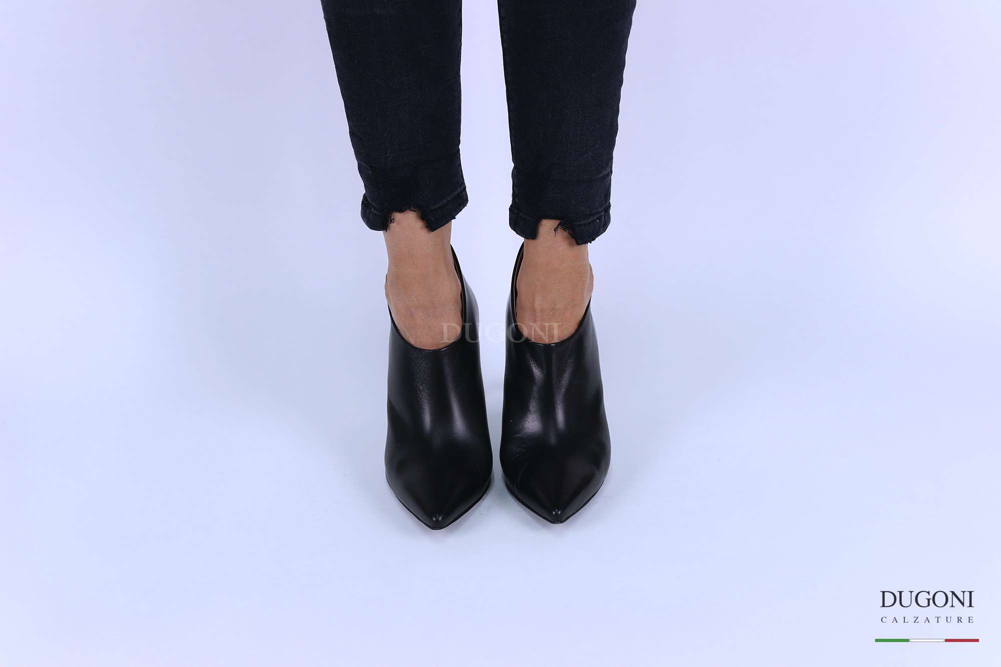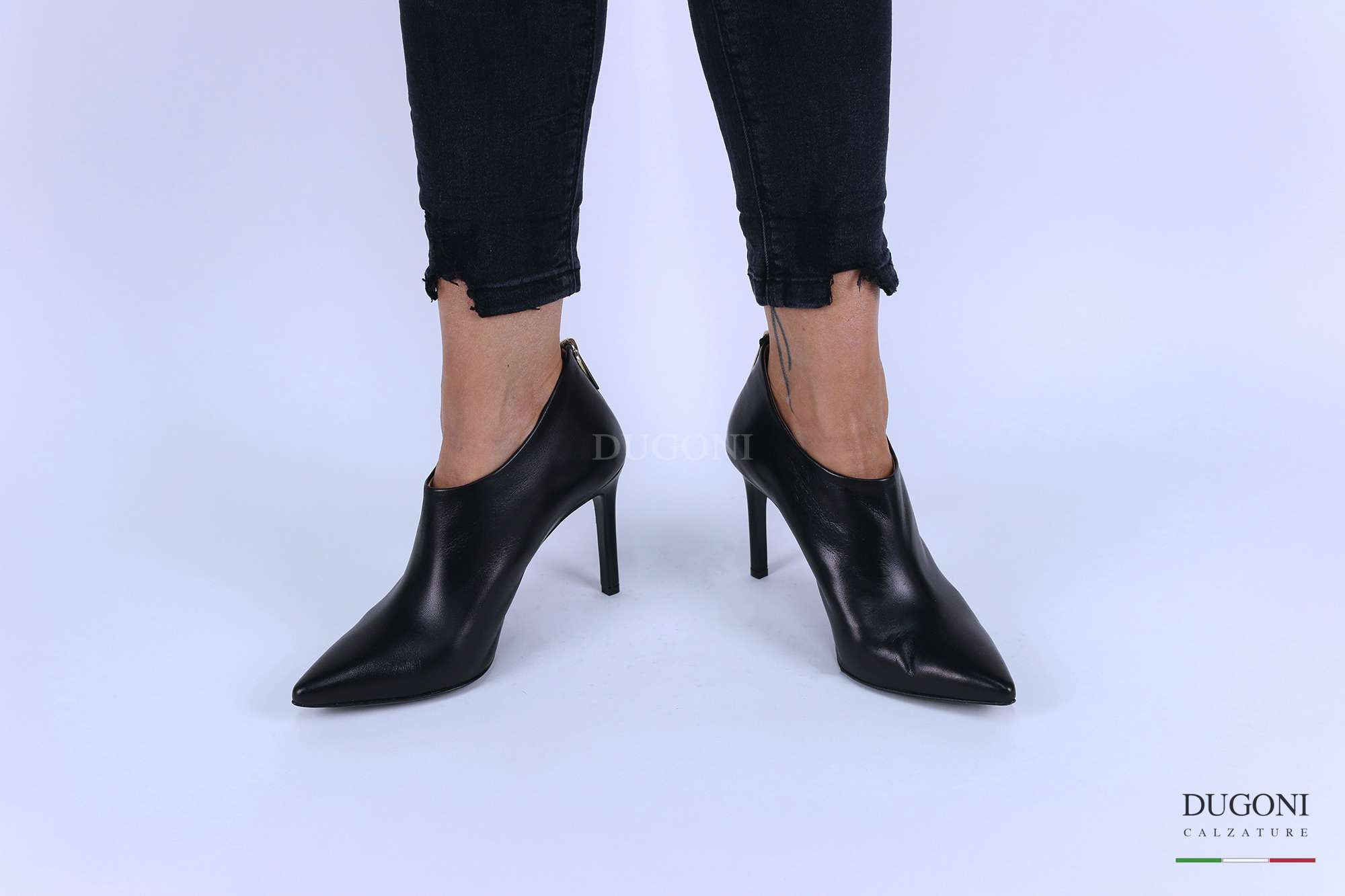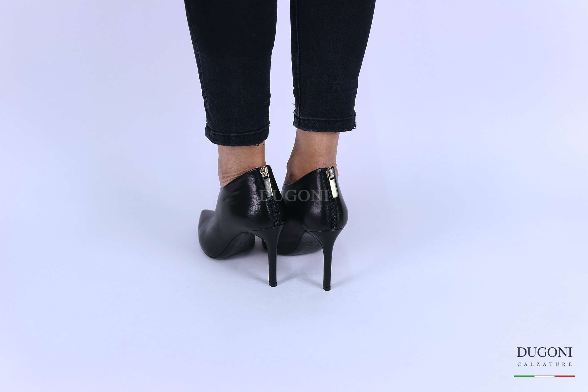 Tronchetto sfilato pariforma con scollo diagonale in pelle nera. Cerniera dorata posteriore.