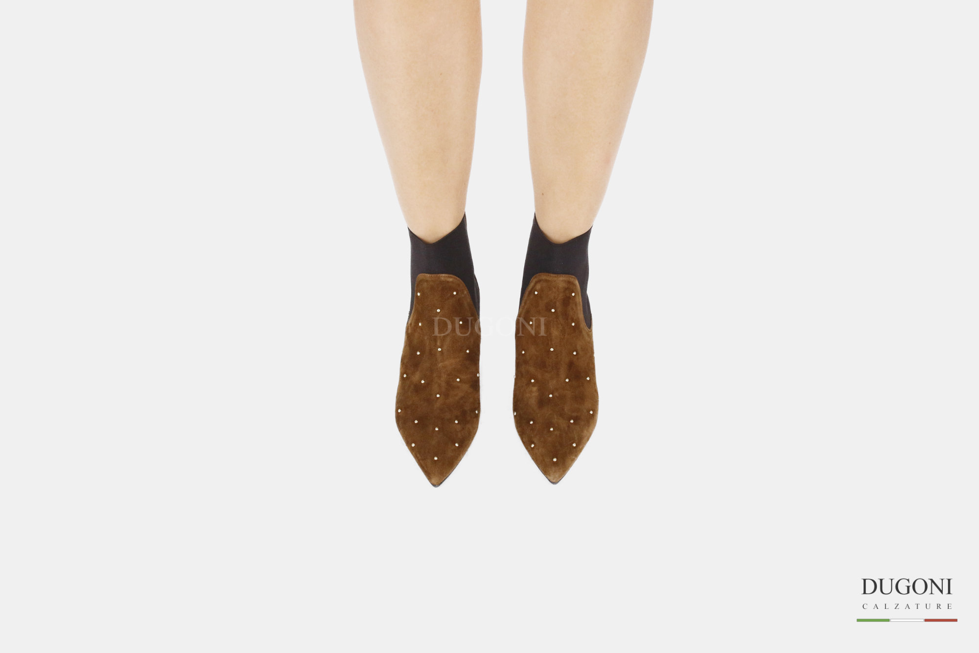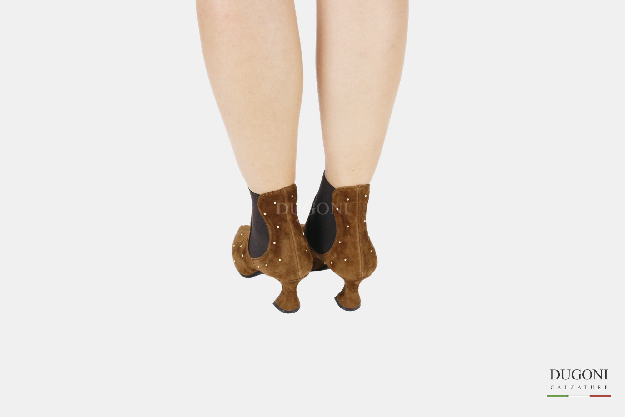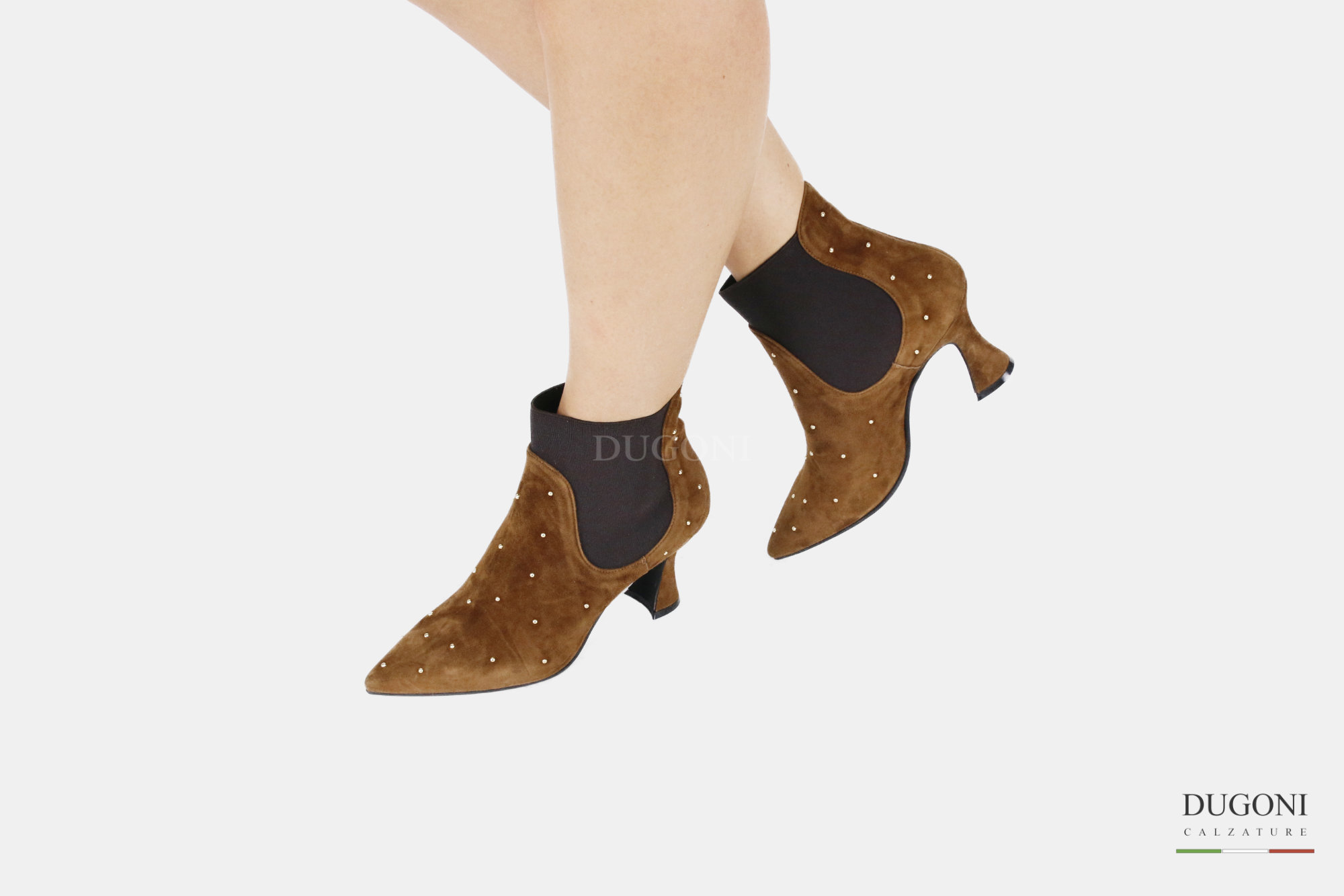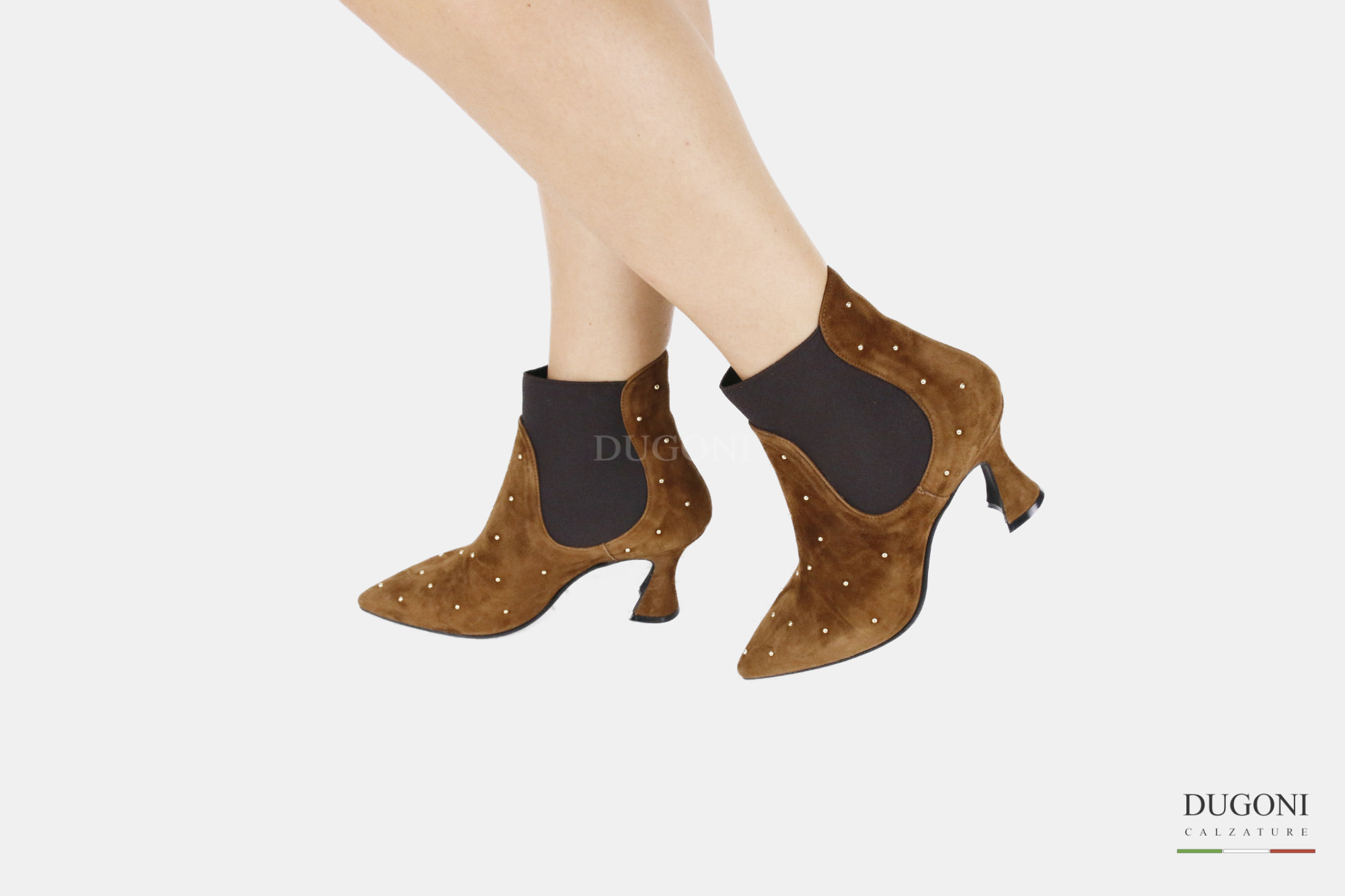 Tronchetto in camoscio sigaro ed elastico , con micro borchiette d’orate. Suola in gomma. Tacco a rocchetto ricoperto.