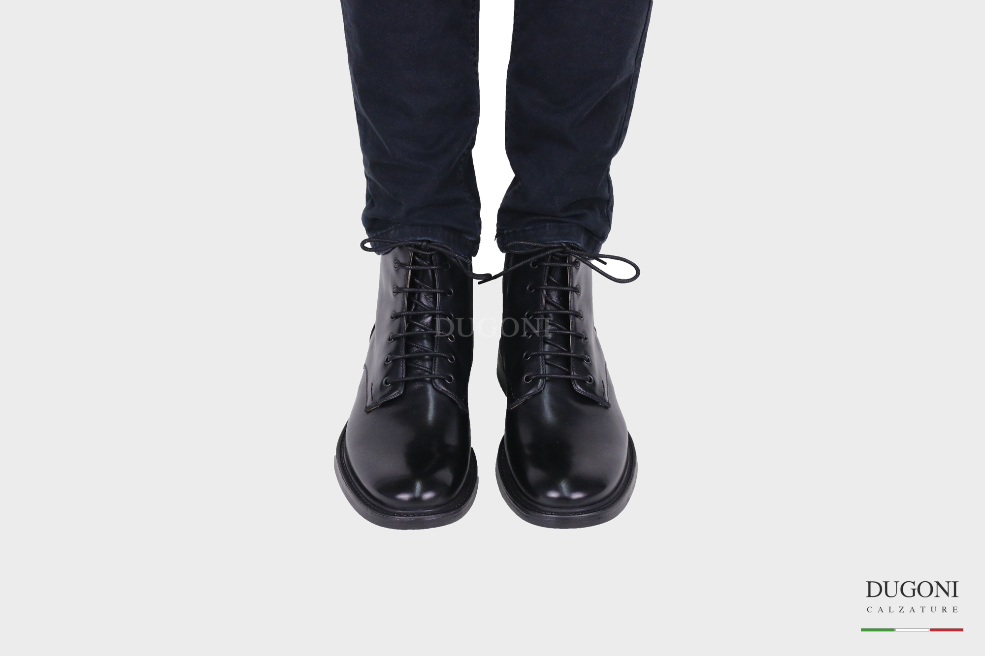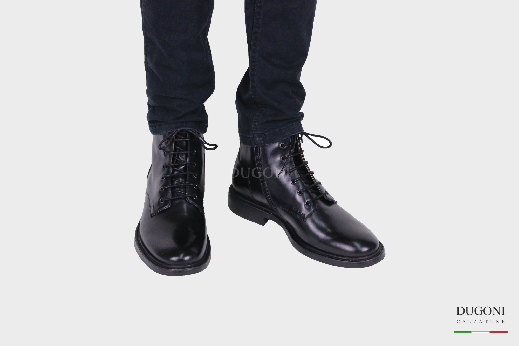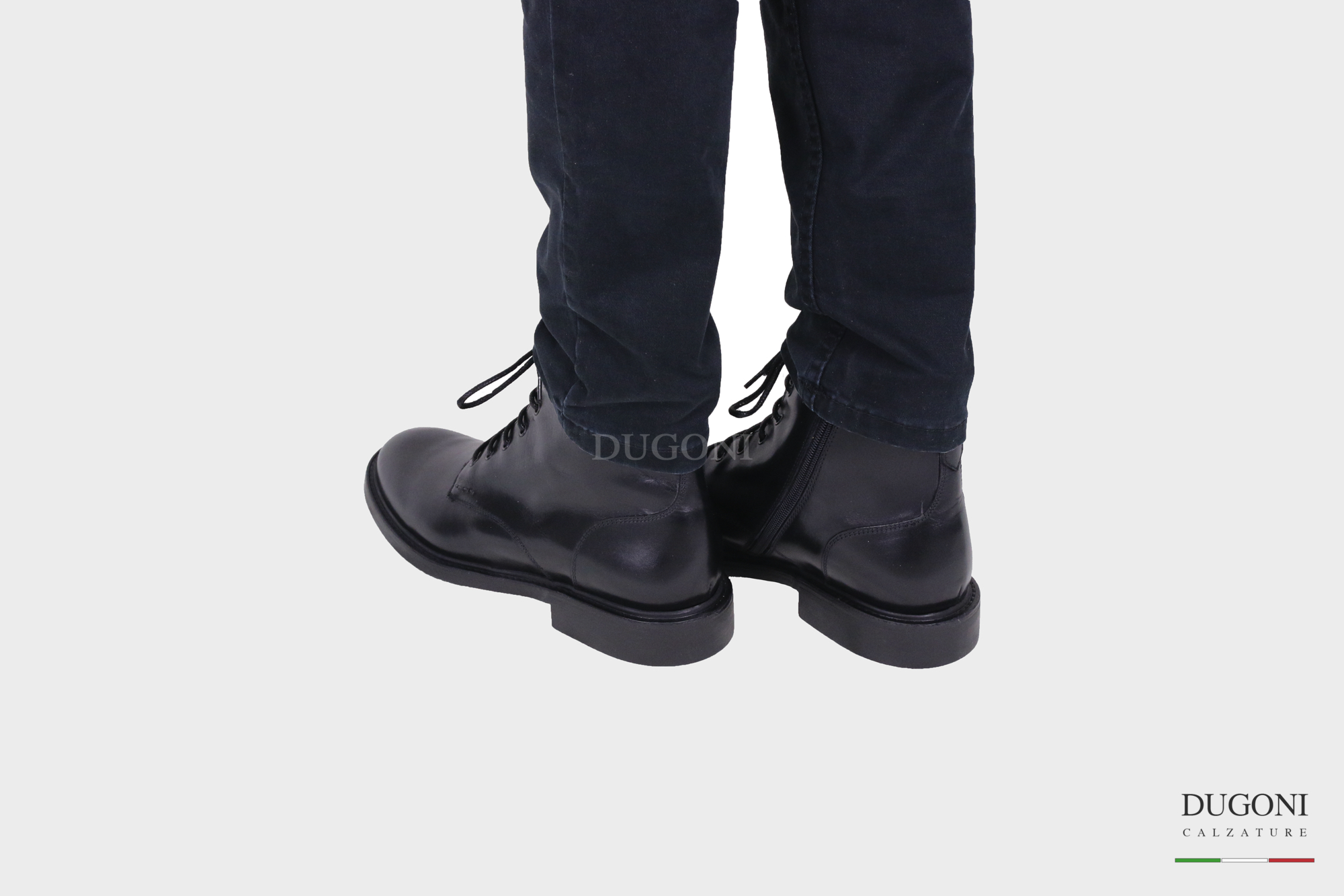 Anfibio in pelle di vitello liscio, colore nero. Cerniera interna. Suola cucita.