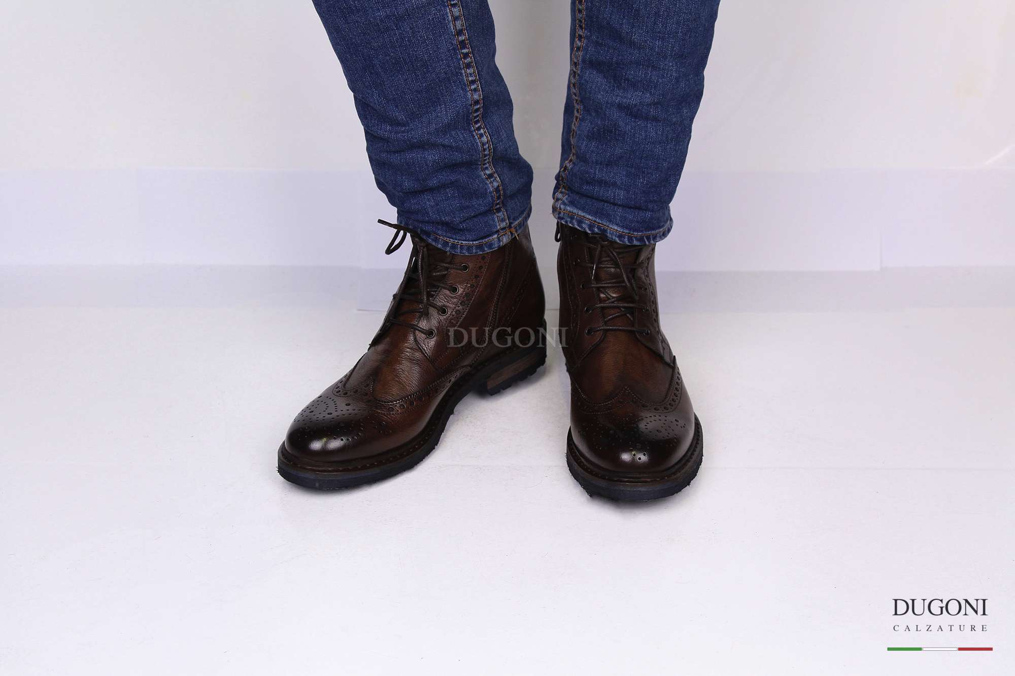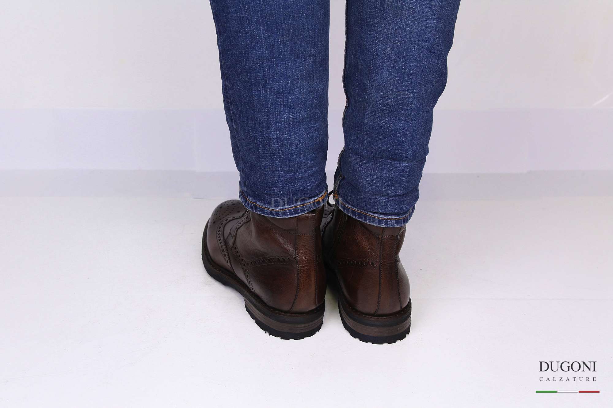 Stivaletto tipo anfibio in pelle marrone con lavorazione all’inglese. Cerniera interna.