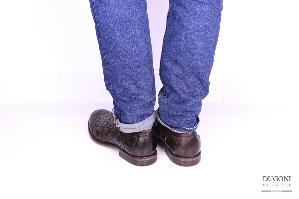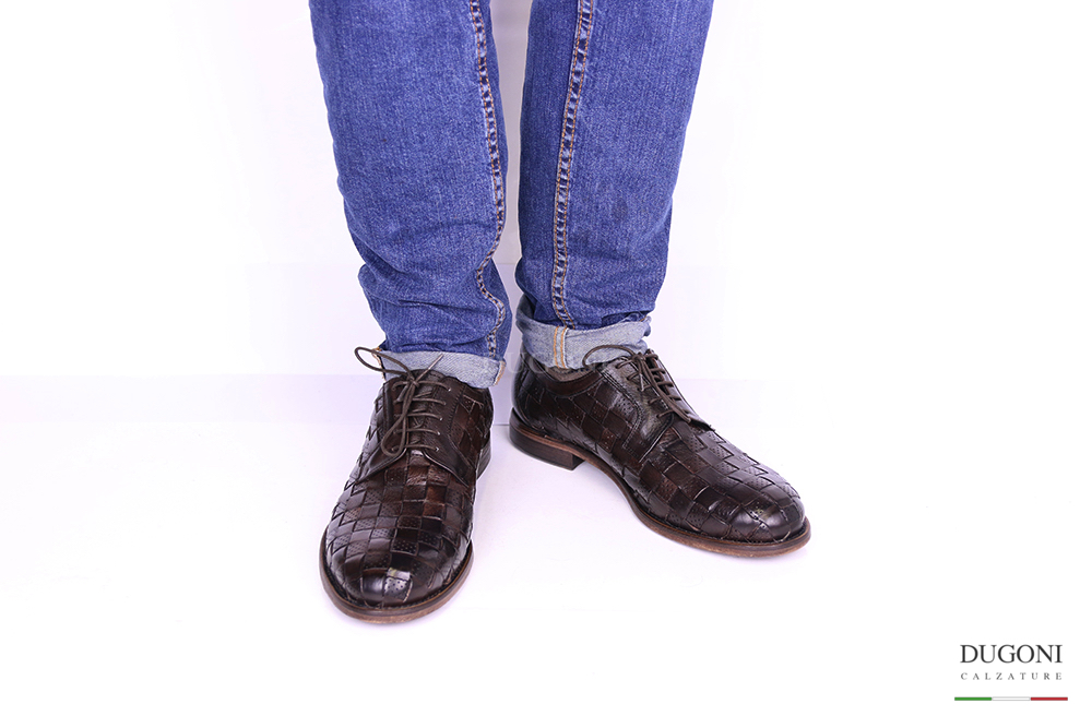Stringata con allacciatura derby in pelle intrecciata con microfori traspiranti. Lacci in tinta.