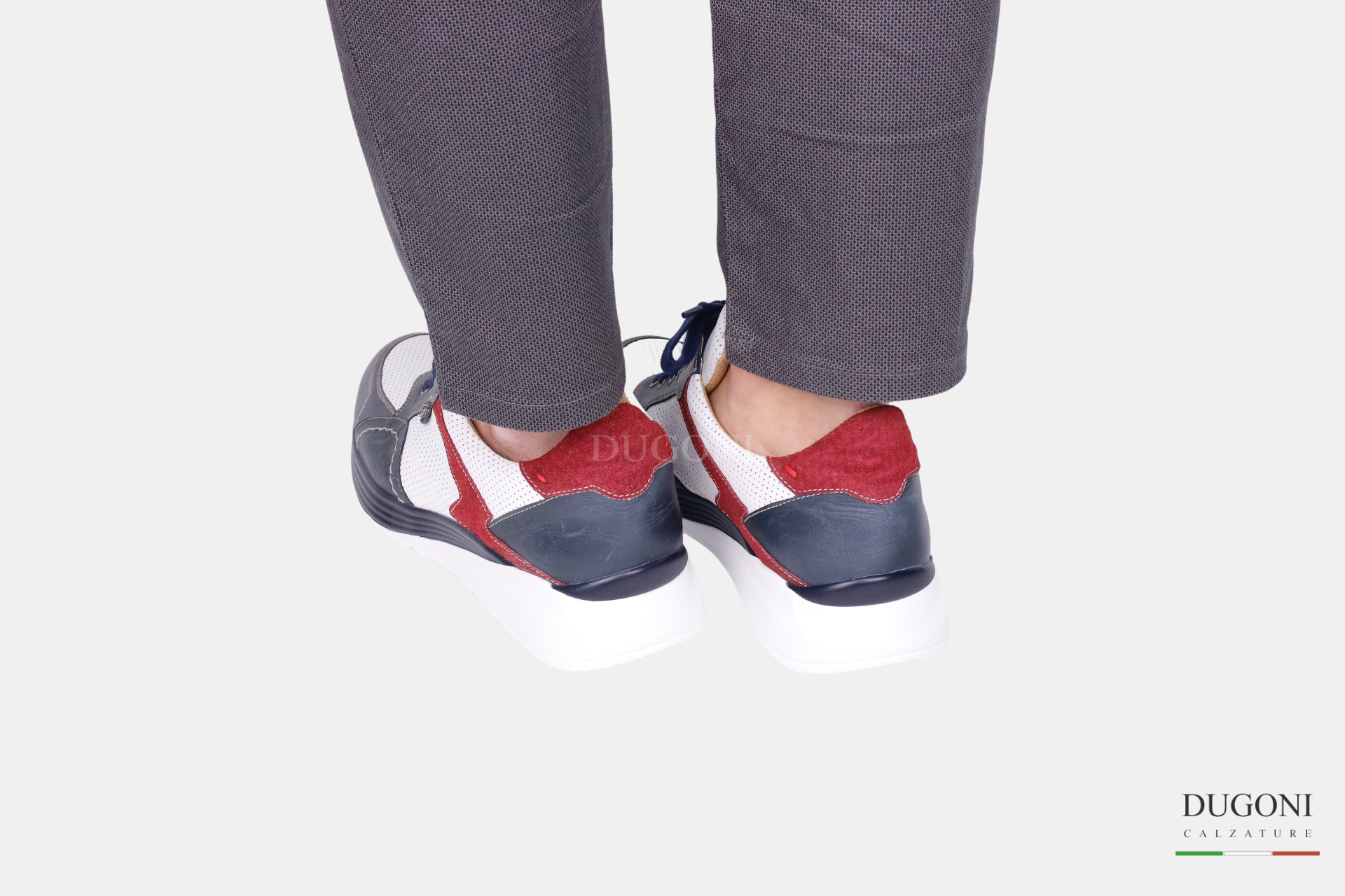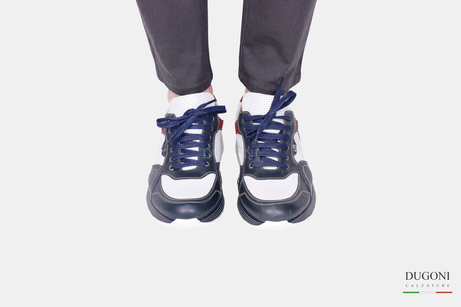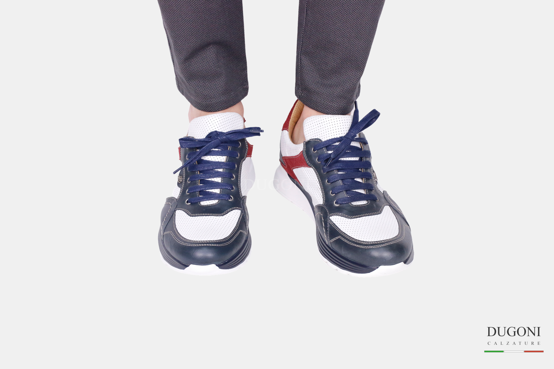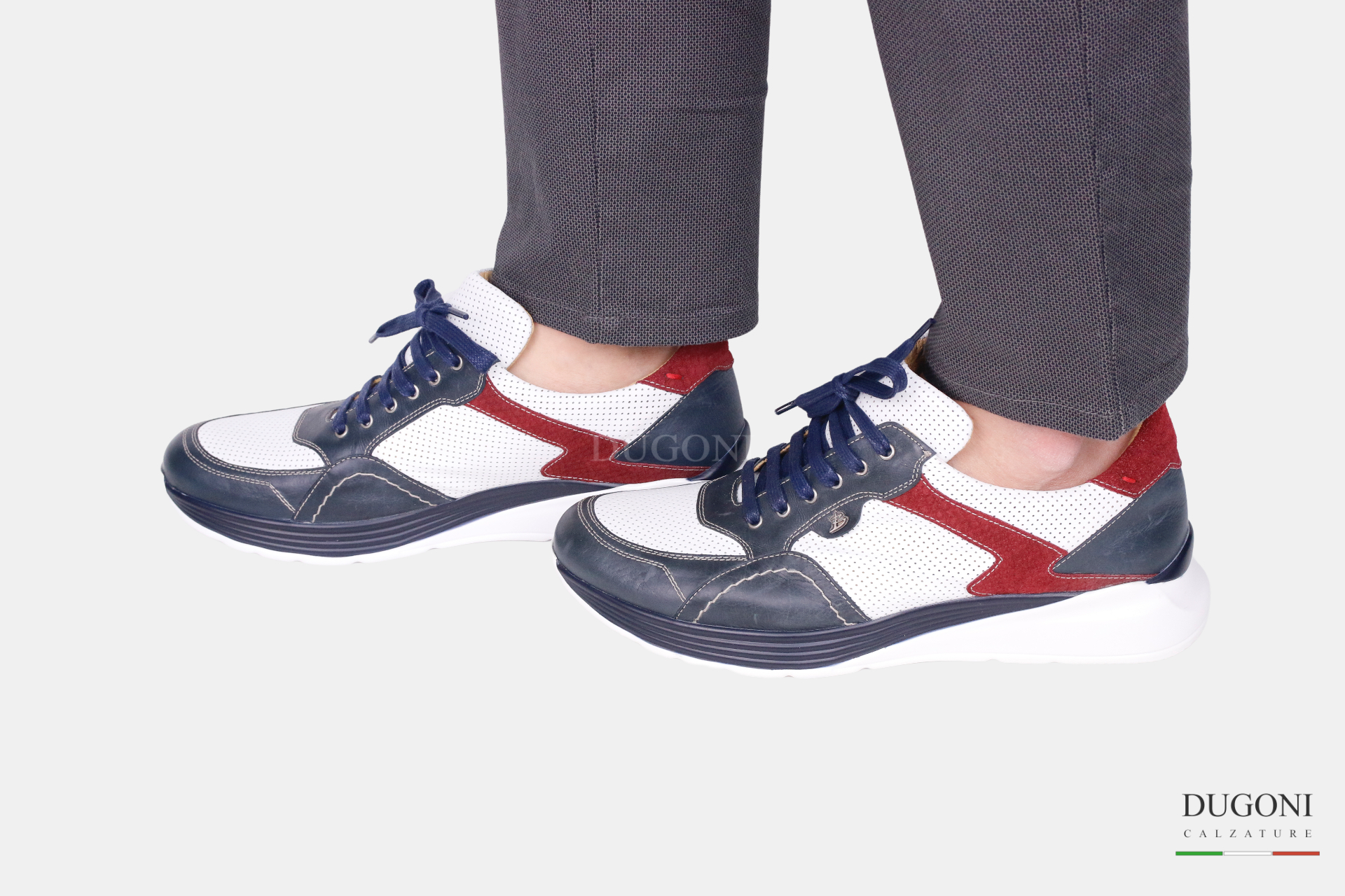 Sneakers stringata in pelle blu e bianca con dettagli rossi. Allacciatura francesina con lacci bordeaux. Pelle microforata.