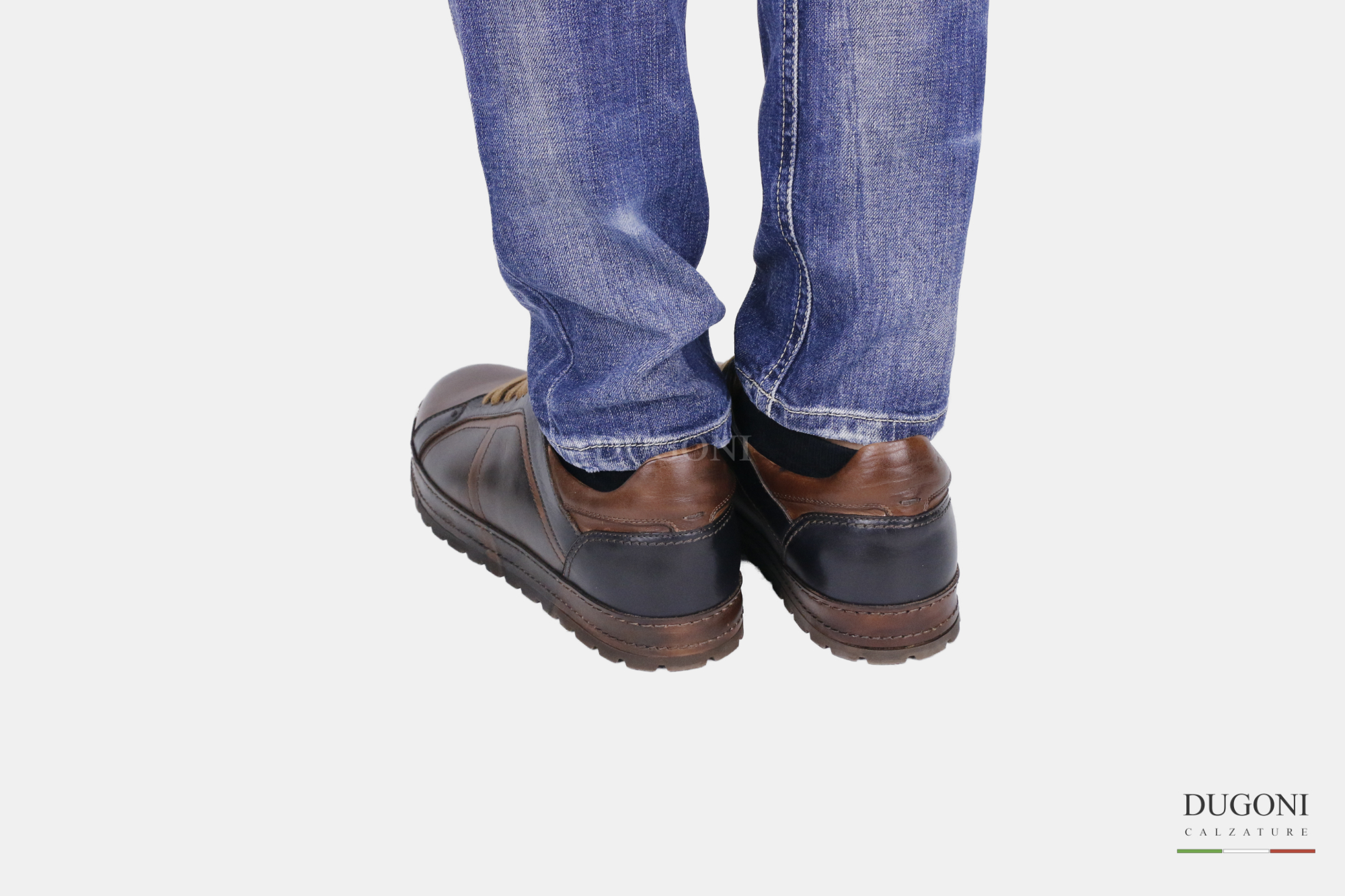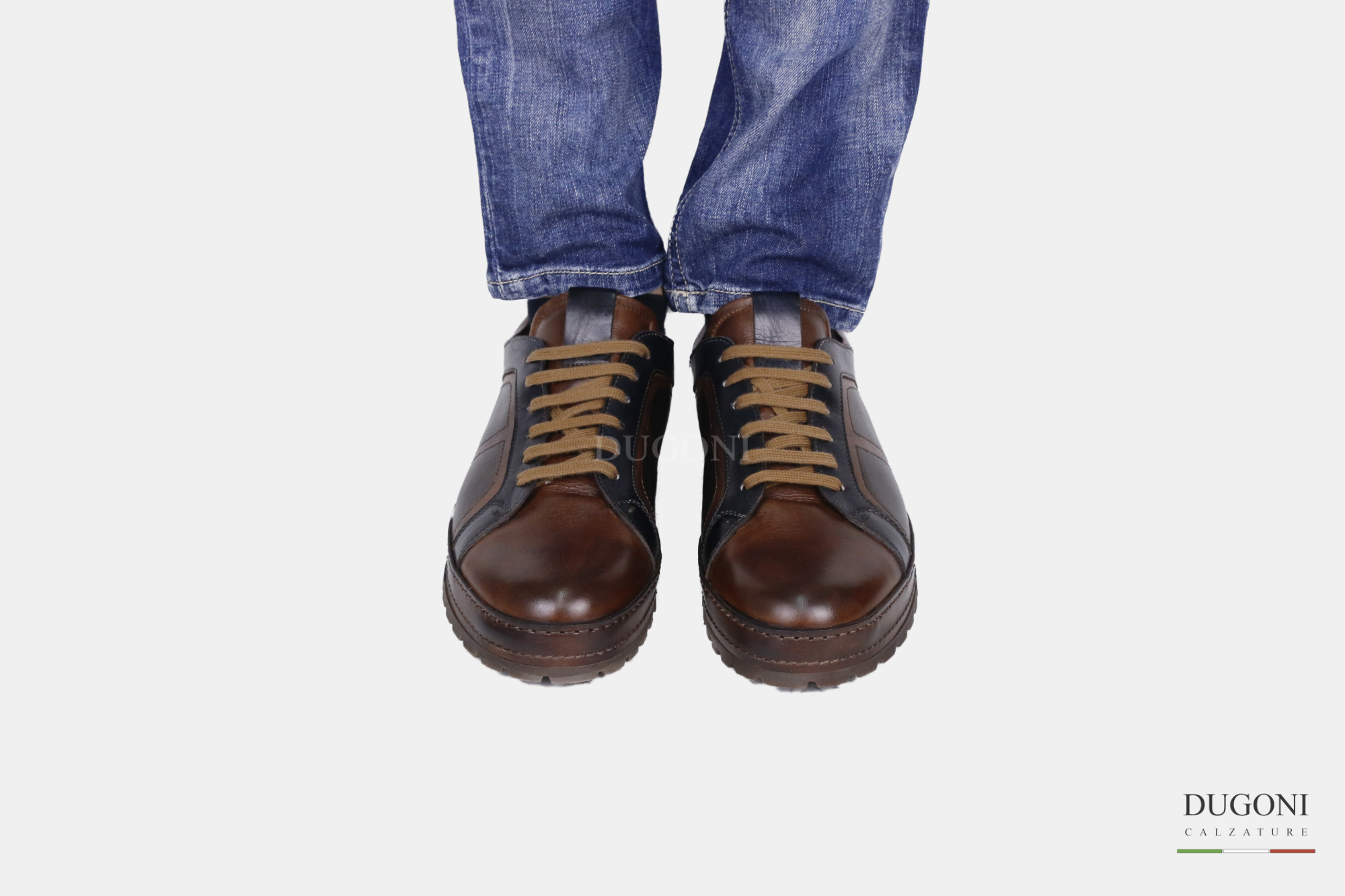 Sneakers in pelle bicolor marrone e blu con allacciatura a 6 fori. Plantare estraibile. Fondo a cassetta ricoperto pelle con cuciture in tinta.
