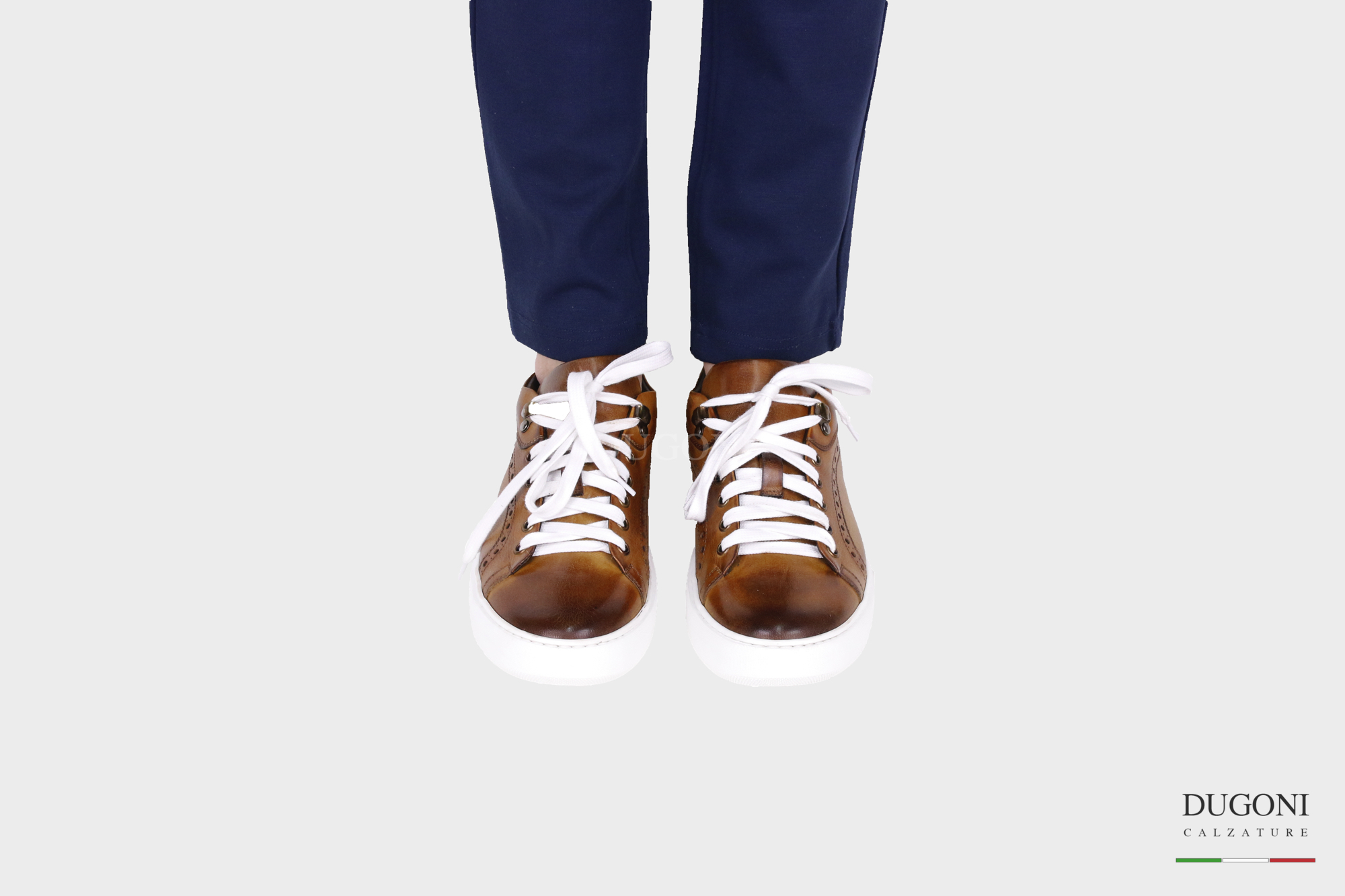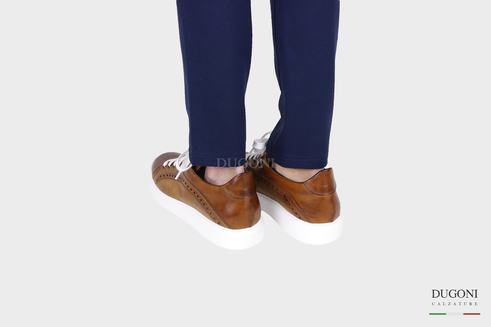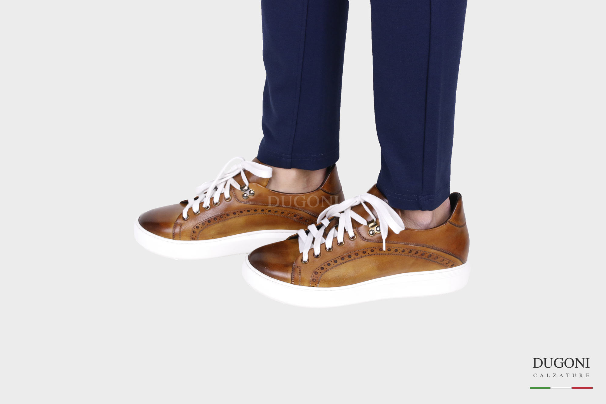 Sneakers marrone chiaro con sfumature e dettagli in microforo. Suola e lacci bianchi a contrasto.