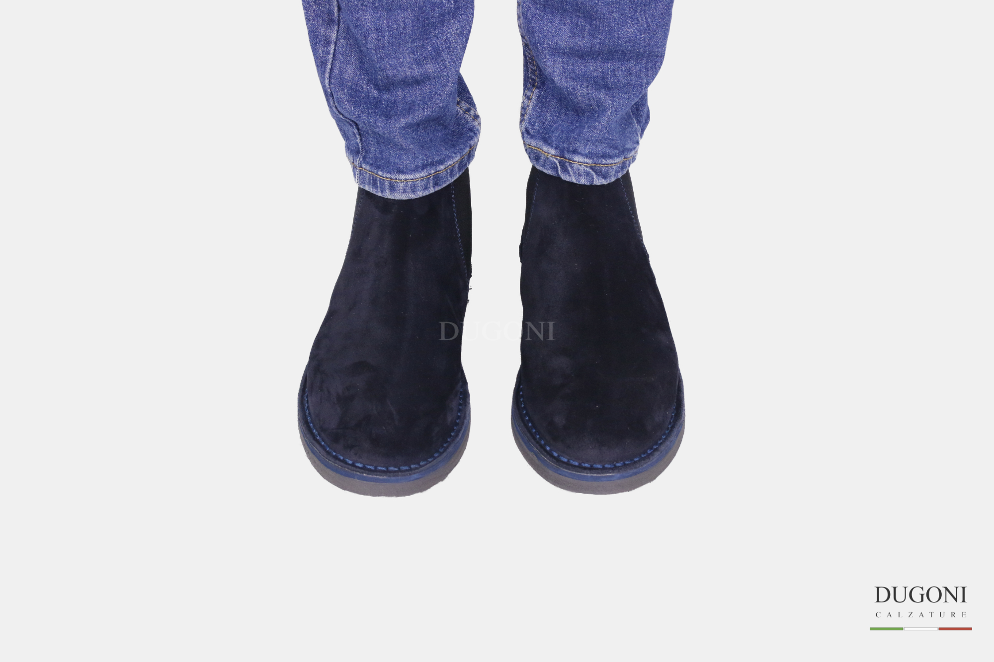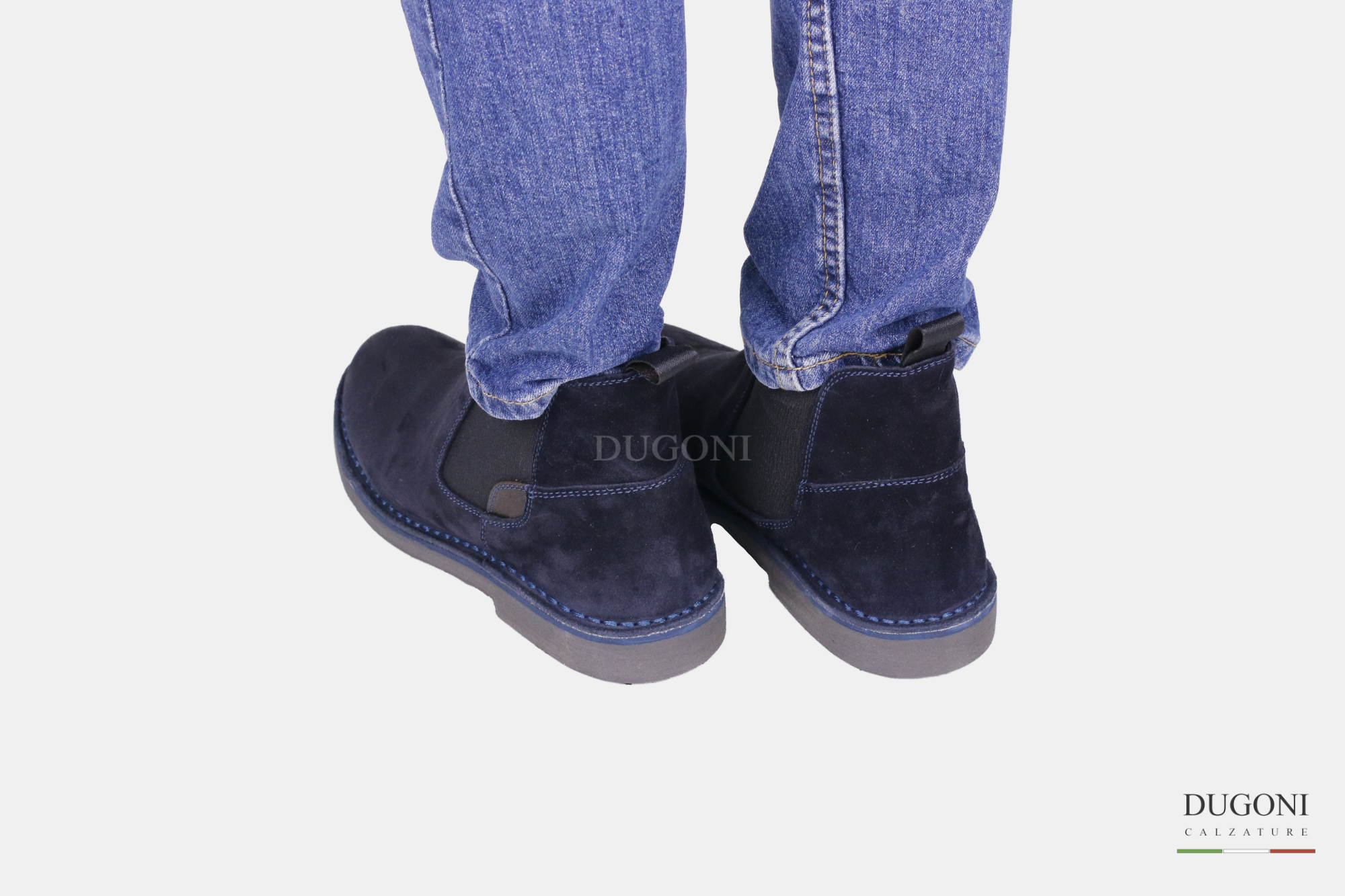 Stivaletto in camoscio blu con due elastici laterali. Lavorazione ideal.