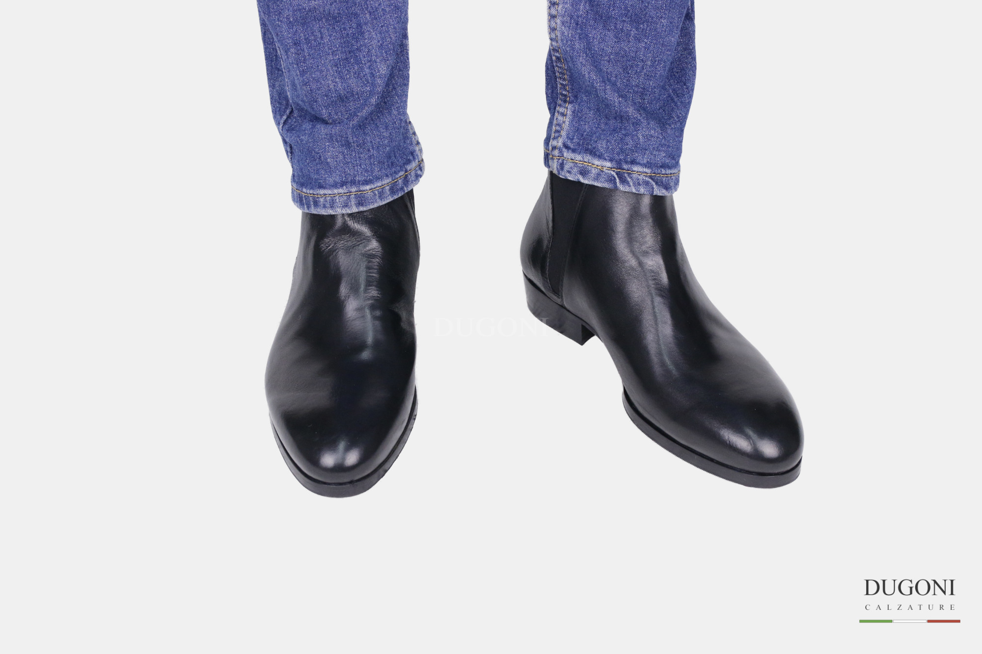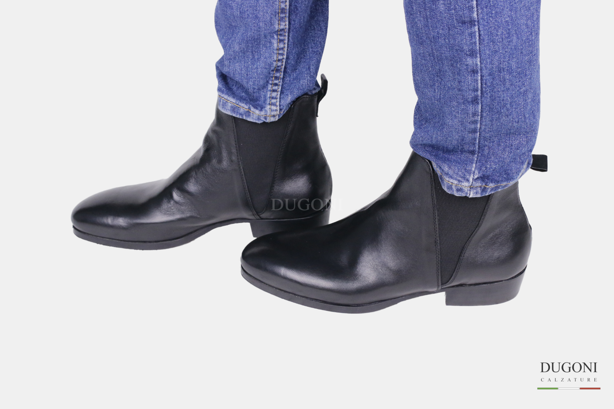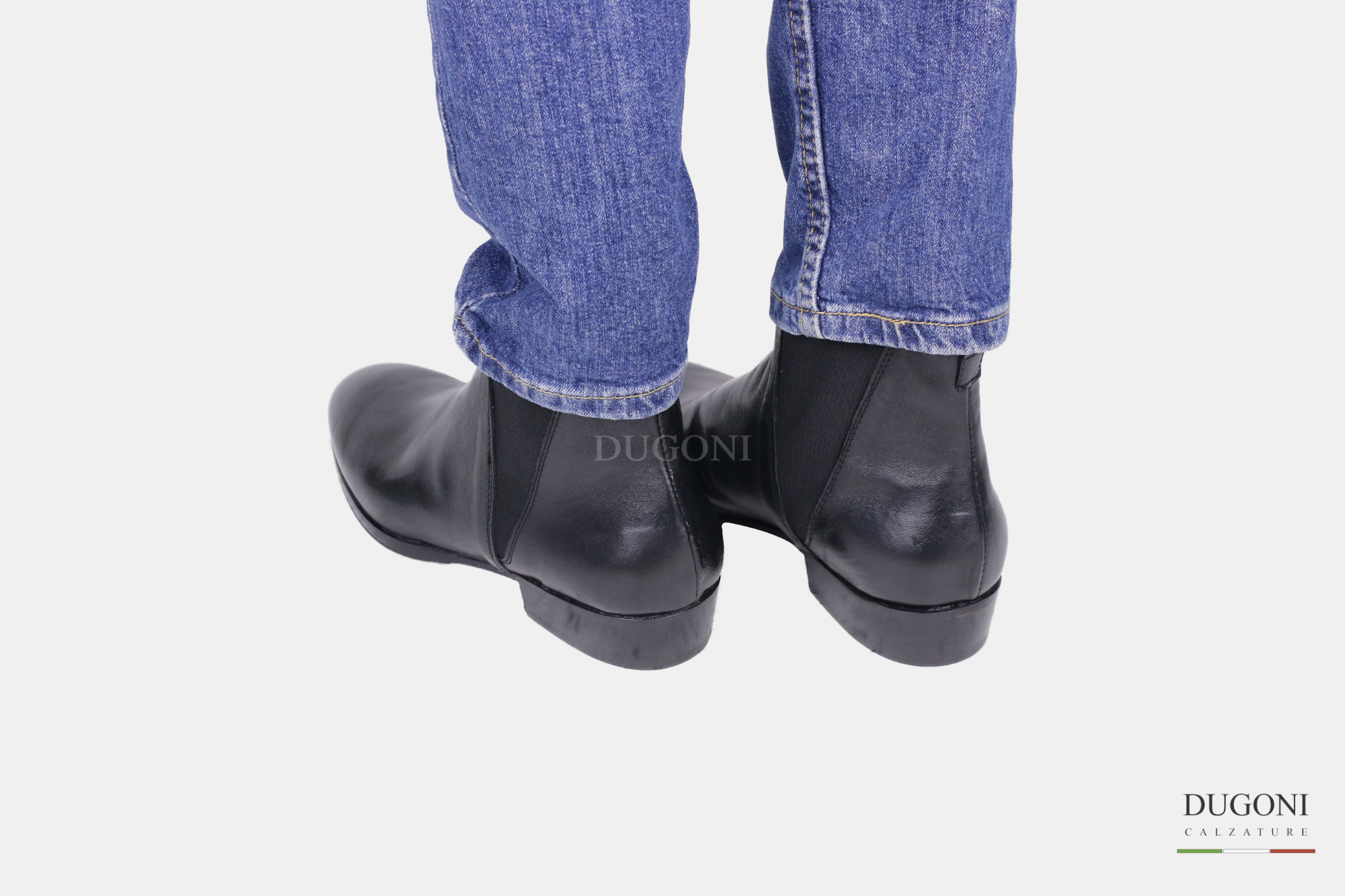 Stivaletto texano in pelle nera con elastici. Fondo cuoio mezza gomma.