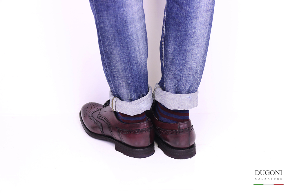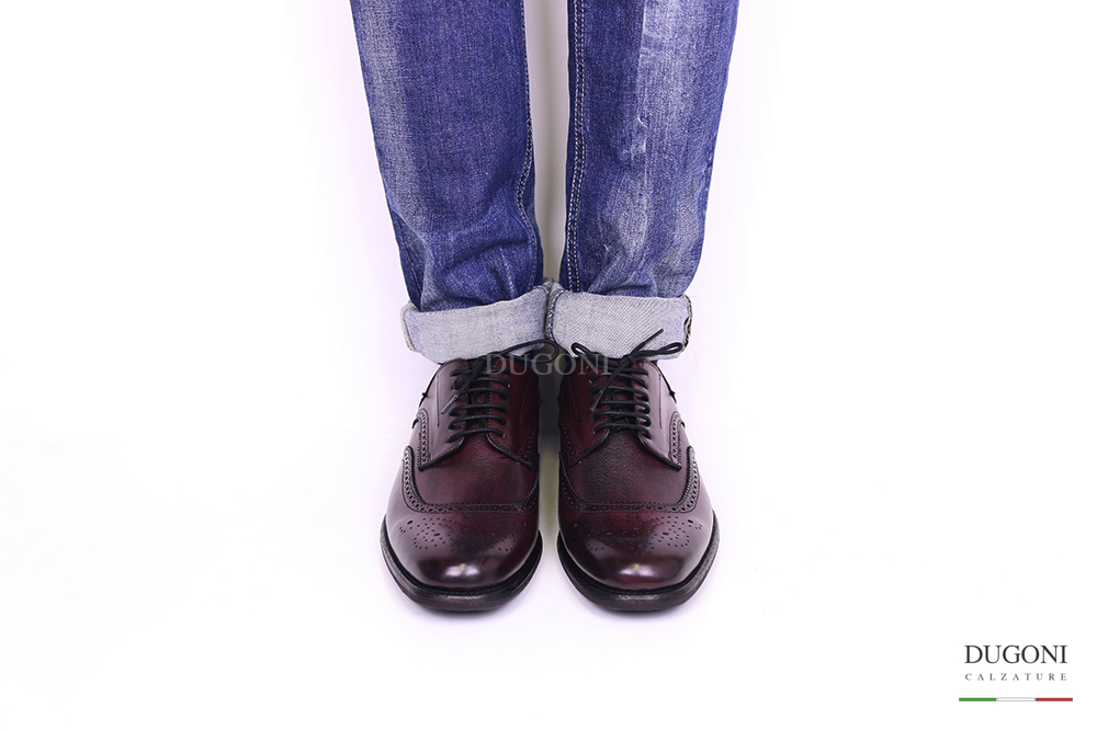 Stringata in pelle di vitello liscia ed abbattuta bordeaux. Tomaia decorata da bucature e frastagli e fantasia a coda di rondine in punta. Allacciatura derby a cinque fori.