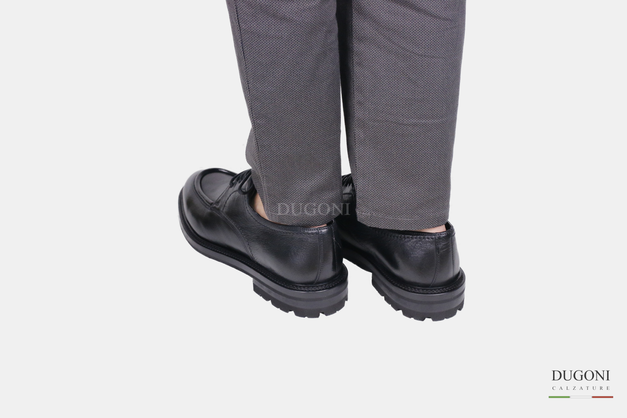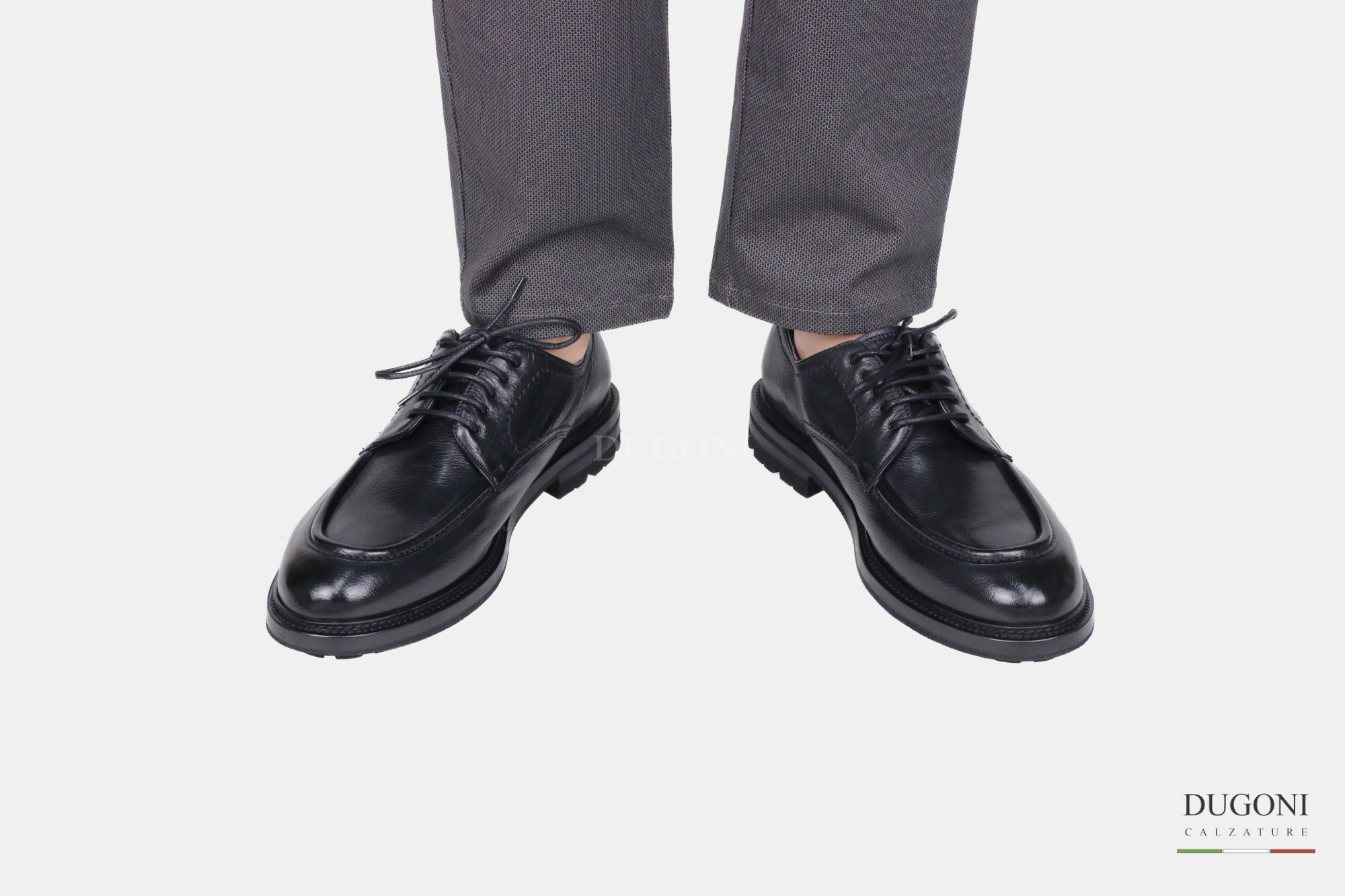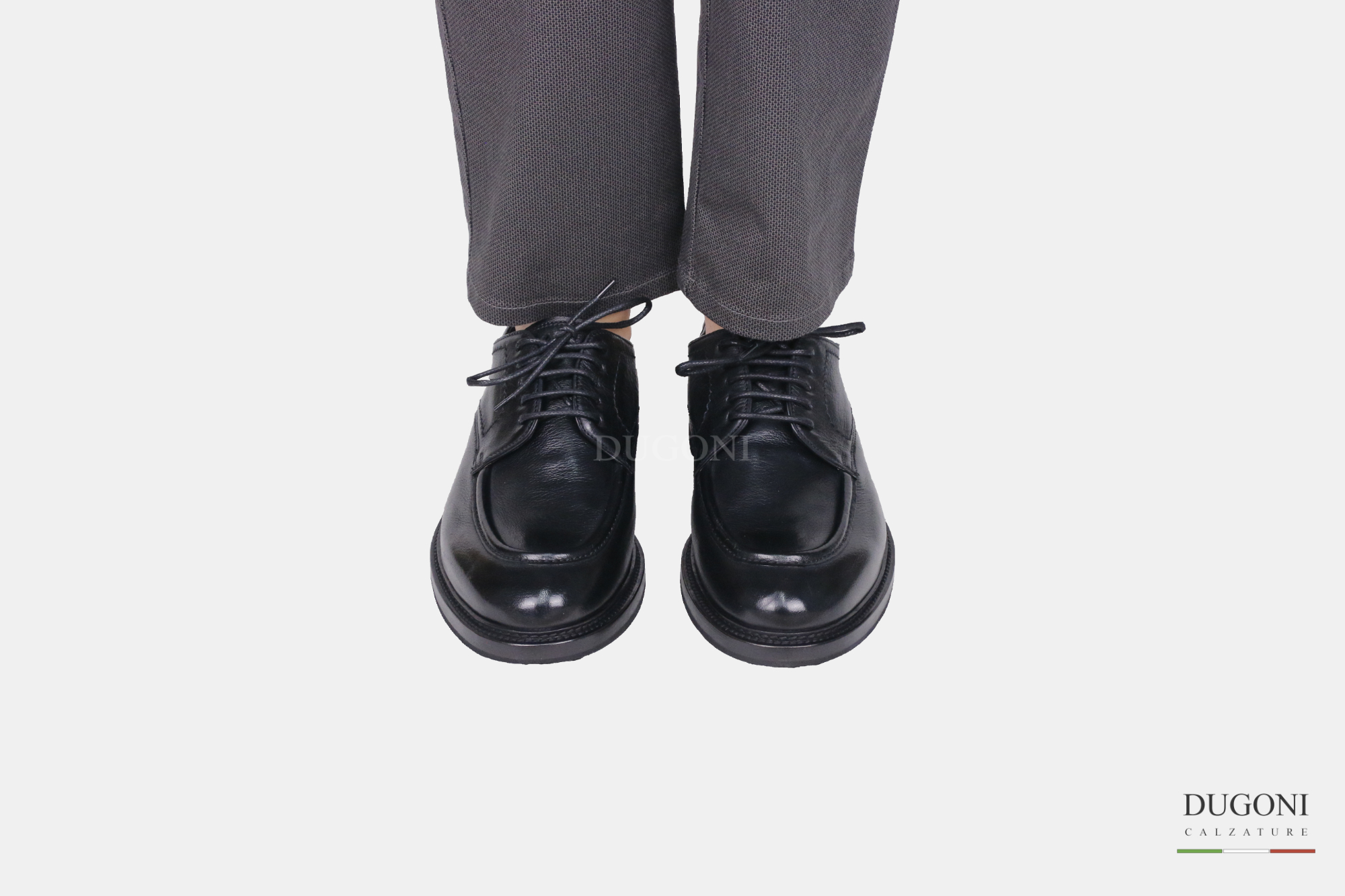 Stringata in pelle nera a cinque fori. Cuciture in tinta . Suola cuoio e gomma cucita.