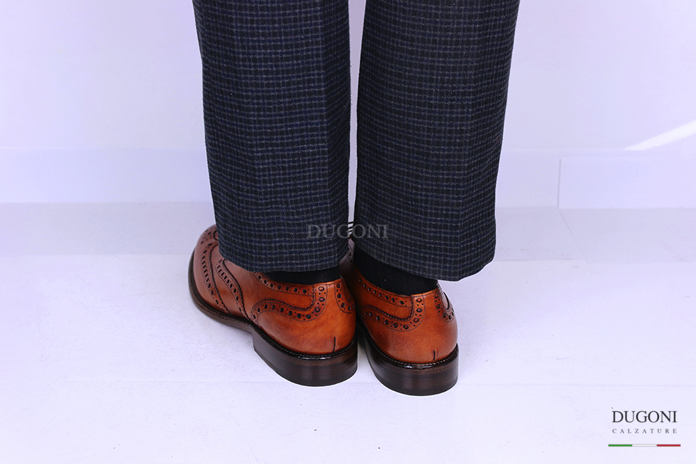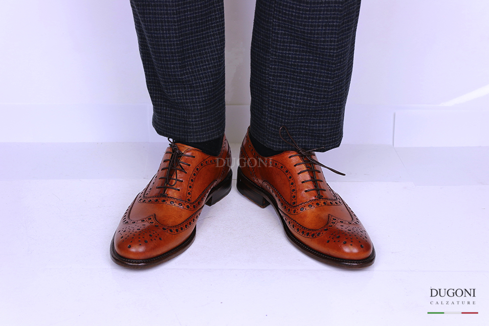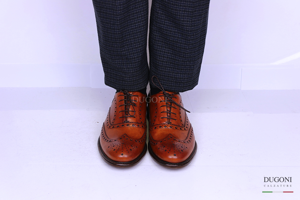 Stringata in pelle marrone chiaro. Lavorazione all’inglese con coda di rondine e fiore sulla punta. Allacciatura francesina a 5 fori. Fondo cuoio.